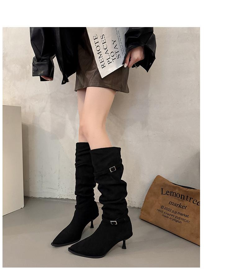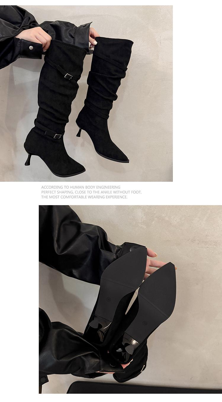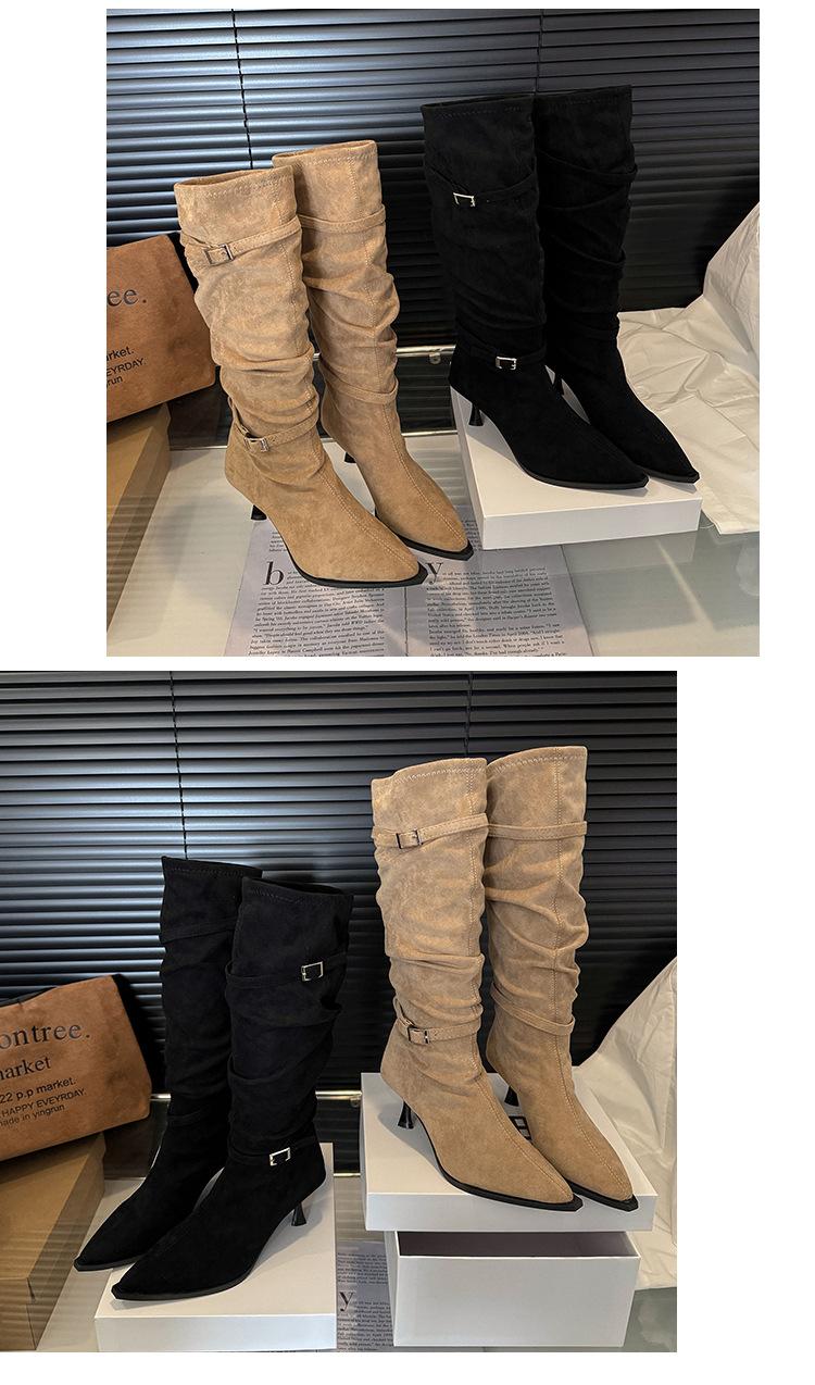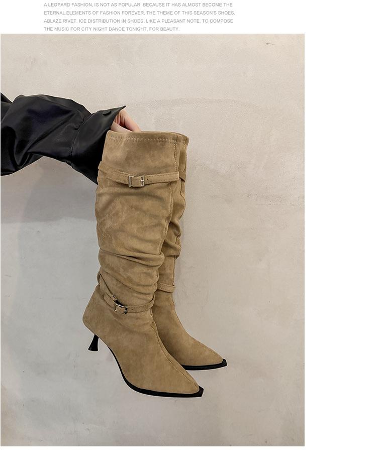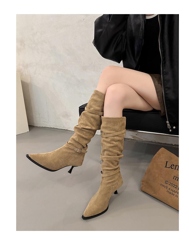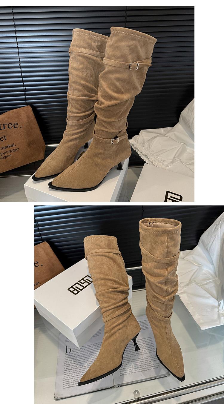 Botas Largas de Moda Punta Afilada Tacón de Aguja Hebilla Fruncidas Apiladas Mujer 2025 Otoño Nuevo Temperamento Adelgazantes Botas de Tacón Alto