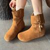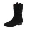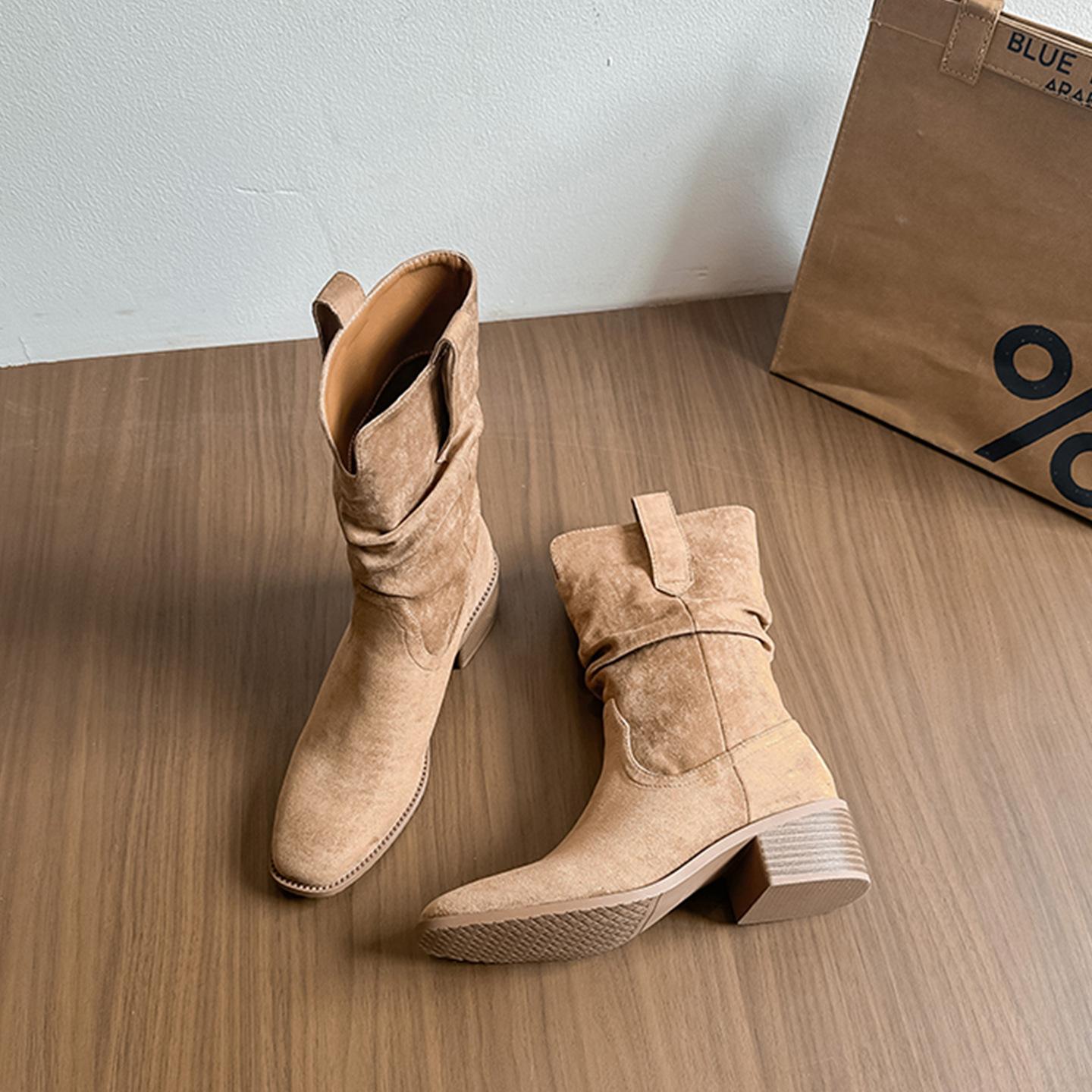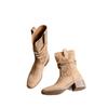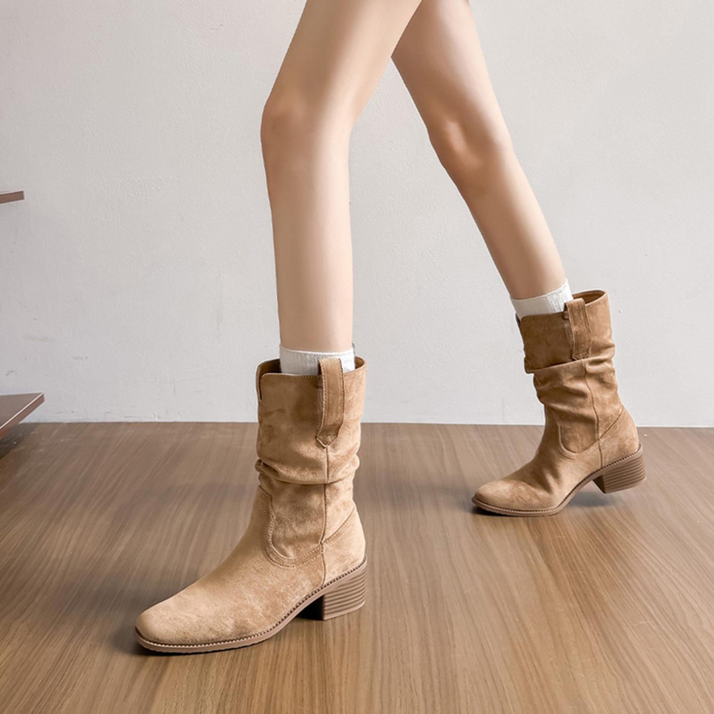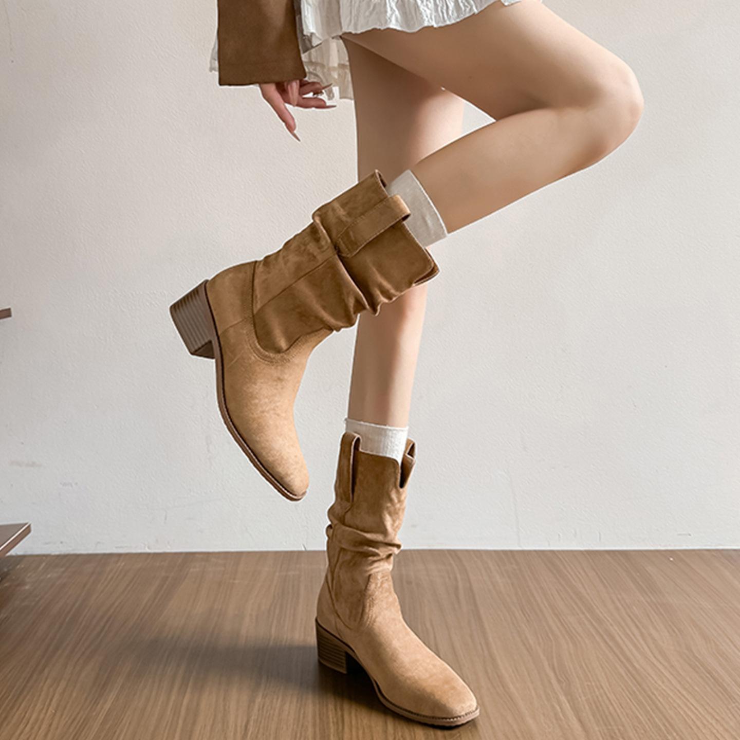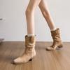 ¡Versión de Cuero Suave! Botines Fruncidos Occidentales para Mujer Botas Apiladas Estilo Británico Vintage Altura Petite Aumentando Media Pantorrilla Botas Martin