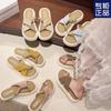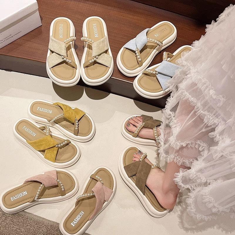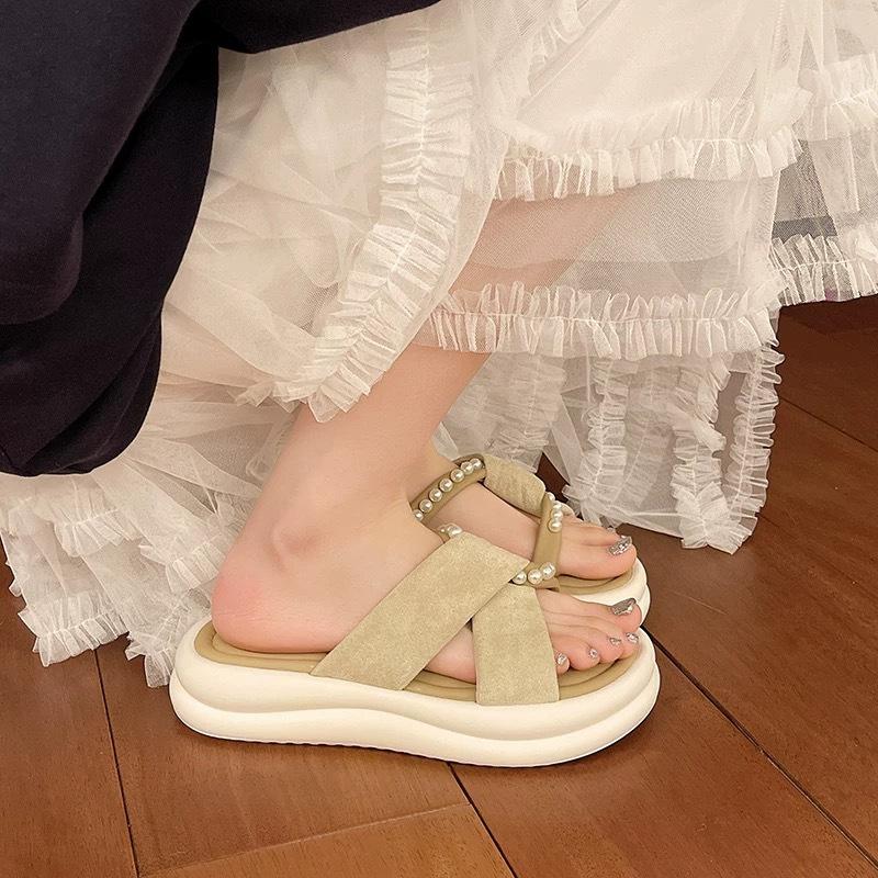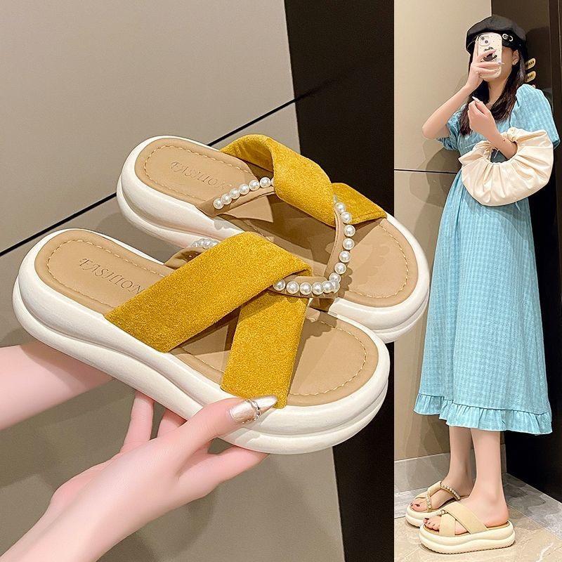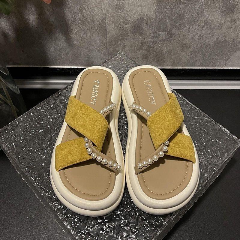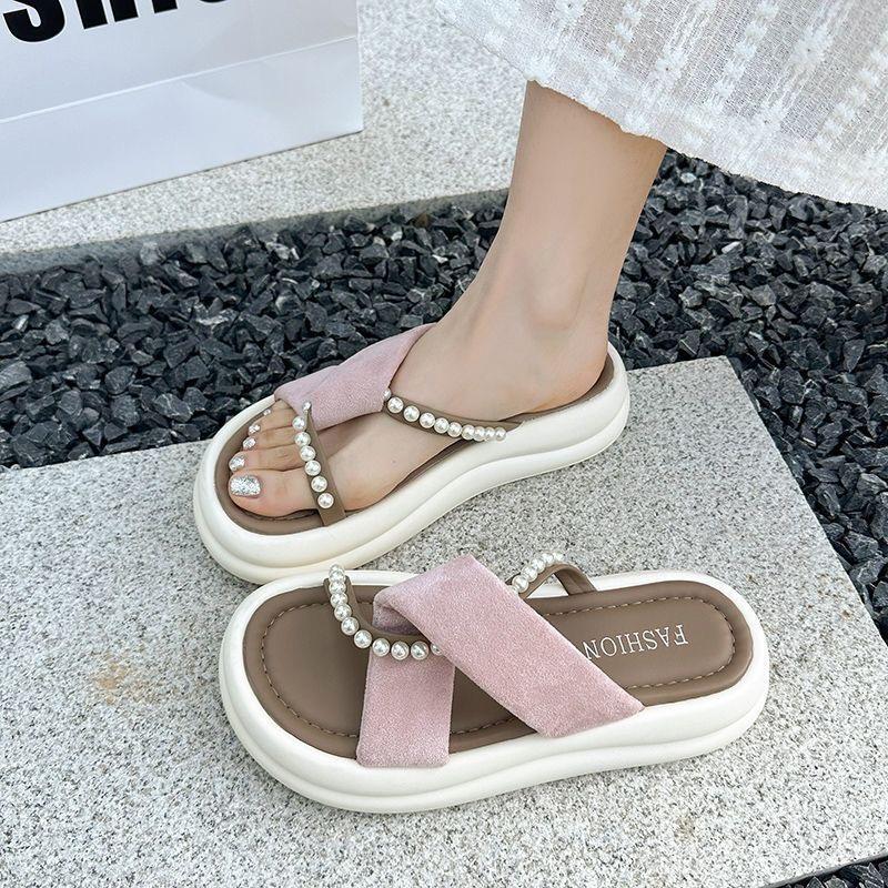 Pantuflas de Playa de Suela Gruesa para Verano para Mujer 2025 Nuevas Pantuflas de Gamuza con Perlas con Falda Sandalias Casuales para la Playa