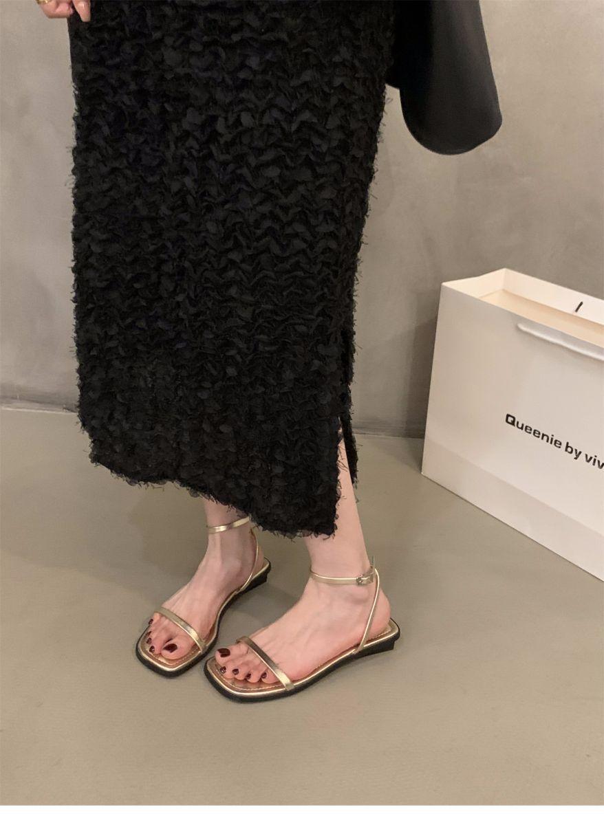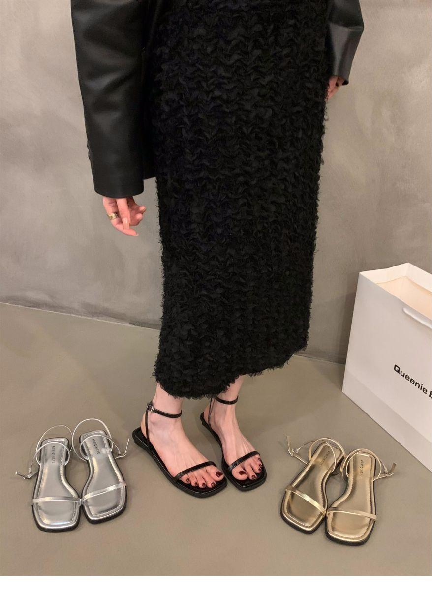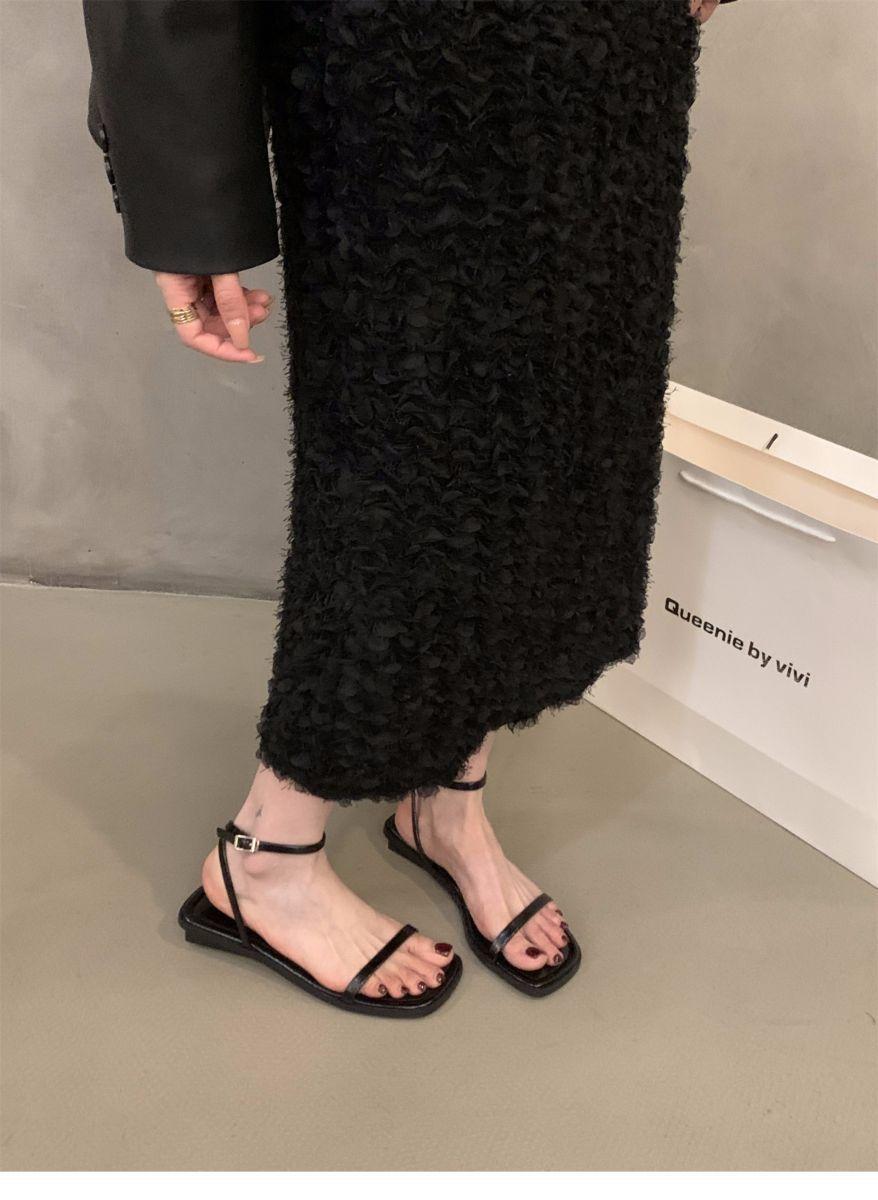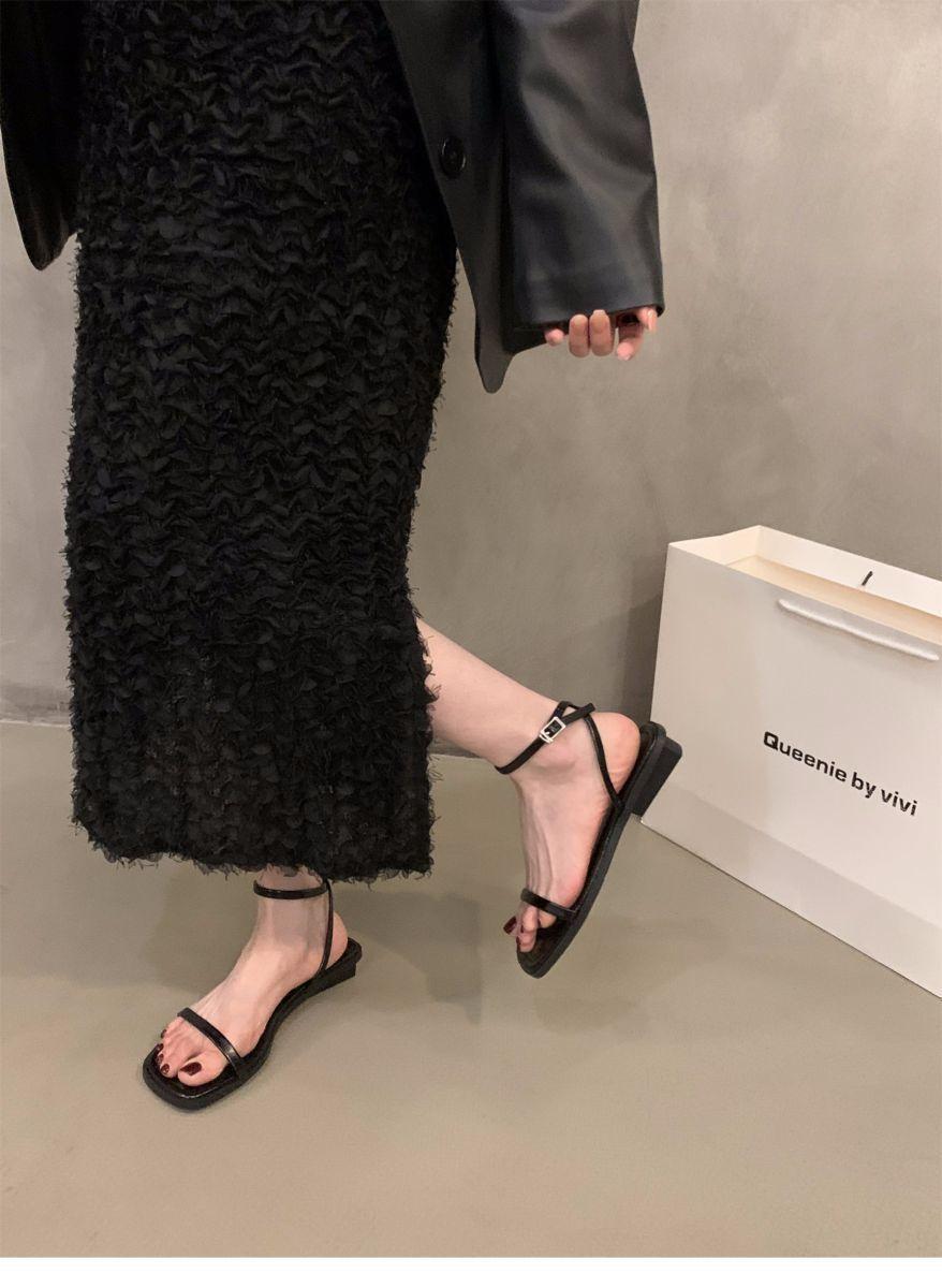 Sandalias planas negras francesas de tiras finas zapatos de hada 2025 nuevo verano suela suave estilo vacaciones de playa zapatos romanos