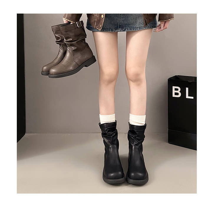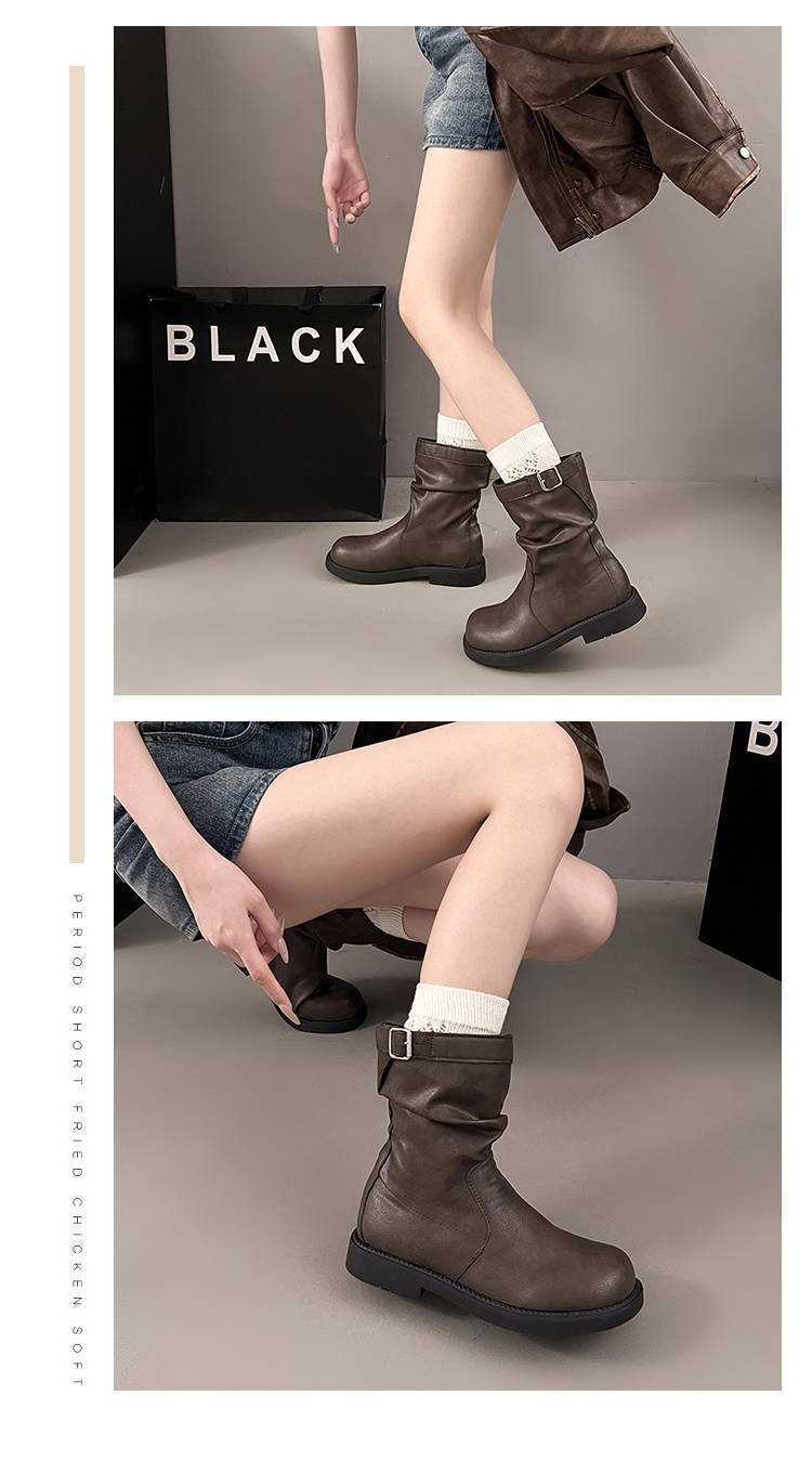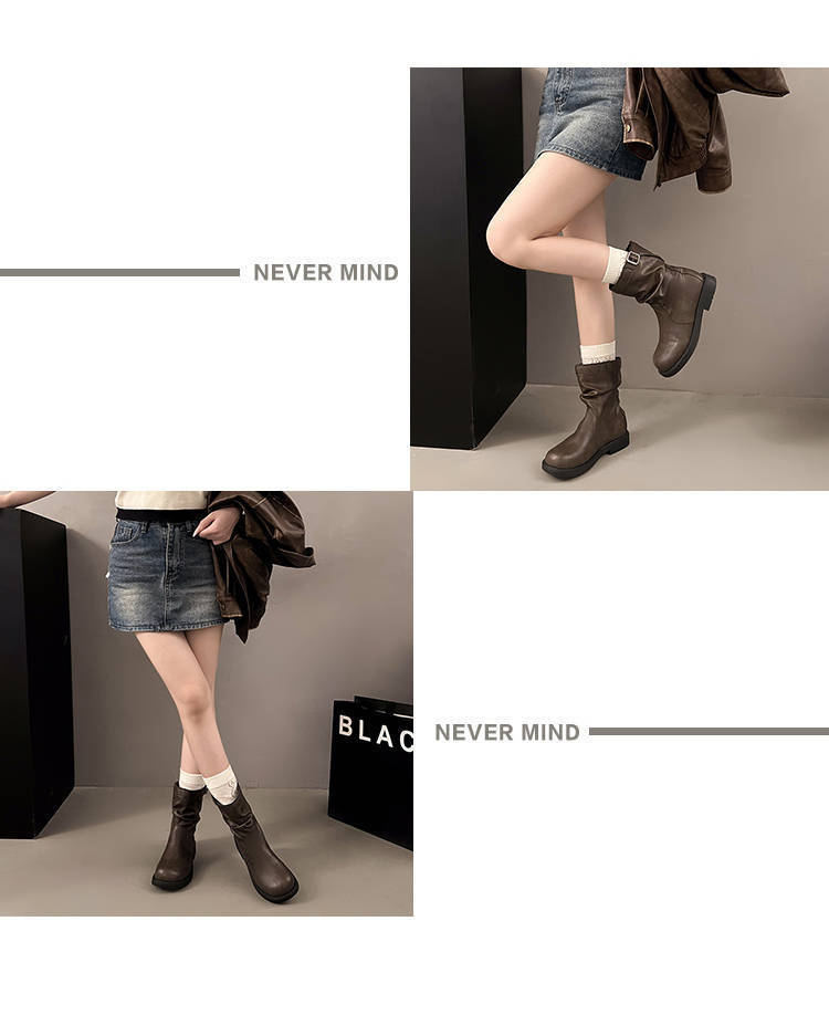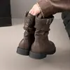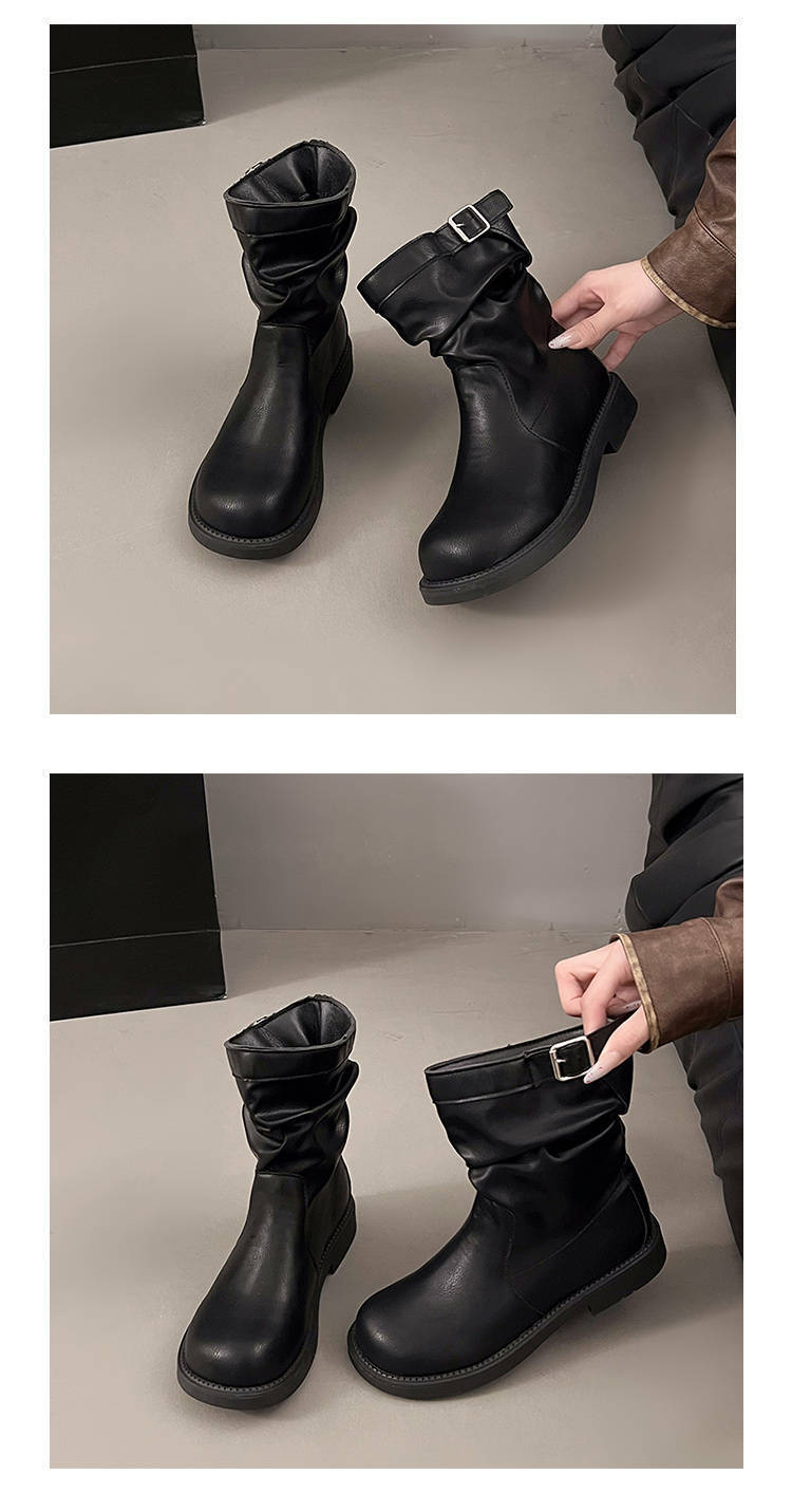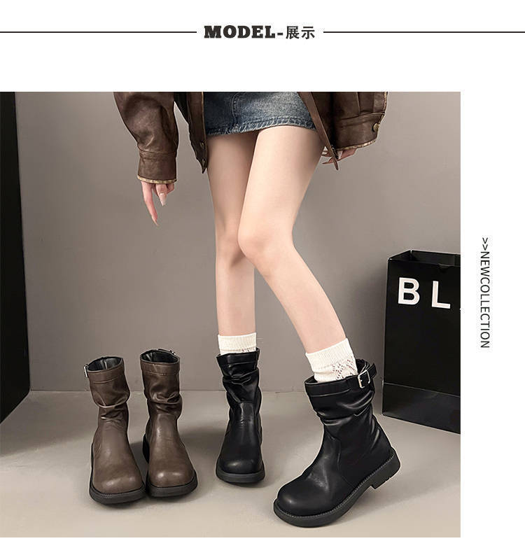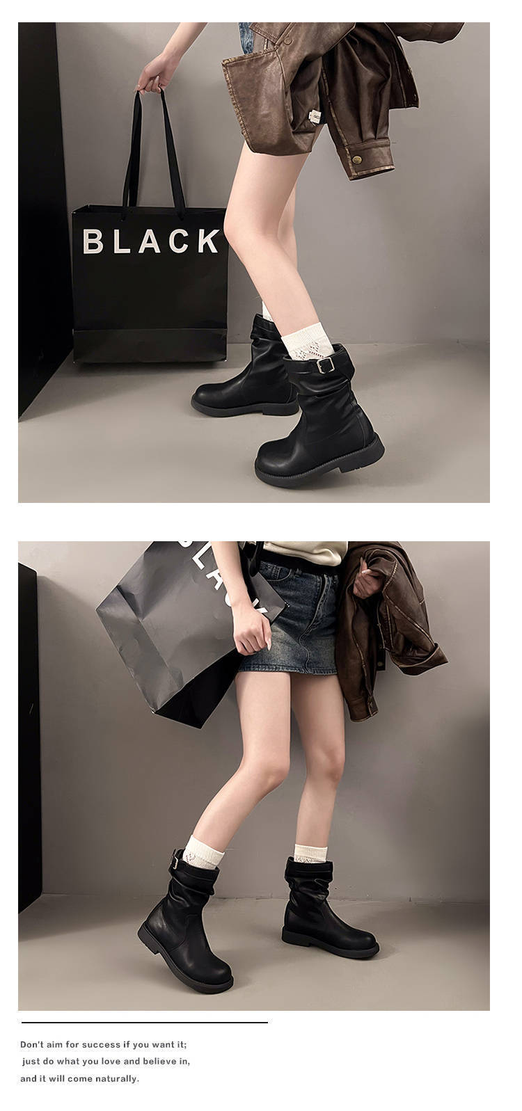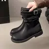 Botas Retro de Tacón Bajo hasta Media Pantorrilla Botas de Caballero Zapatos de Mujer 2025 Nuevo Otoño e Invierno Botines Apilados Arrugados Botas Martin