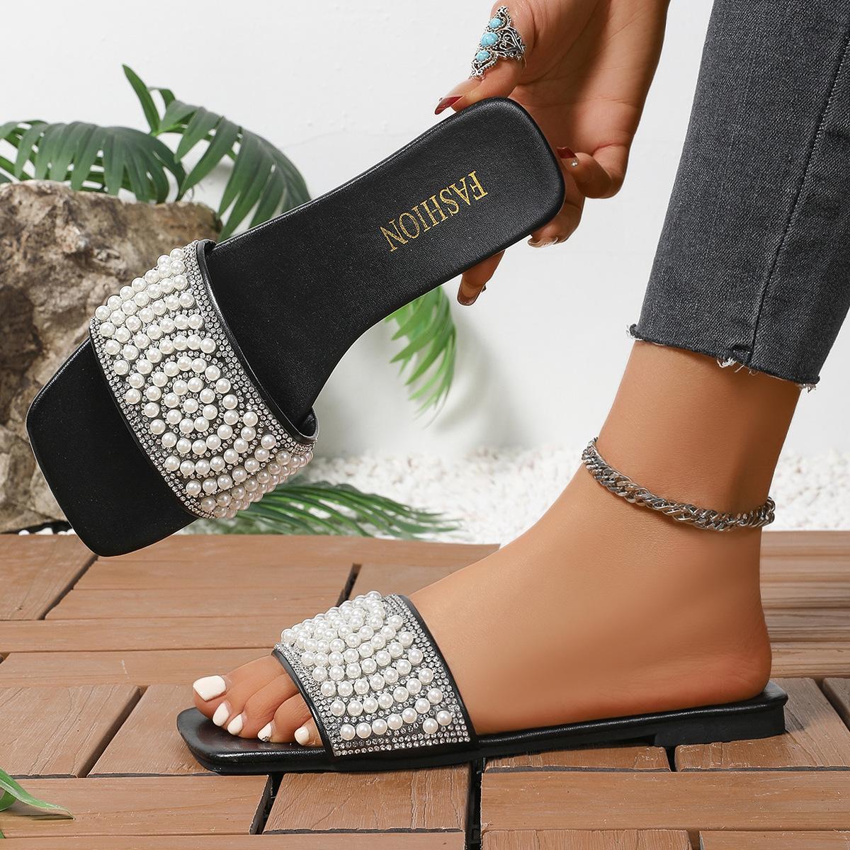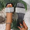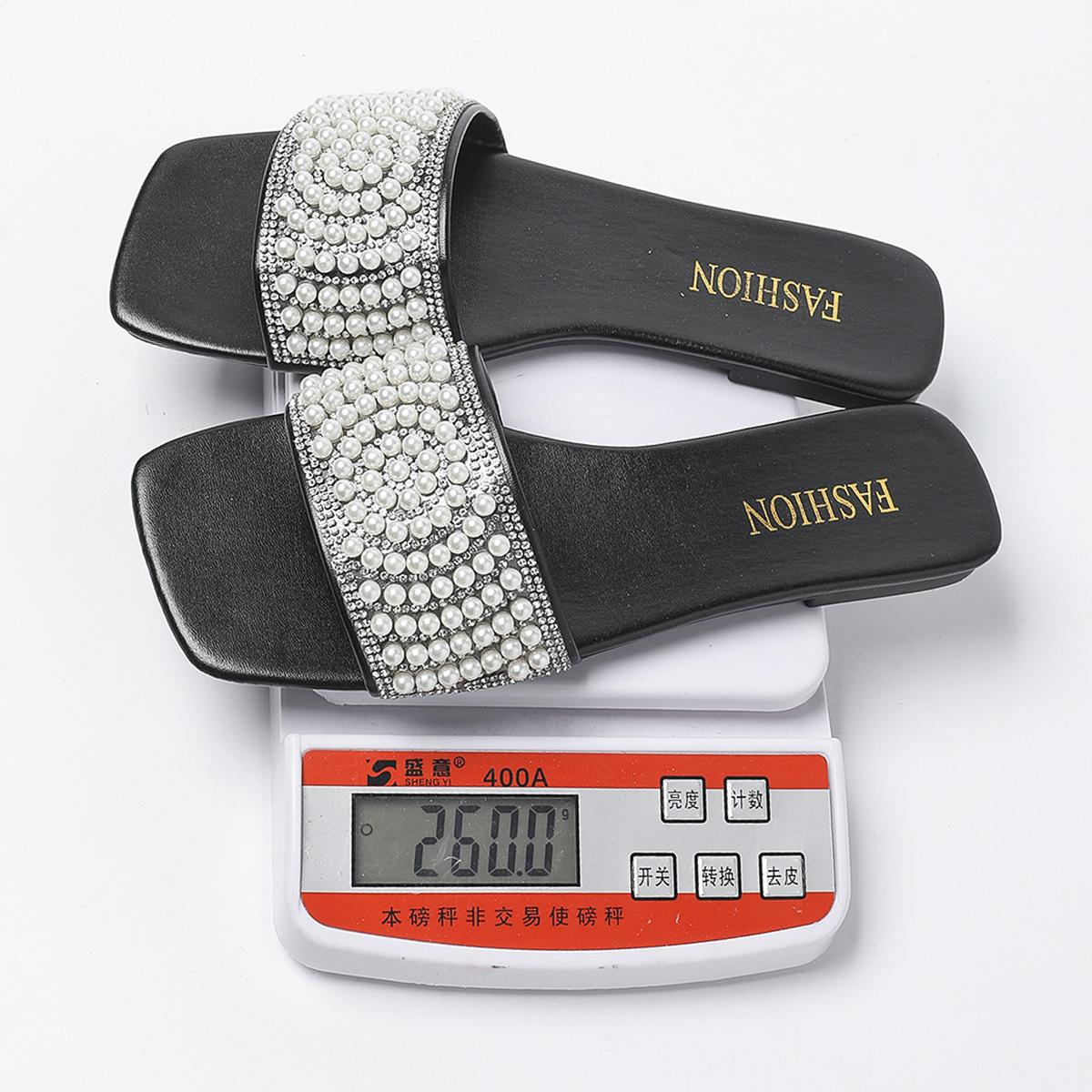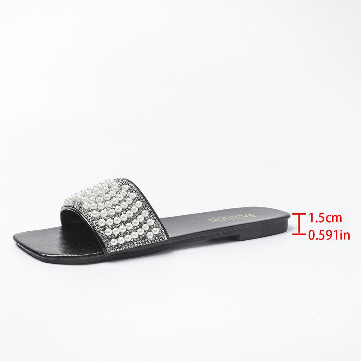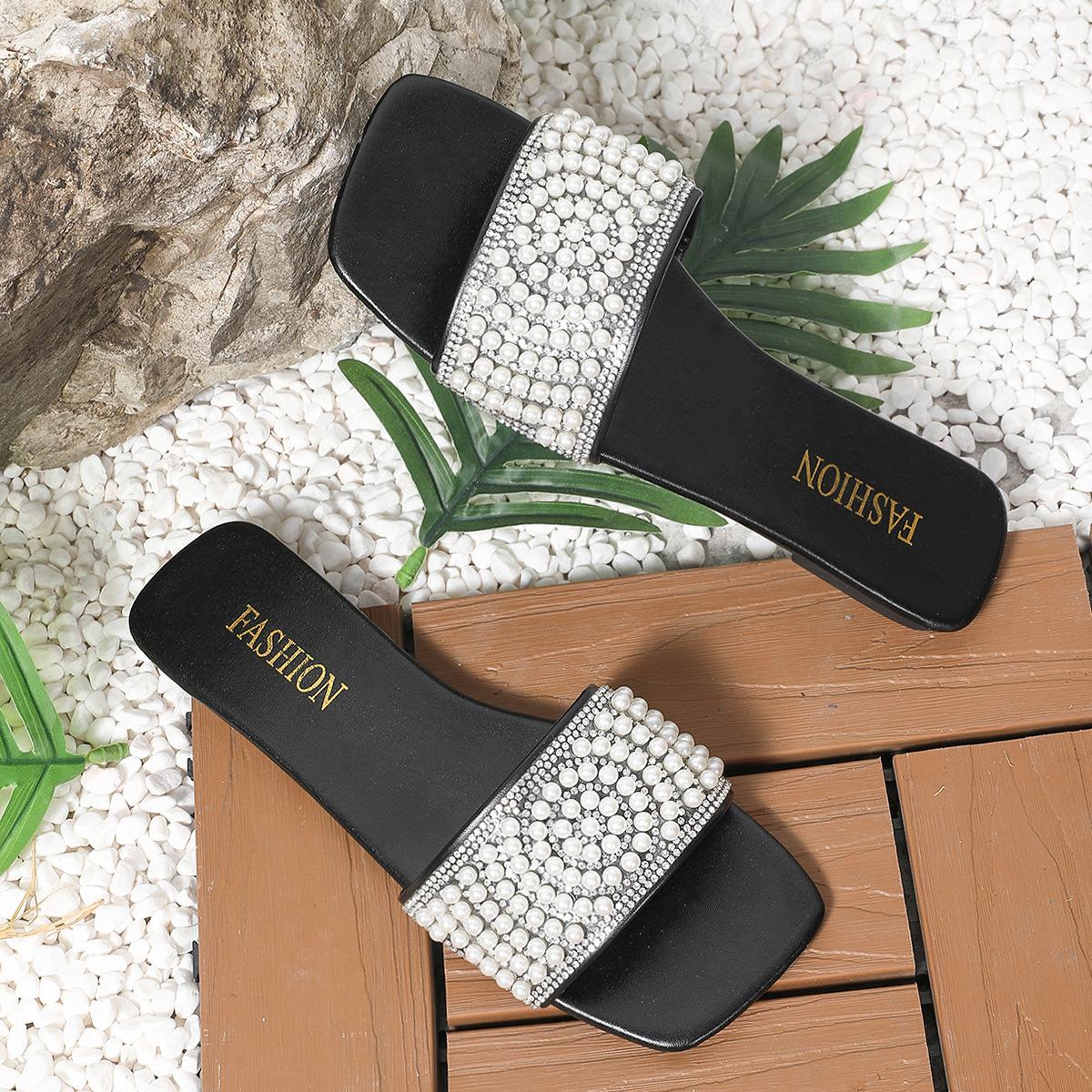 Chanclas planas de talla grande para comercio exterior europeo y americano con cuentas y una tira para mujer, de punta cuadrada, con diamantes de imitación, ligeras, para playa, sandalias, pantufla