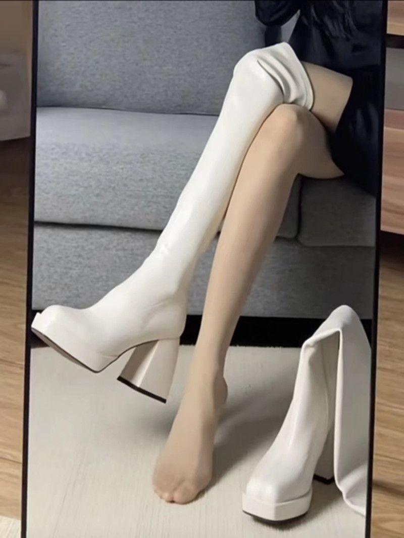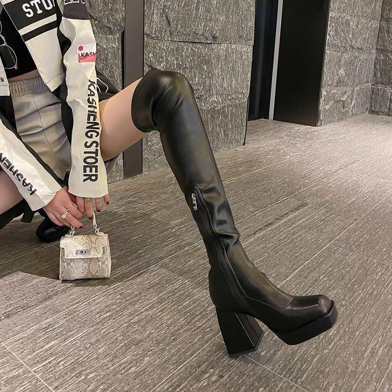 Tacones altos gruesos adelgazantes plataforma impermeable botas de caballero media pantorrilla botas elásticas ajustadas de chica hot europea y americana para mujer 2025 otoño e invierno nuevo