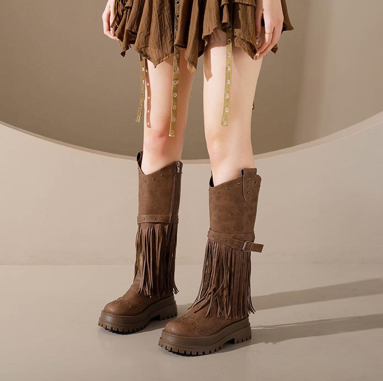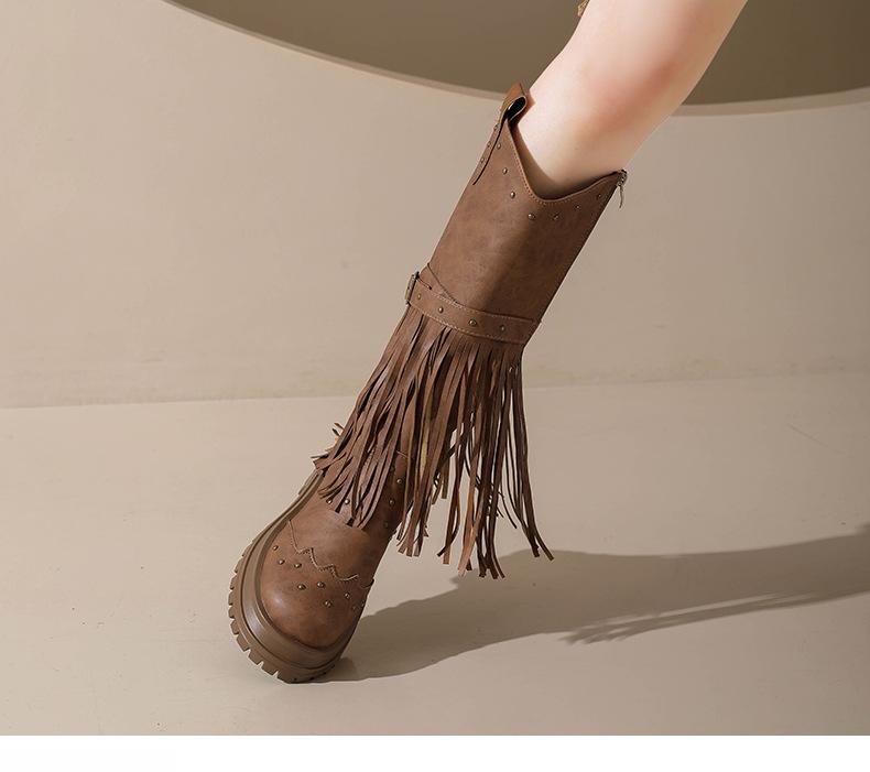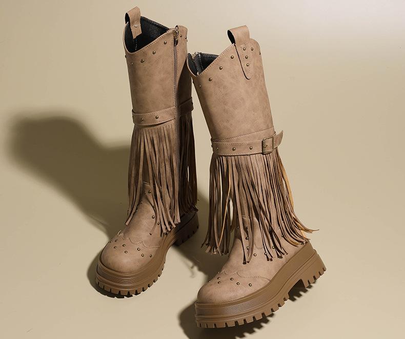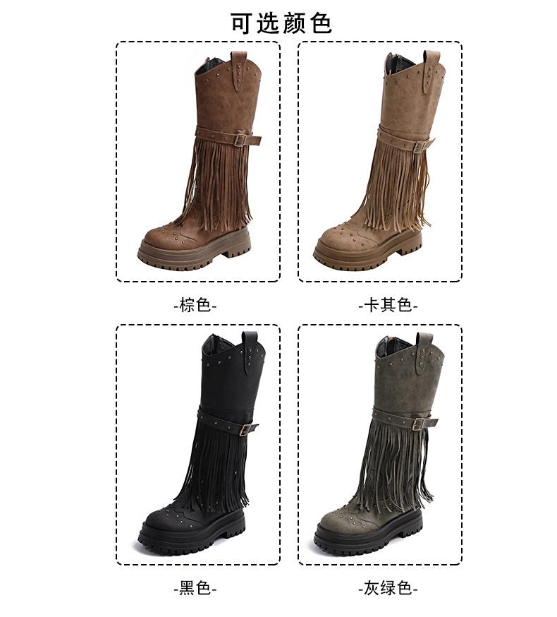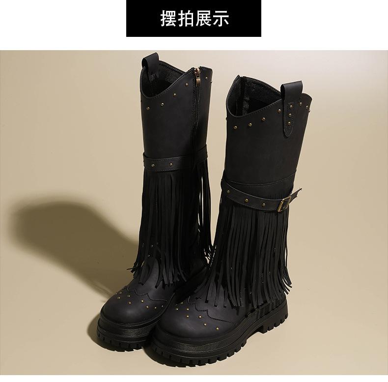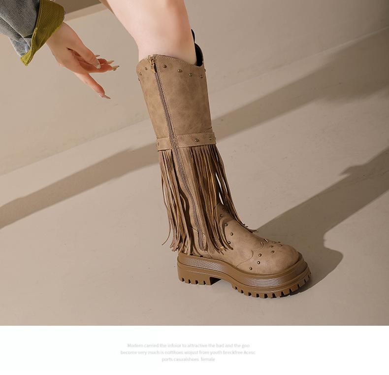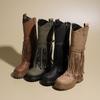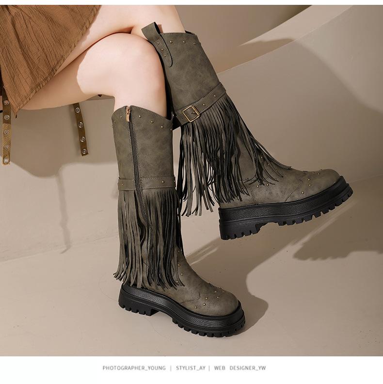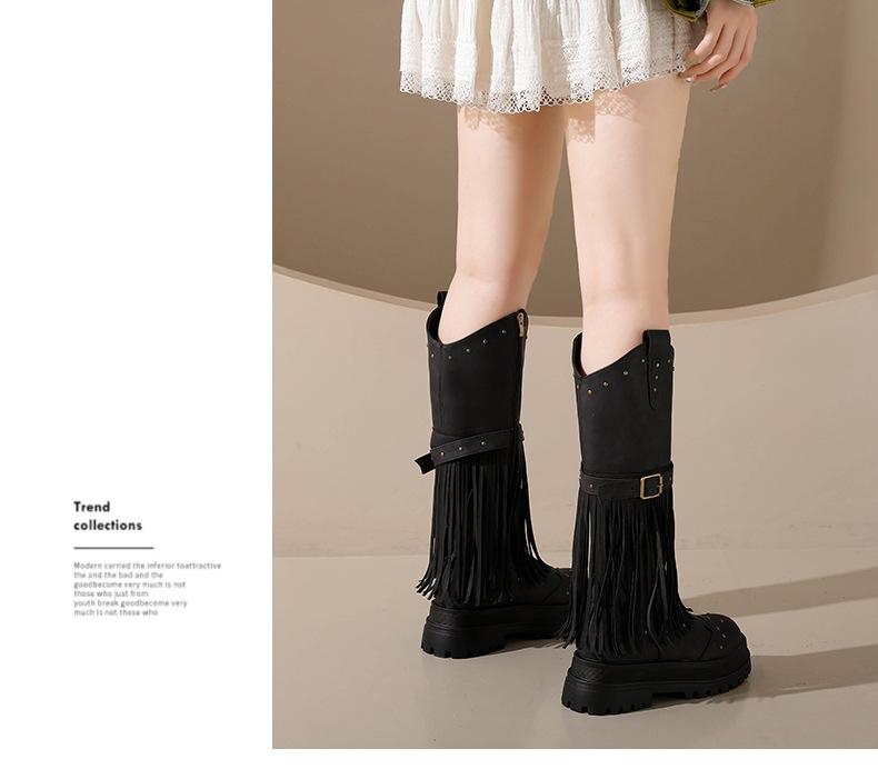Botas con Flecos Retro Europeas y Americanas 2025 Otoño/Invierno Nuevas Botas Altas con Hebilla Tachonada Botas de Caballero Modernas y Versátiles
