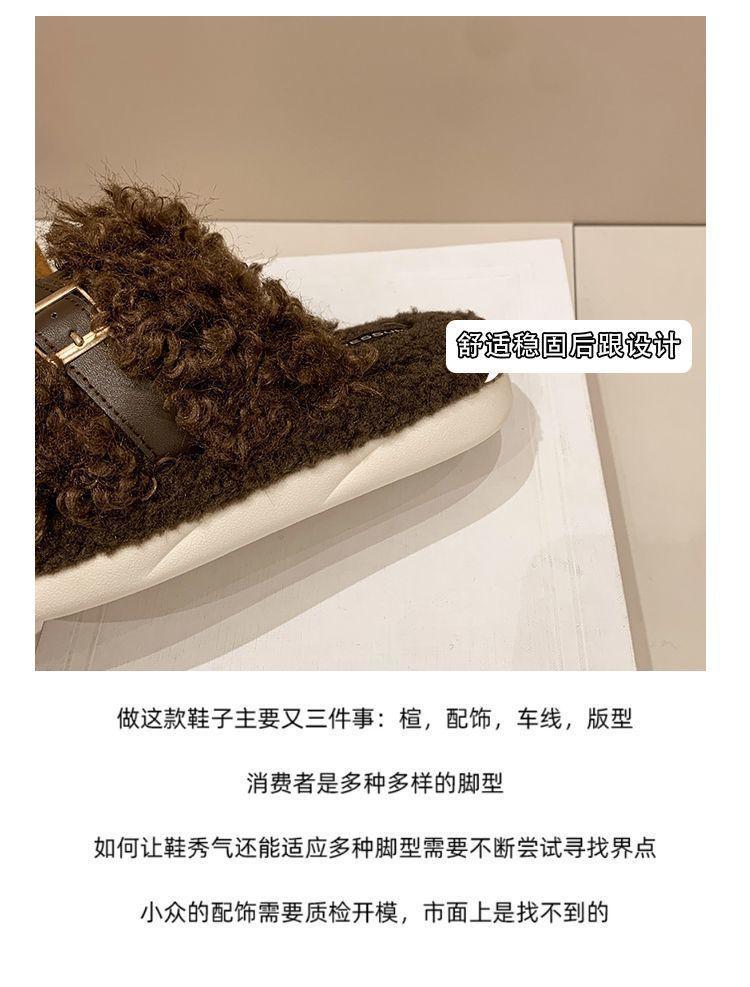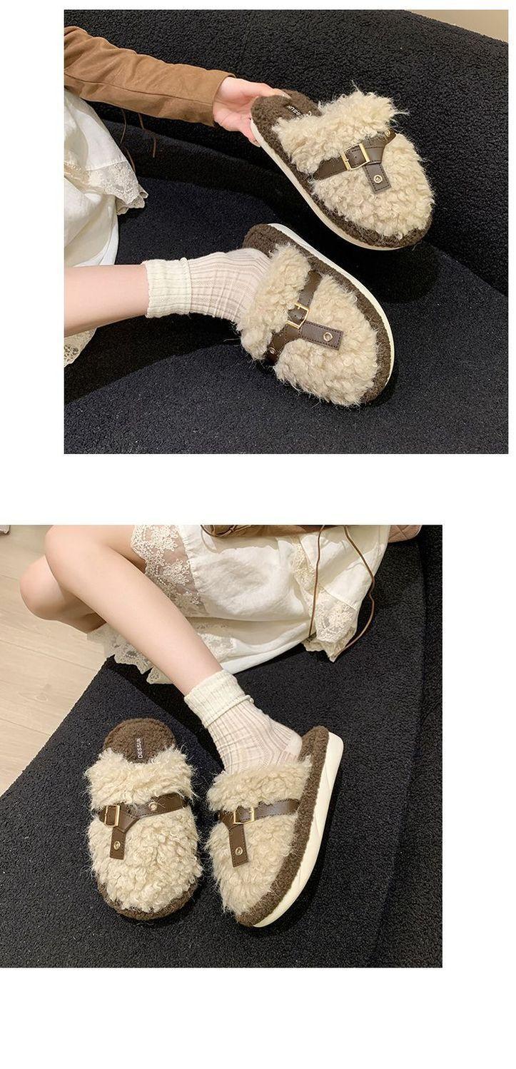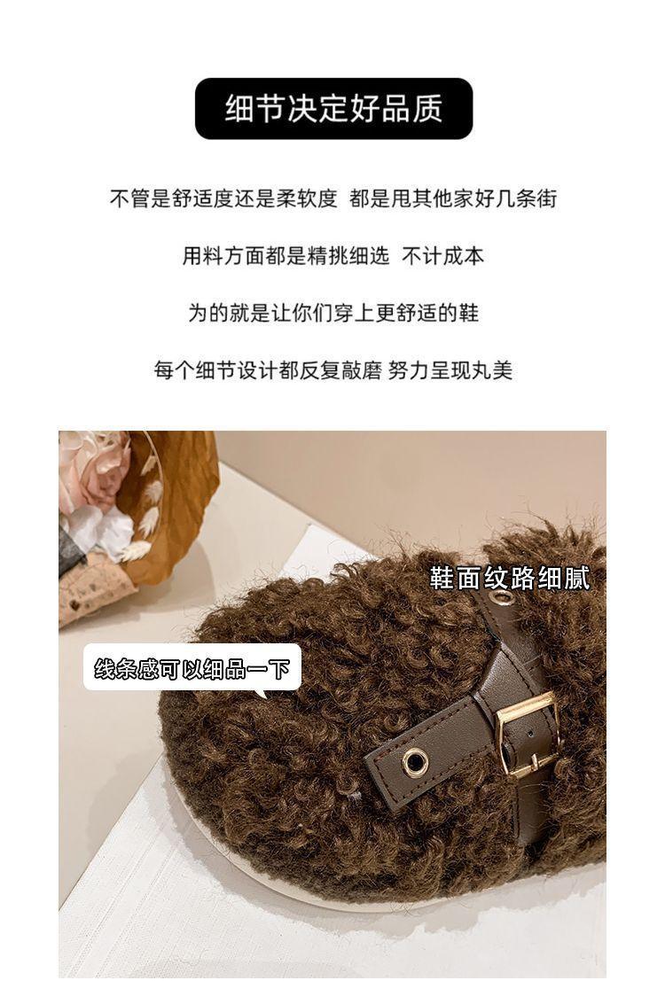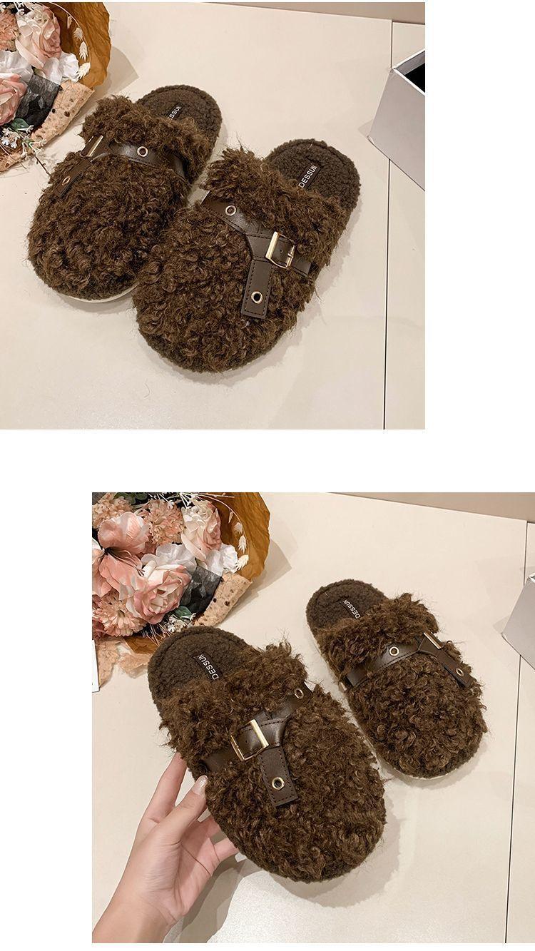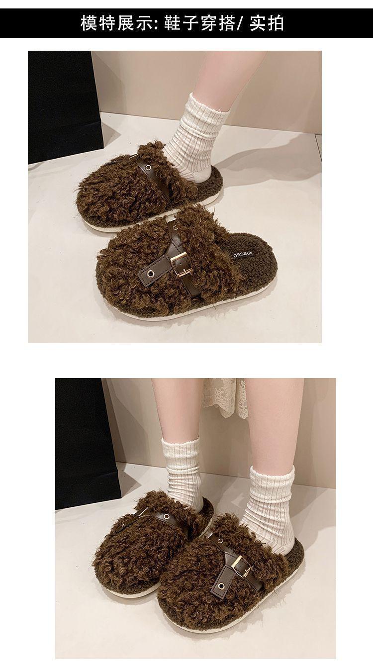 Pantuflas planas antideslizantes de interior/exterior borrosas para mujer 2025 Otoño/Invierno Nuevo estilo para usar fuera Rojo de internet de punta cerrada de felpa de algodón para mujer