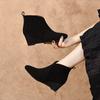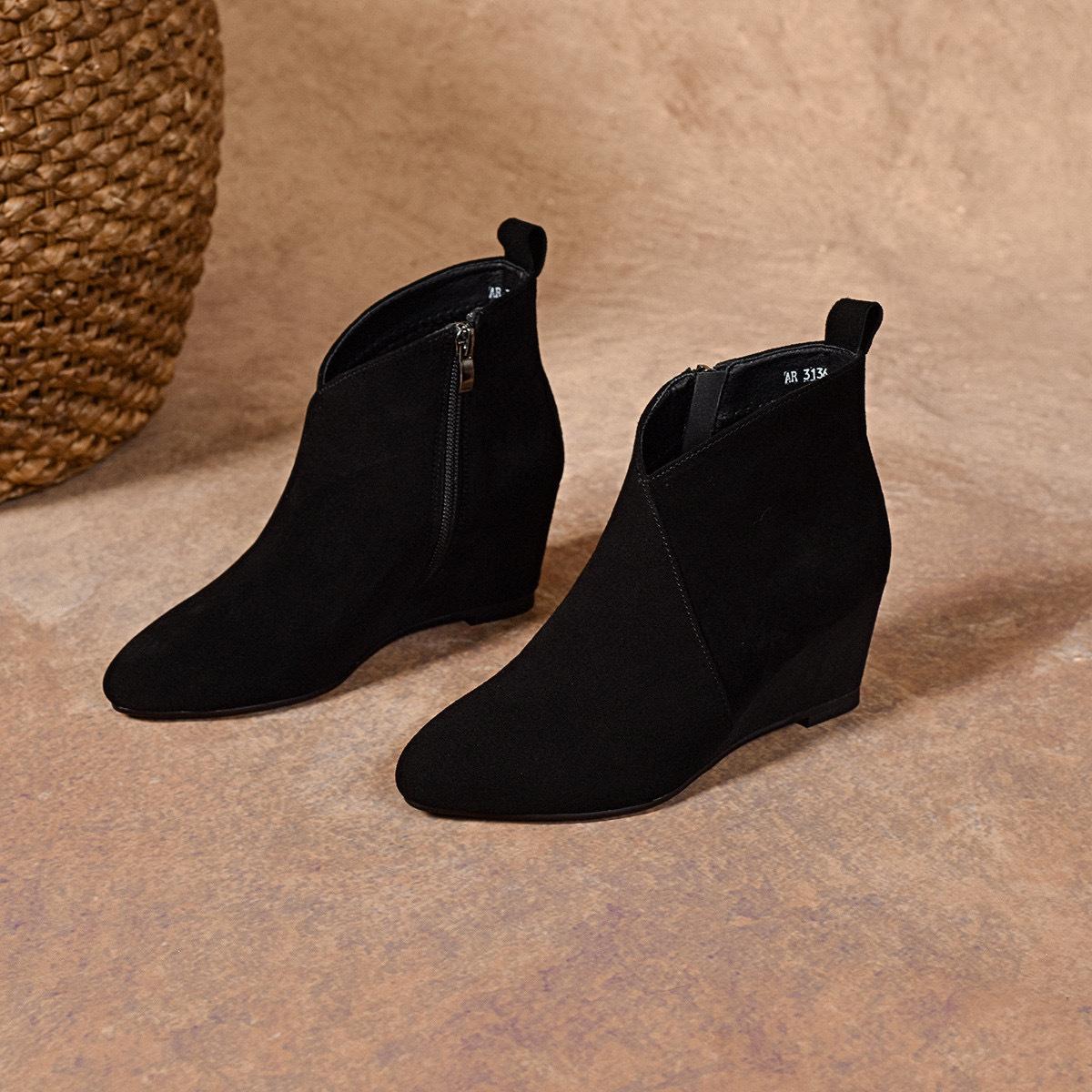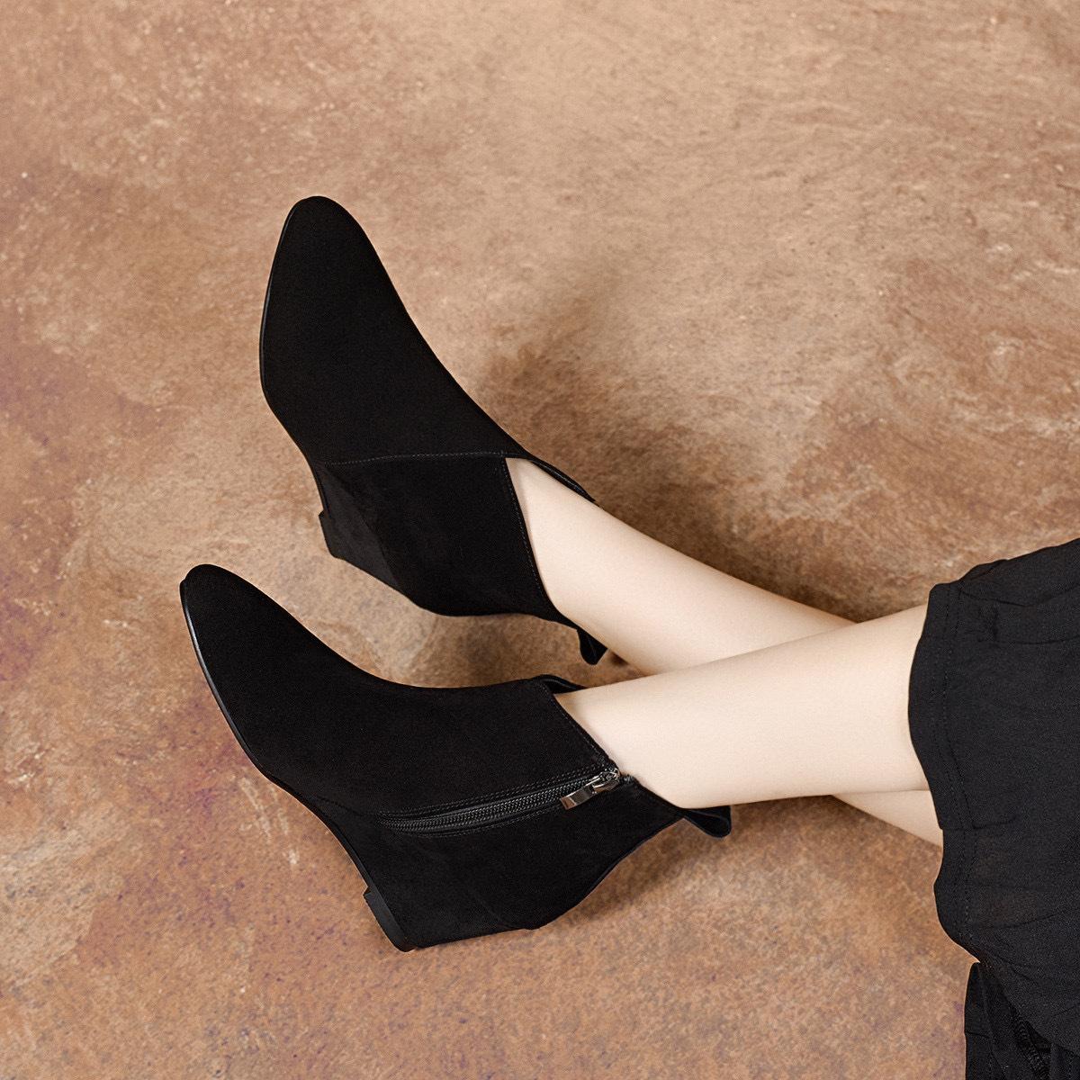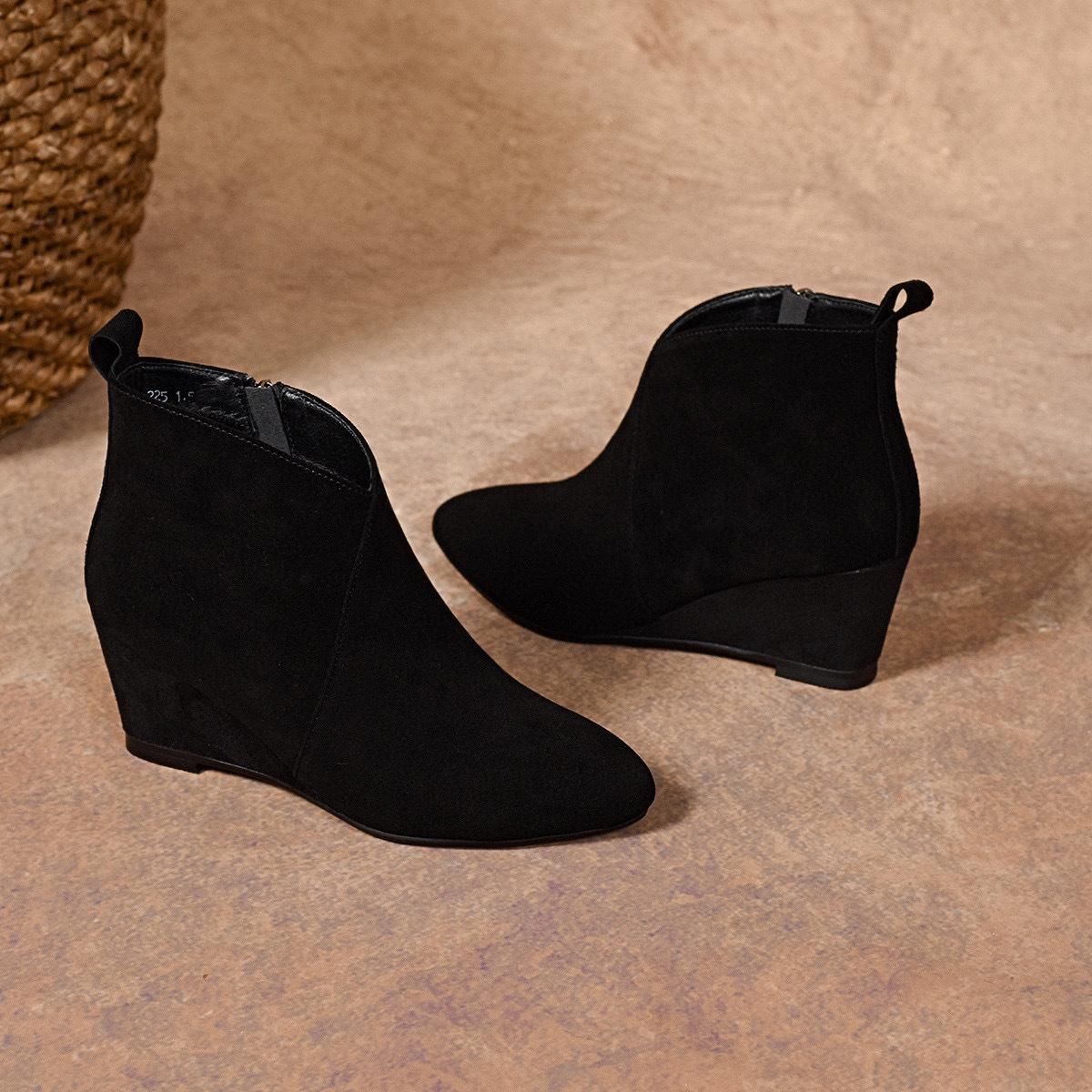 Botines de Cuña de Punta Material: piel de oveja Color: Negro Altura del tacón: 5 cm Talla: 34-40
