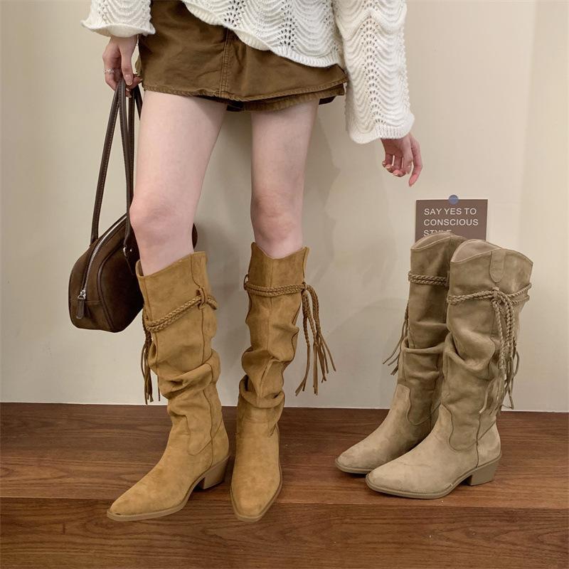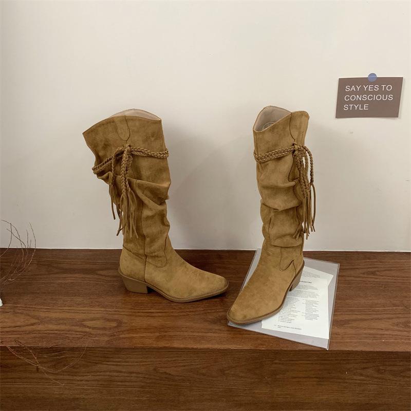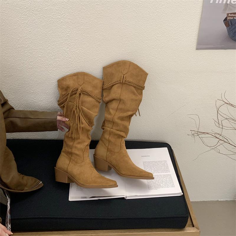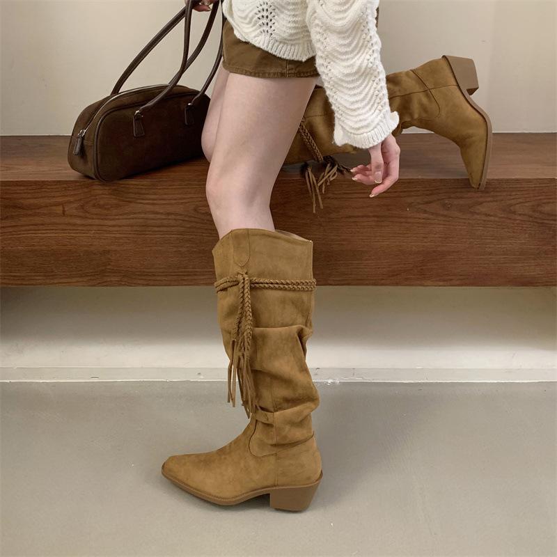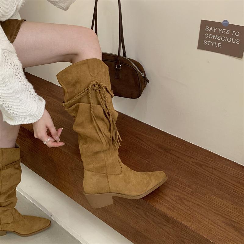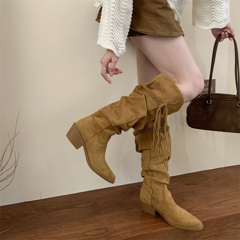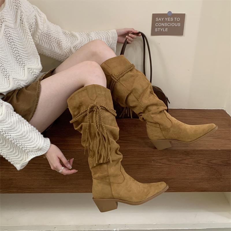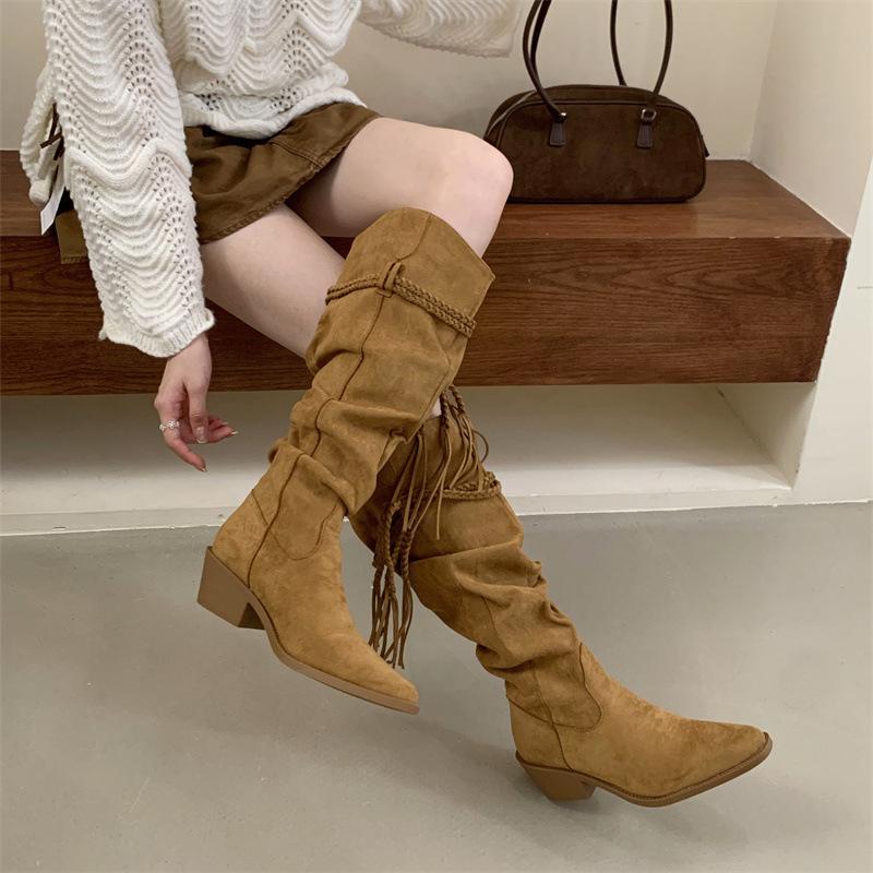 Moda 2025 Botas Nuevas Largas Botas de Media Caña Botas de Caballero con Borlas Botas de Tacón Grueso Medio para Mujer Botas Apiladas Adelgazantes por Encima de la Rodilla