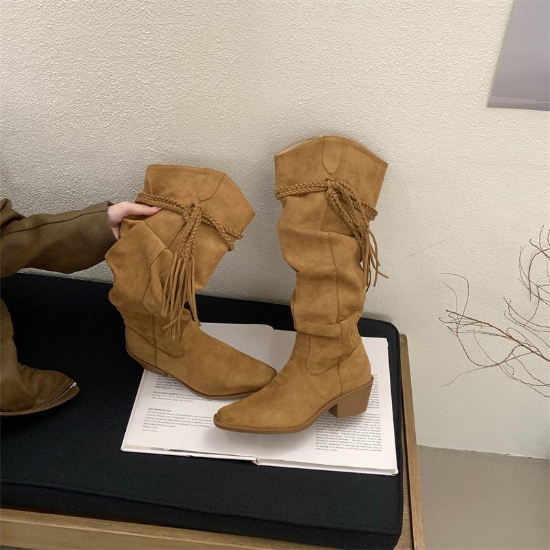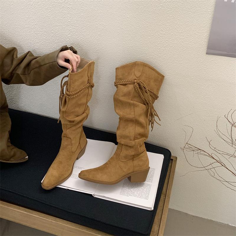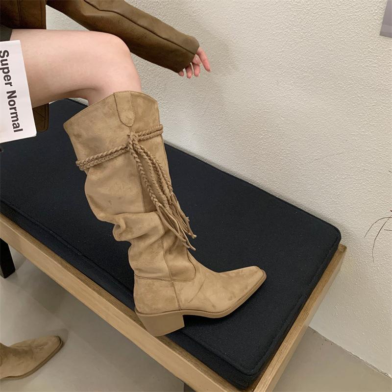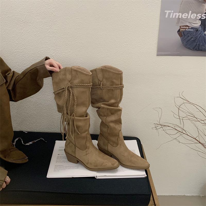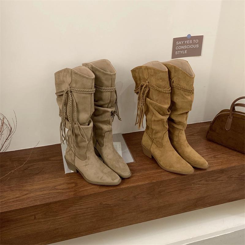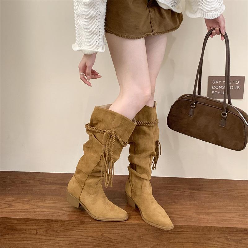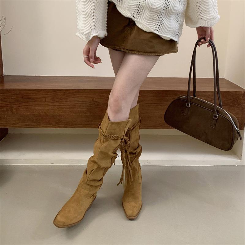 Moda 2025 Botas Nuevas Largas Botas de Media Caña Botas de Caballero con Borlas Botas de Tacón Grueso Medio para Mujer Botas Apiladas Adelgazantes por Encima de la Rodilla