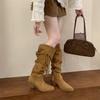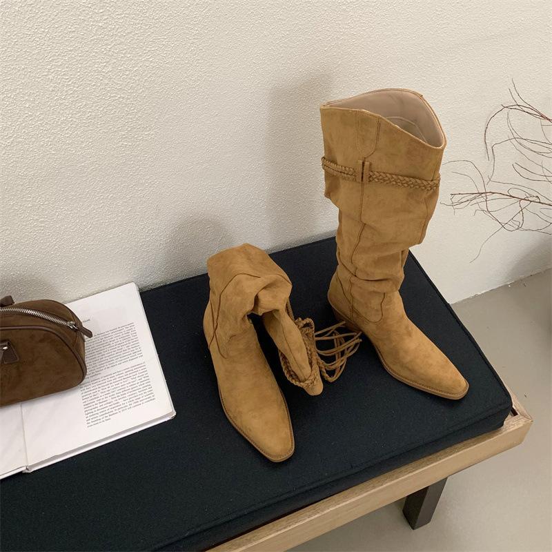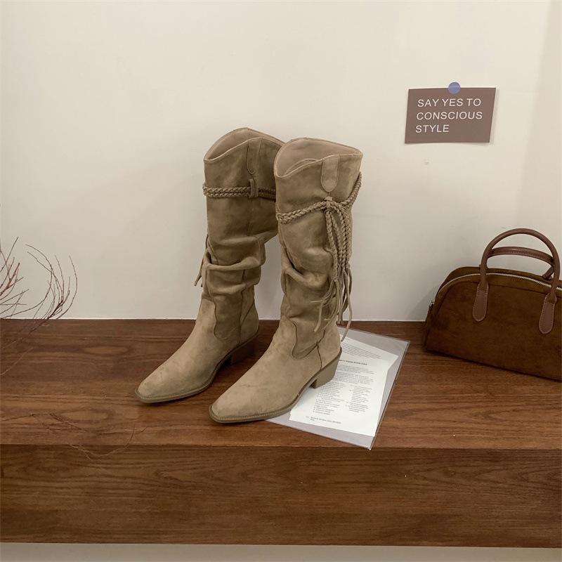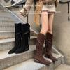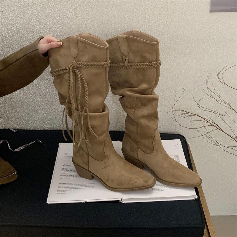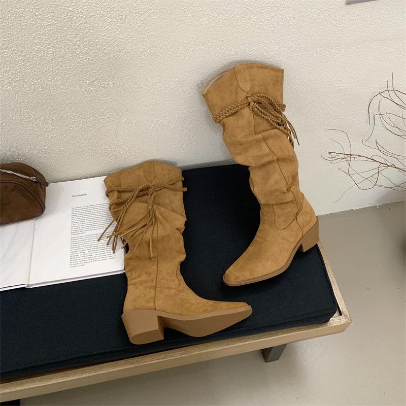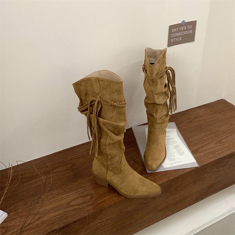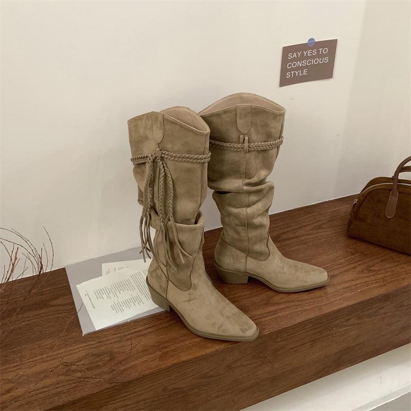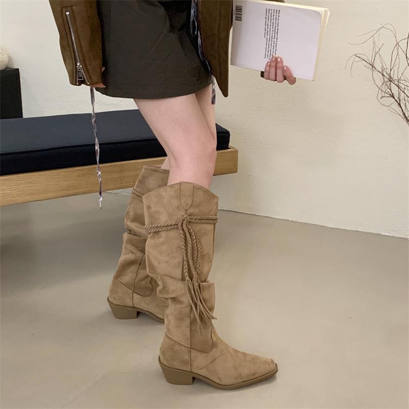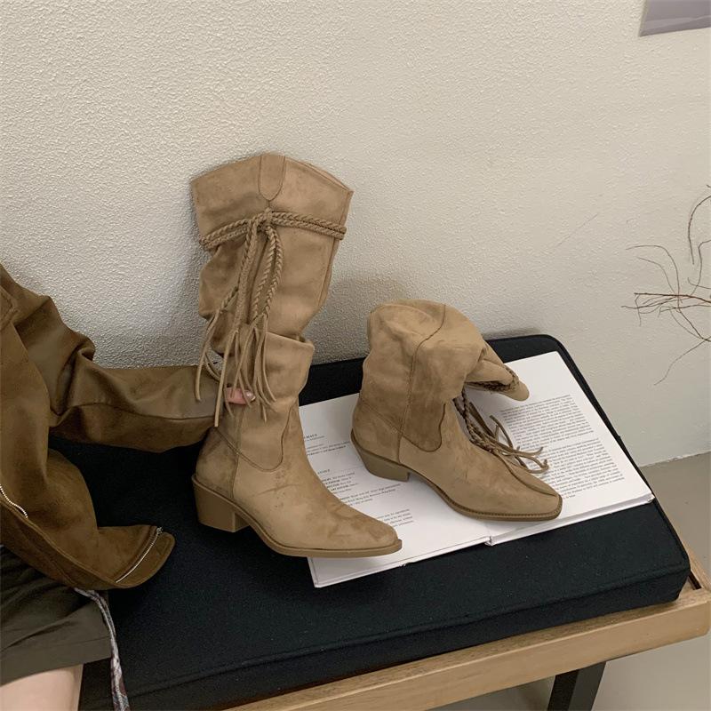 Moda 2025 Botas Nuevas Largas Botas de Media Caña Botas de Caballero con Borlas Botas de Tacón Grueso Medio para Mujer Botas Apiladas Adelgazantes por Encima de la Rodilla