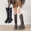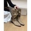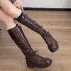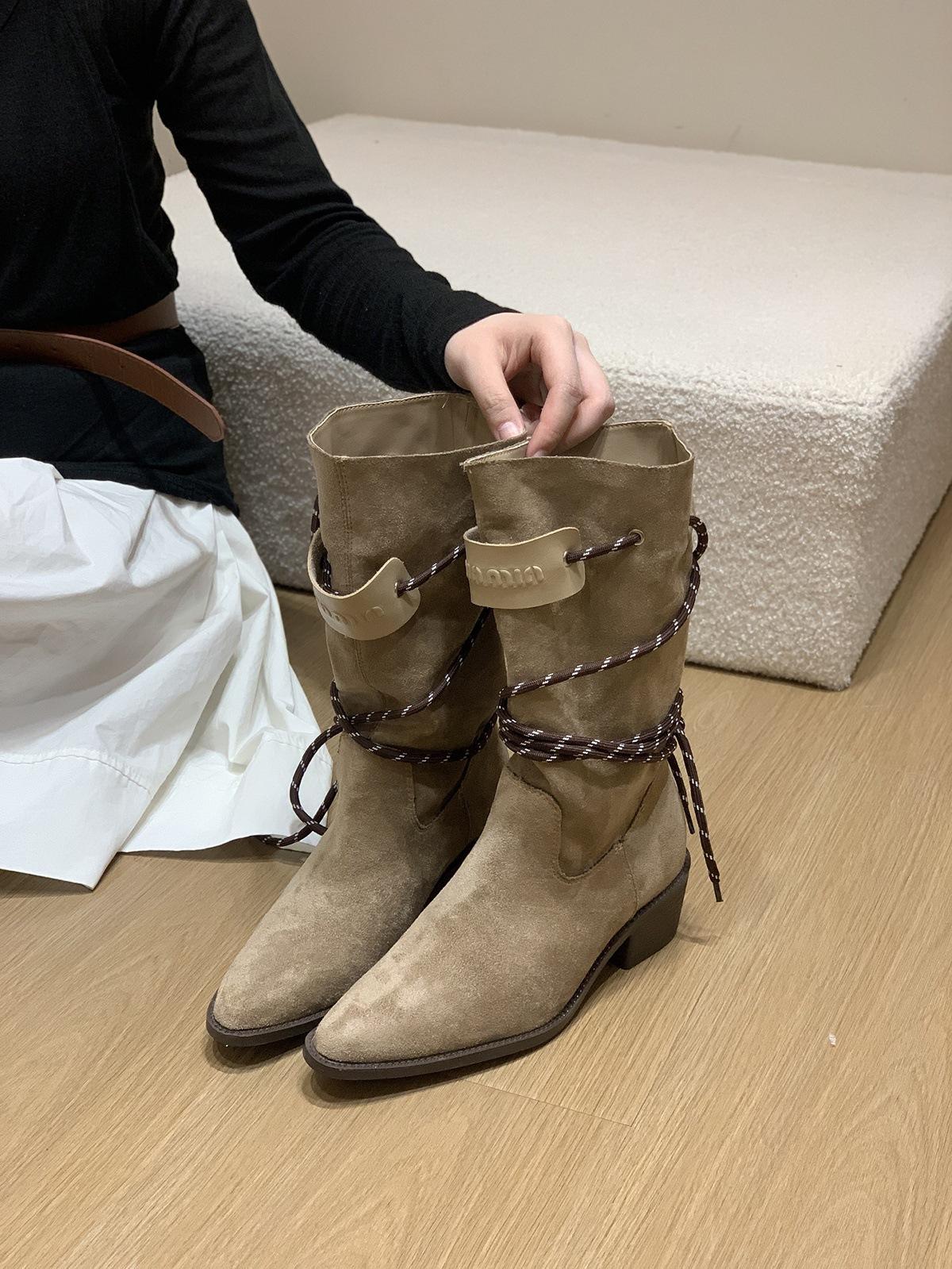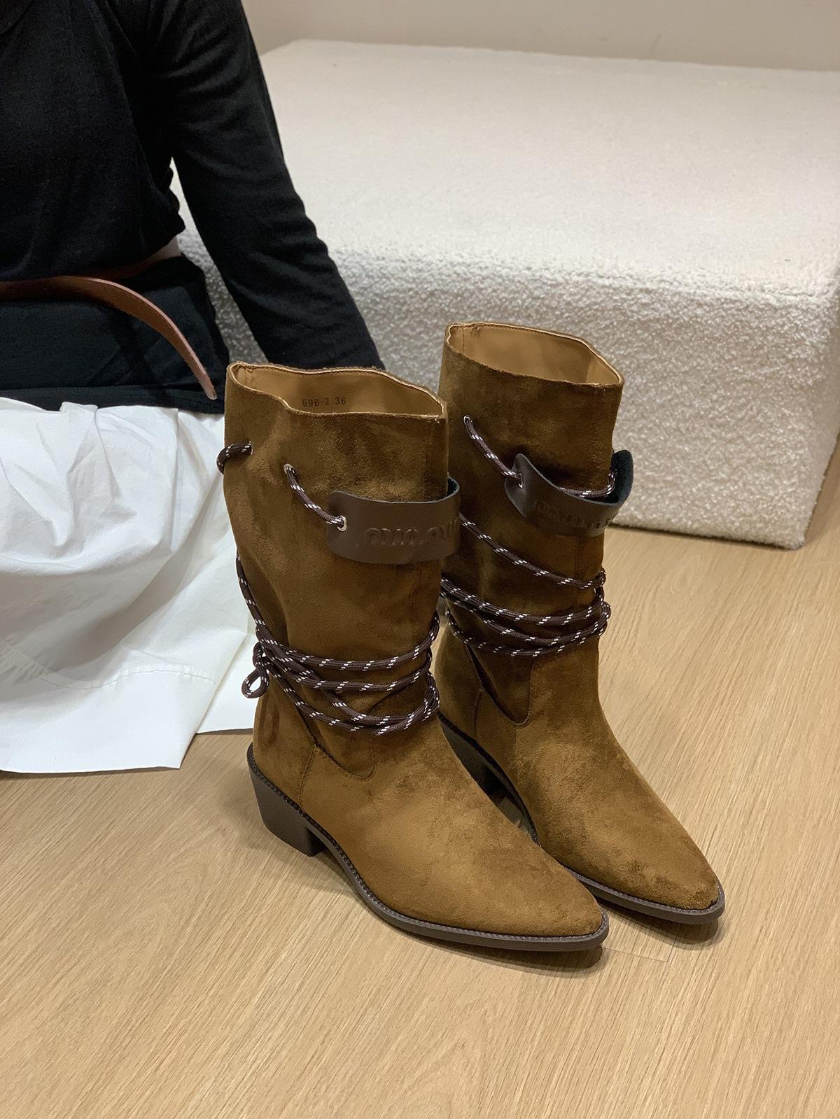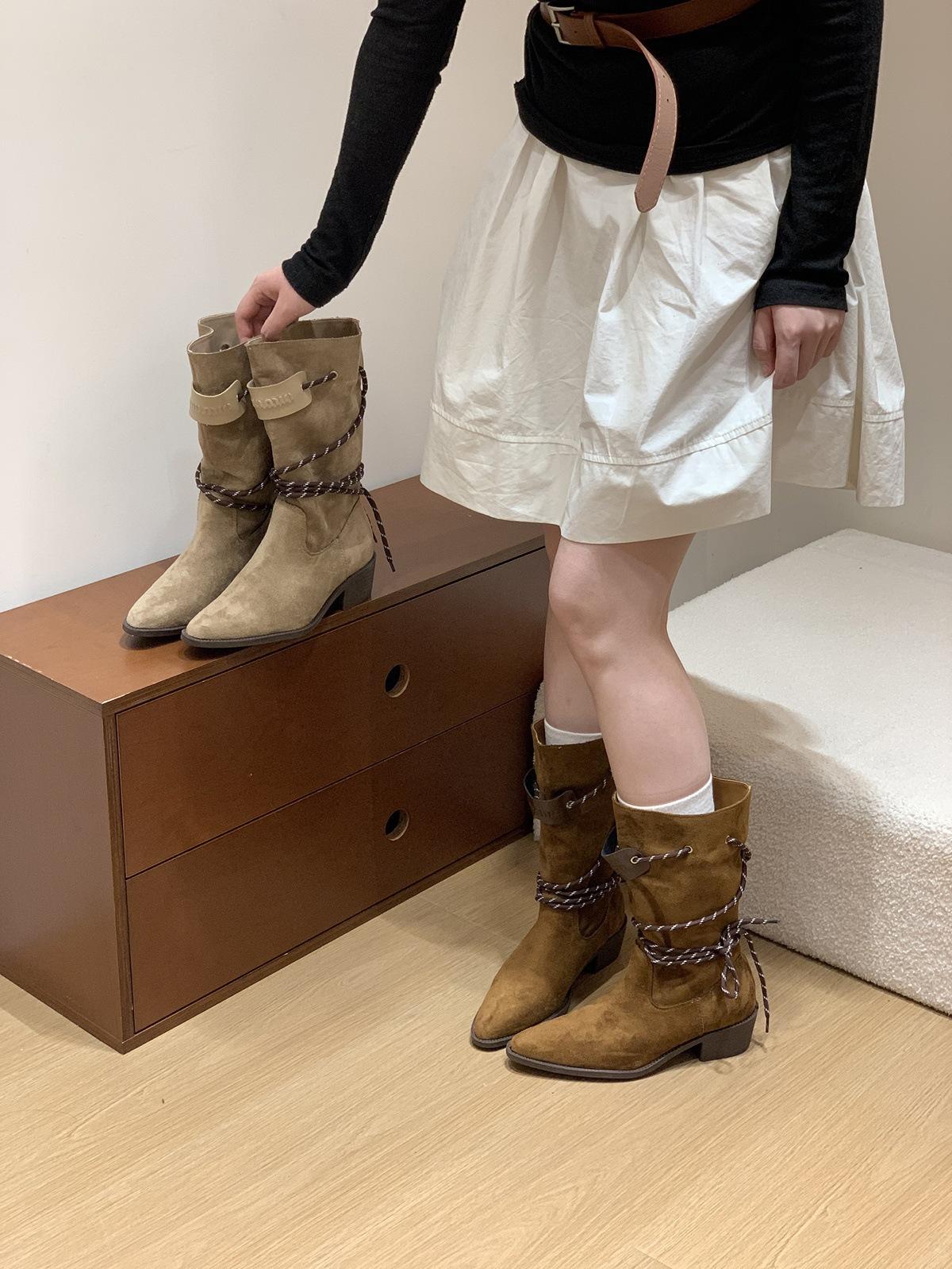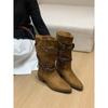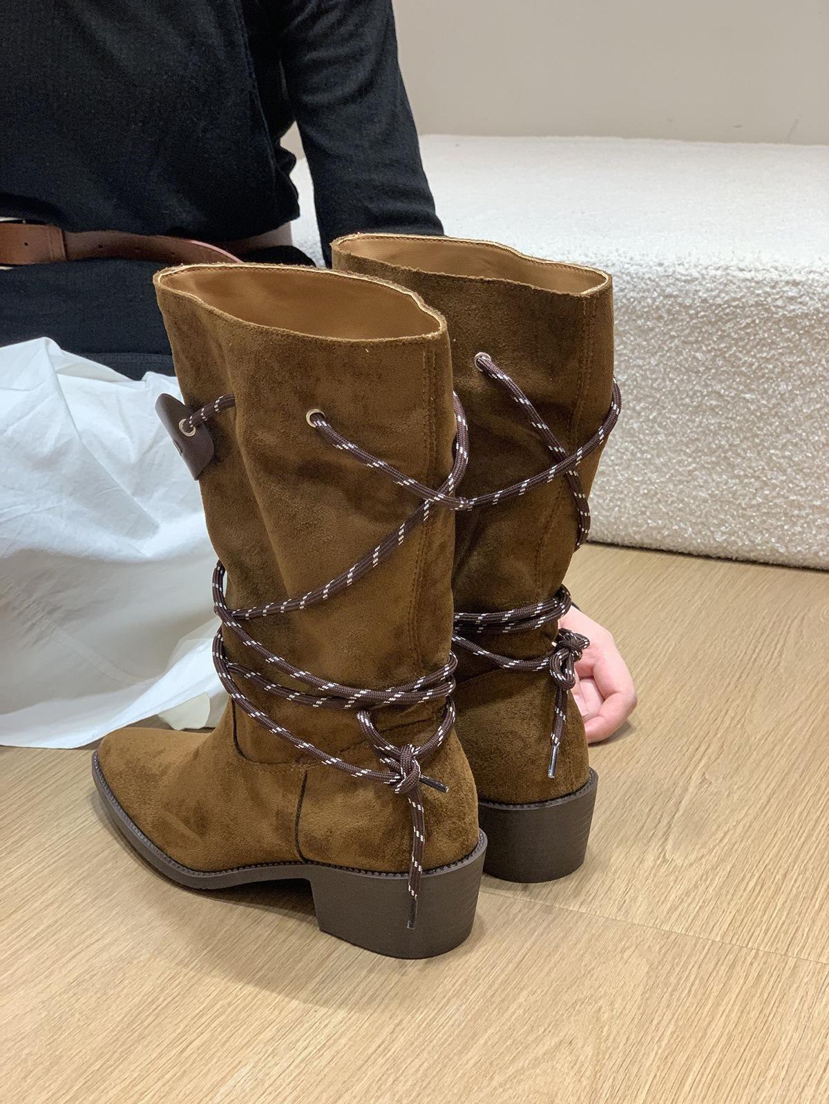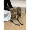 Botas Retro de Tacón Grueso Marrón Gamuza Media Caña Apiladas para Mujer 2025 Nuevas Botas Ajustadas Botas Individuales de Primavera y Otoño Botines Western