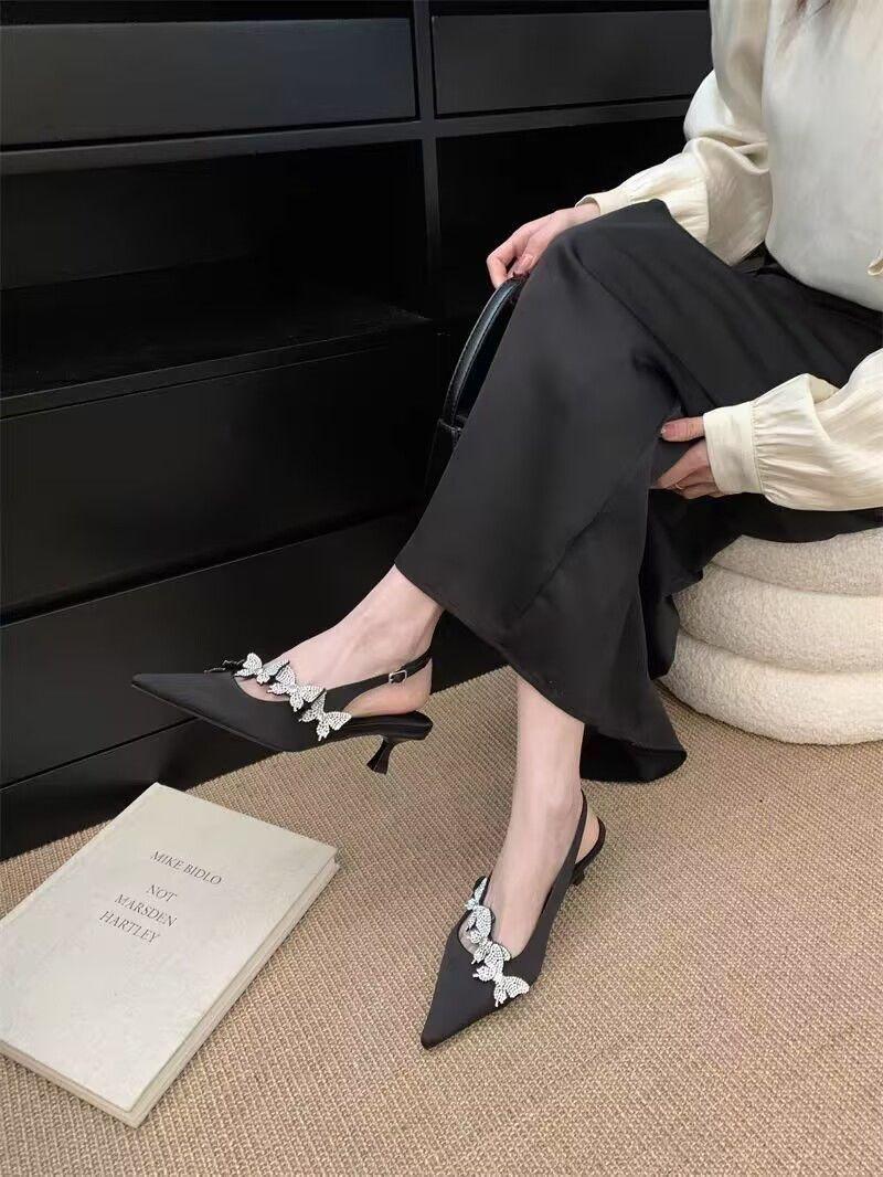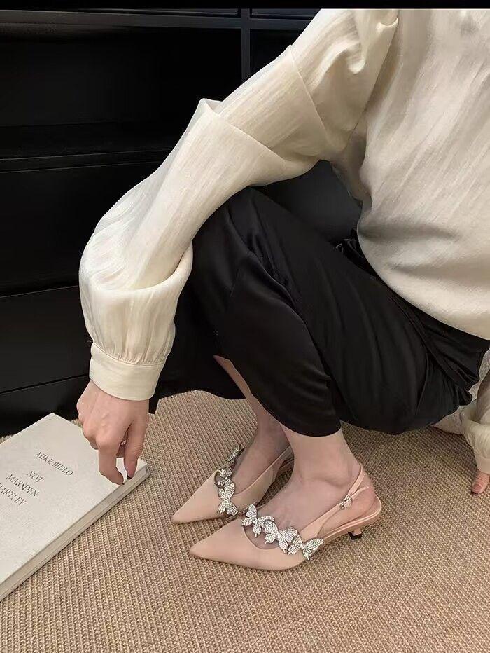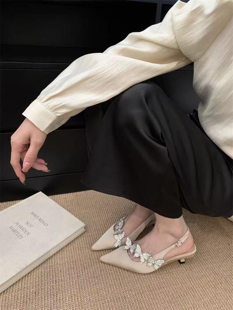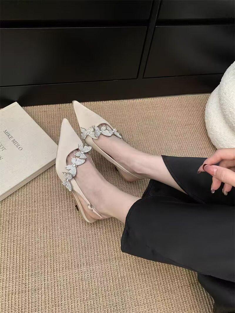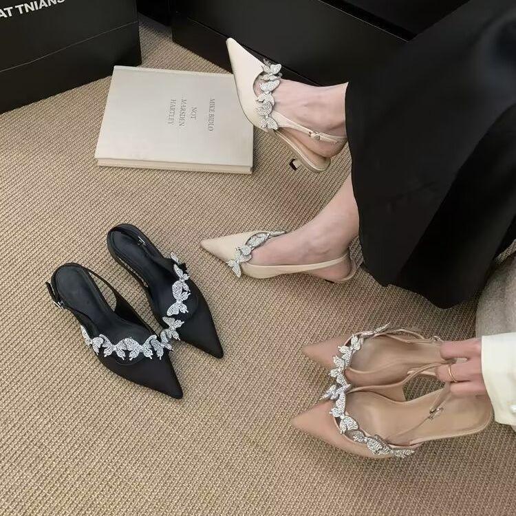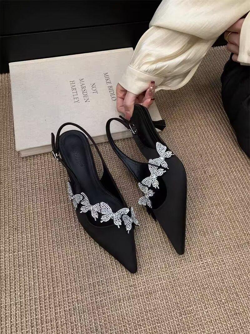 2025 Verano Nuevo Estilo Chino Puntiagudas Pedrería Sandalias de Punta Cerrada Mujer Mariposa Satén Tacones Altos Tacón de Aguja Unas Tiras Zapatos Individuales
