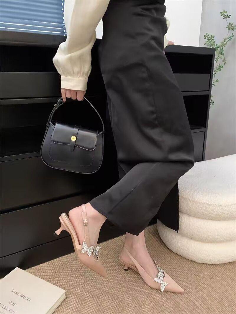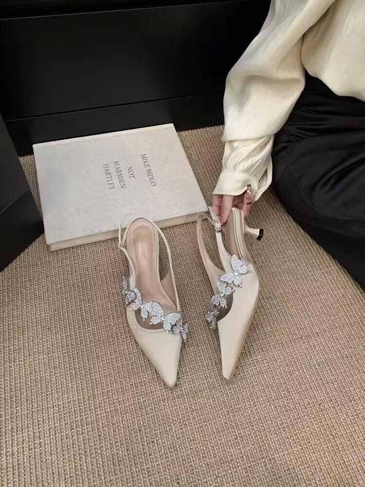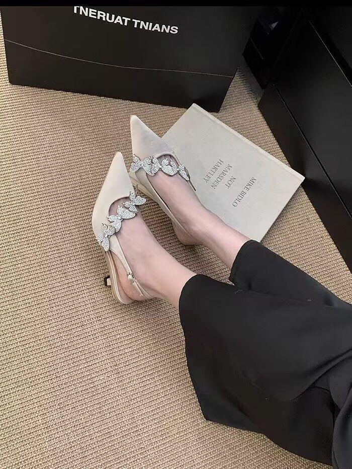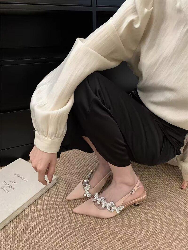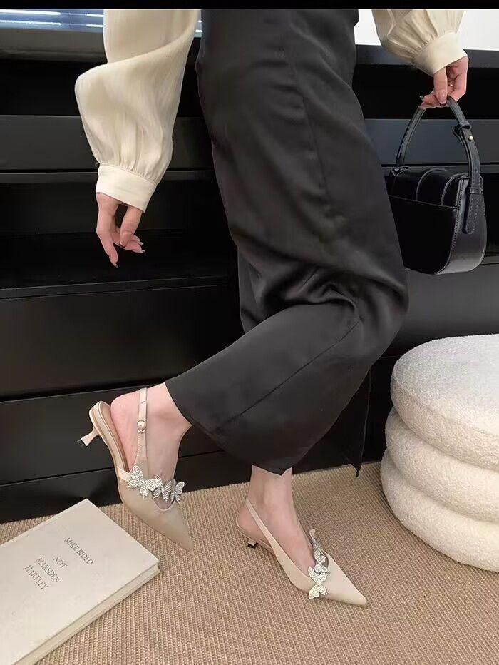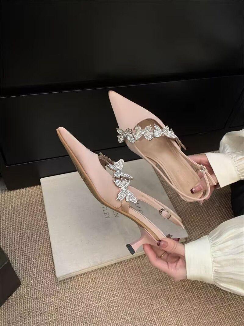 2025 Verano Nuevo Estilo Chino Puntiagudas Pedrería Sandalias de Punta Cerrada Mujer Mariposa Satén Tacones Altos Tacón de Aguja Unas Tiras Zapatos Individuales