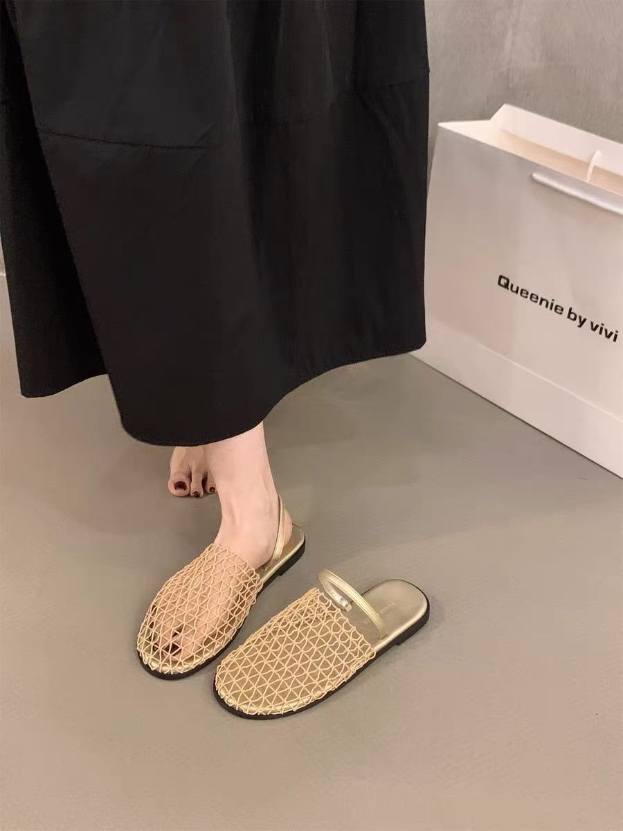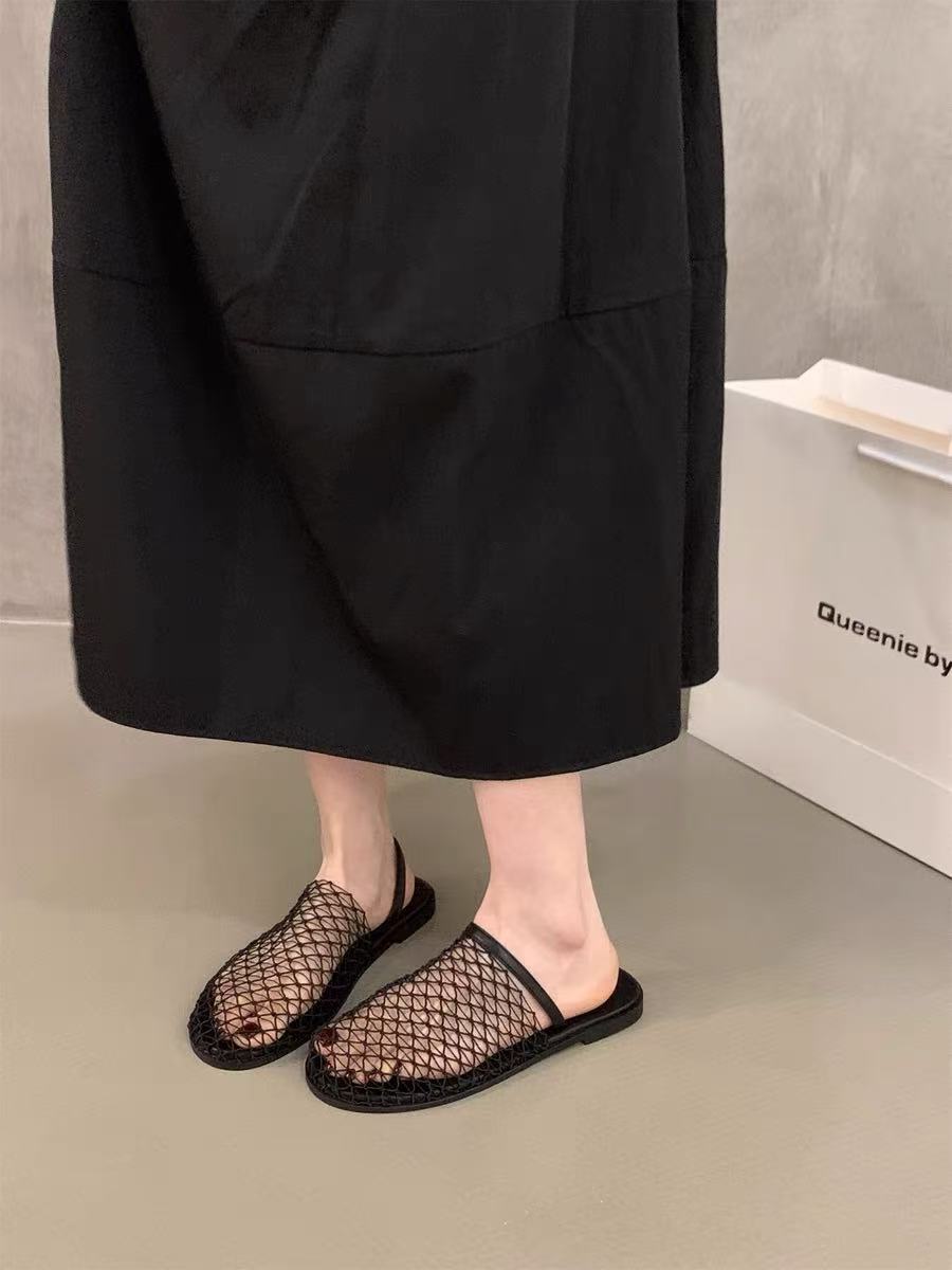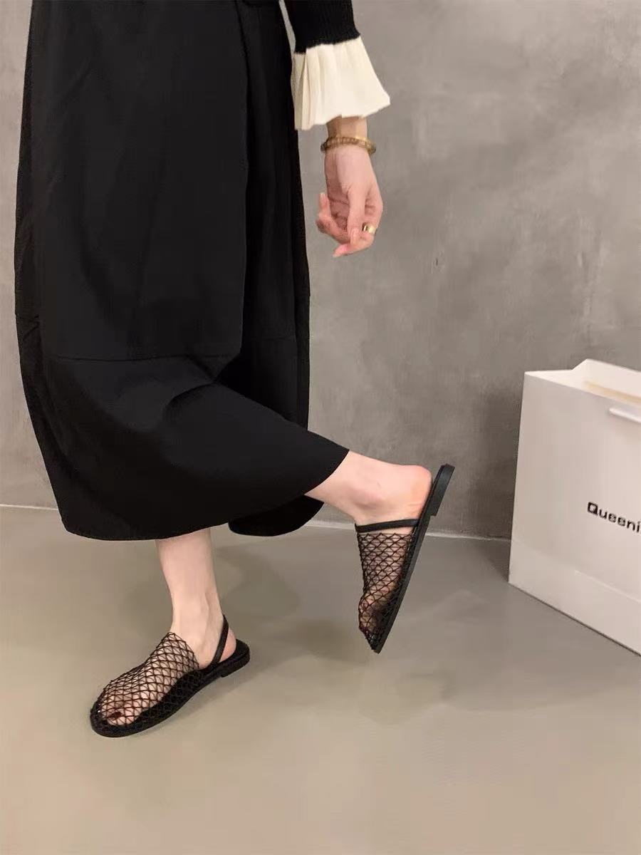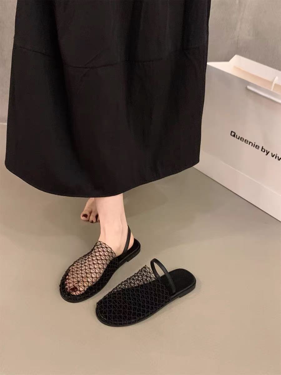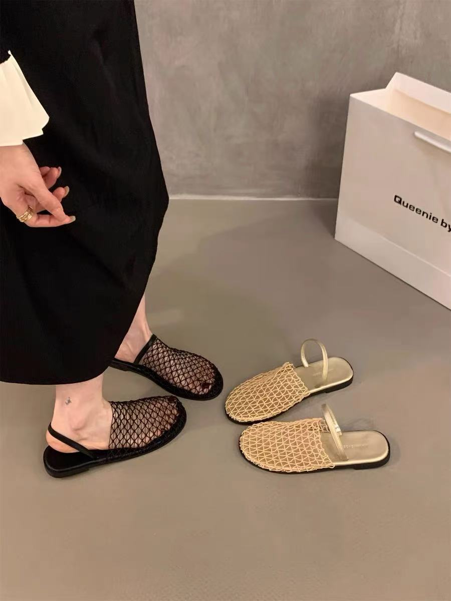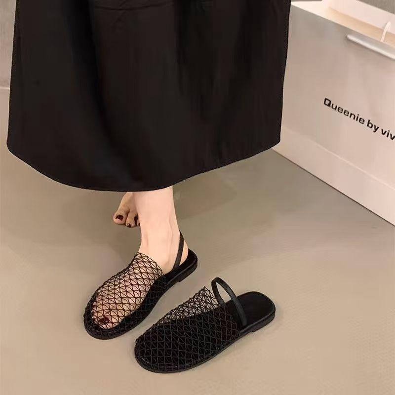 Pantuflas Casuales de Estilo Coreano de Una Tira Verano Nuevo Diseño de Moda Malla Tejida Calado Pantuflas de Punta Cerrada