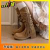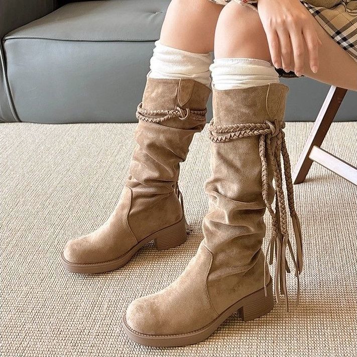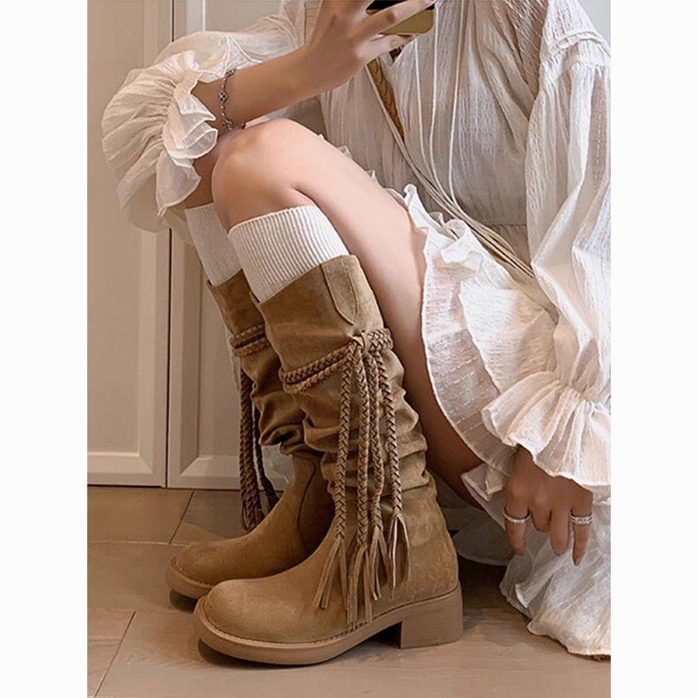 Botas Largas de Mujer Retro con Borlas y Tacón Alto por Encima de la Rodilla 2025 Primavera y Otoño Nueva Moda Botas Slouch de Tacón Grueso para Mujer