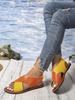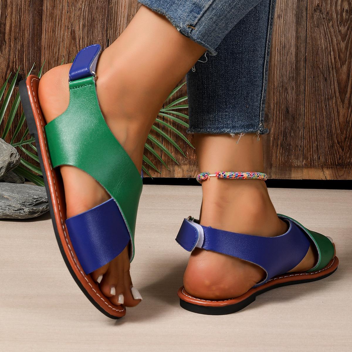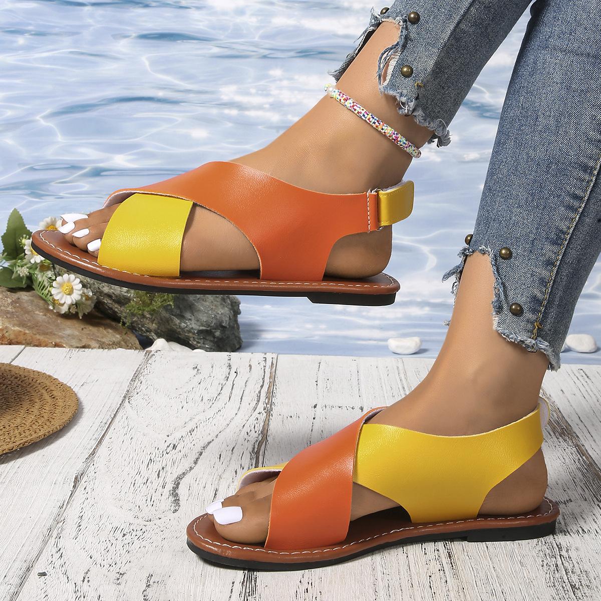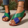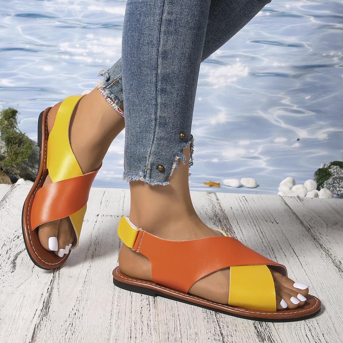 Sandalias planas de tiras cruzadas de gran tamaño para exportación europea y americana con bloques de color para mujer, estilo romano, banda ancha, punta redonda, punta abierta, sandalias de playa