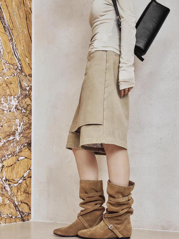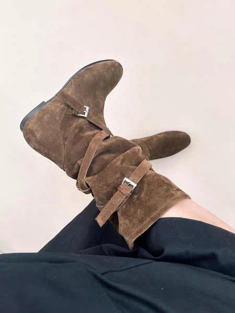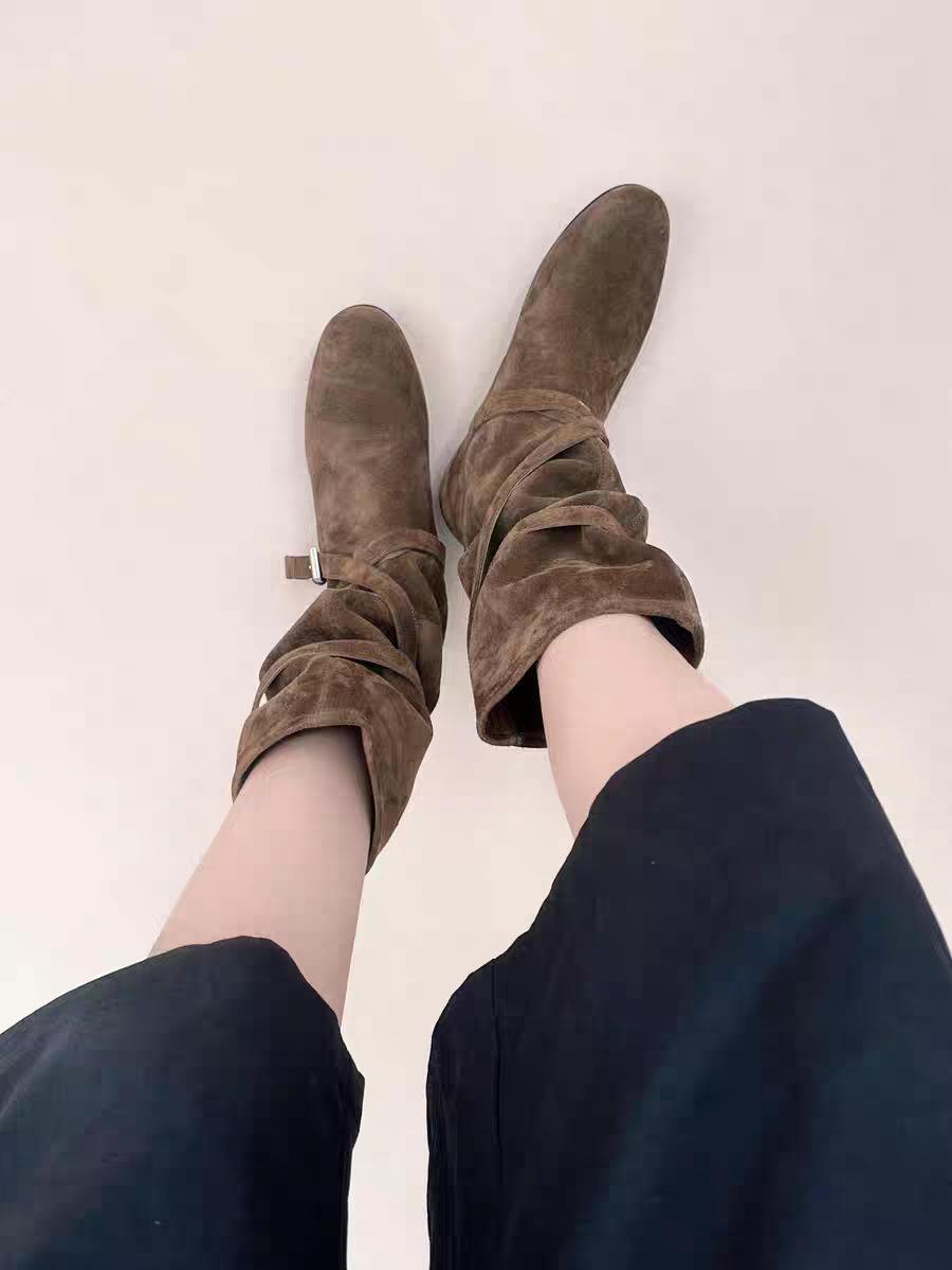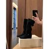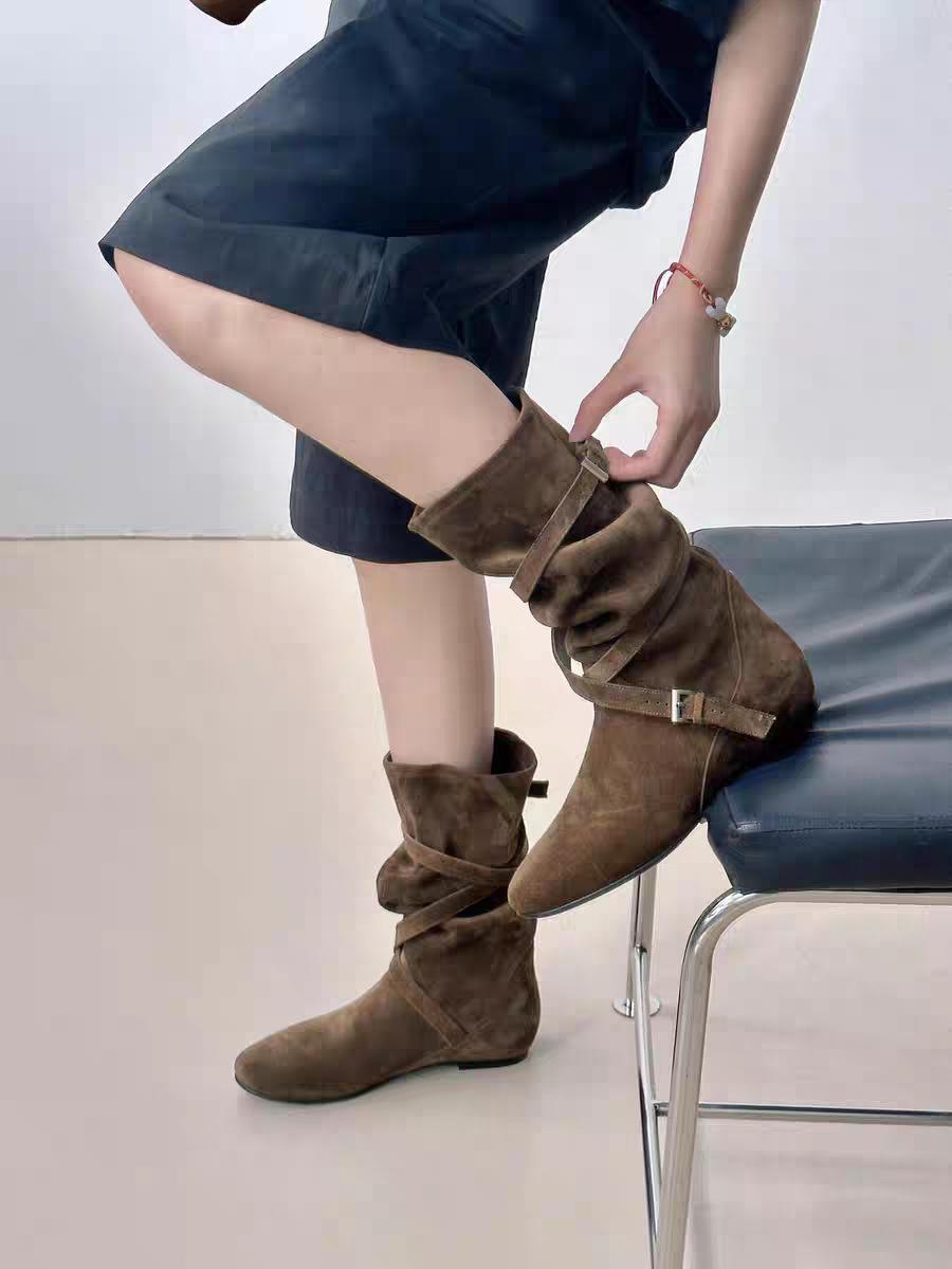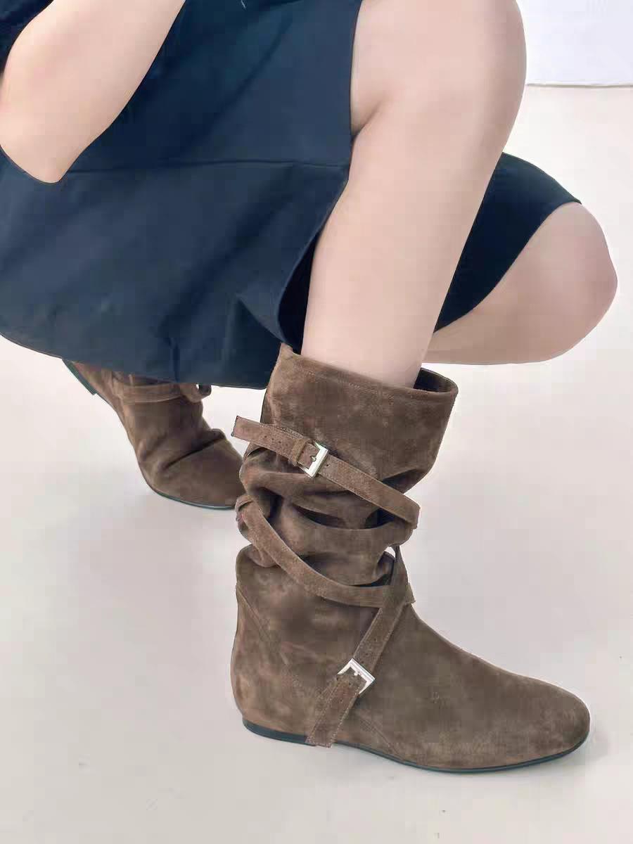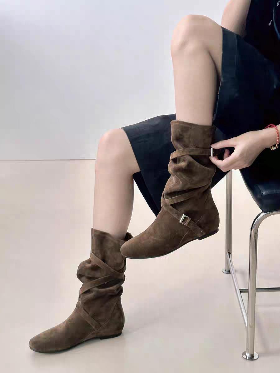 Aumenta altura 6cm~otoño 2025 nuevo estilo coreano punta redonda correa con hebilla suave plisado adelgazante retro desgastado botas media pantorrilla mujer