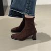 Botines Retro Franceses de Tacón Grueso para Mujer de Tubo Corto Otoño Invierno Empalmados Tacón Alto Punta Cuadrada Elásticos Adelgazantes