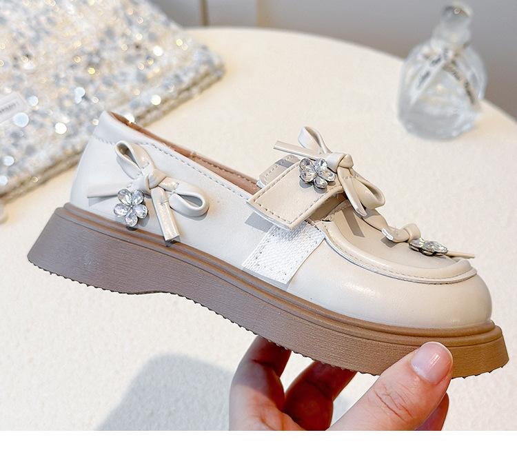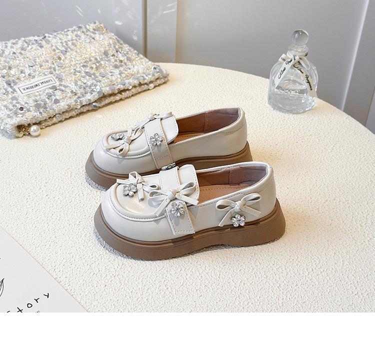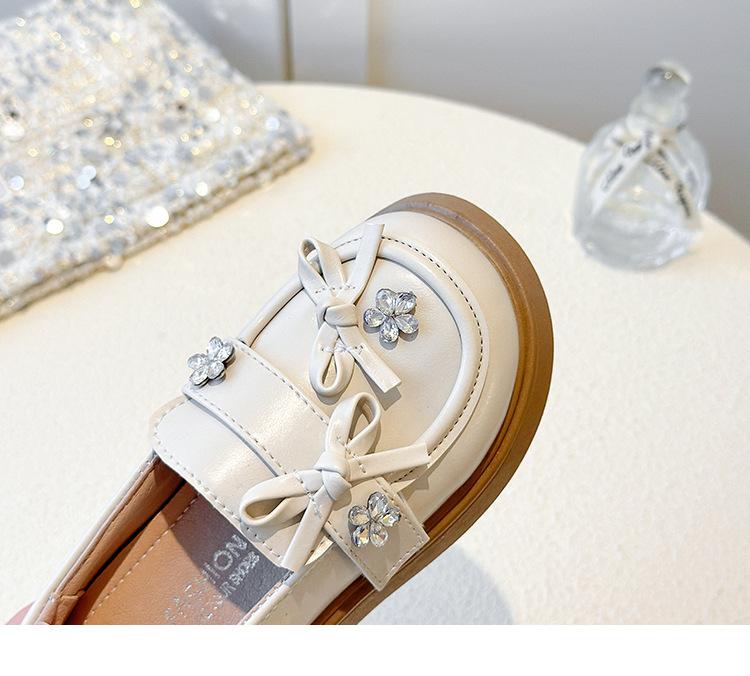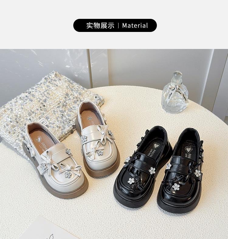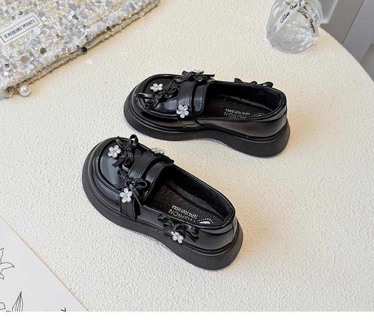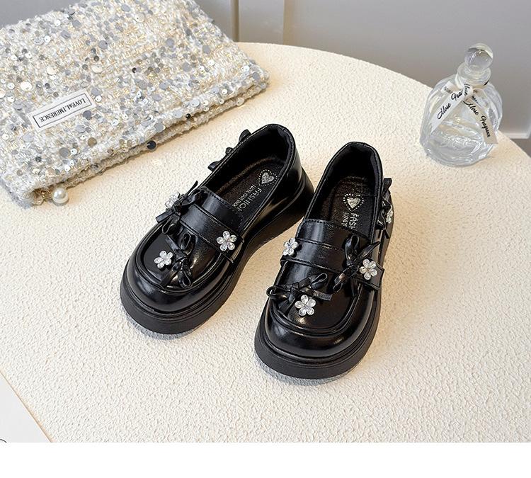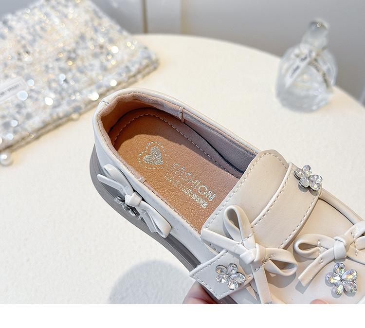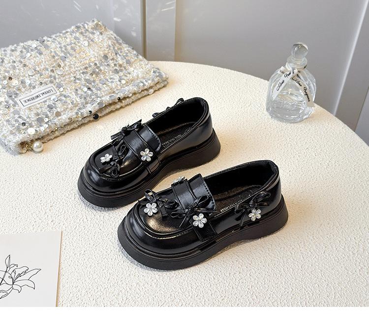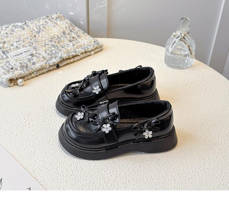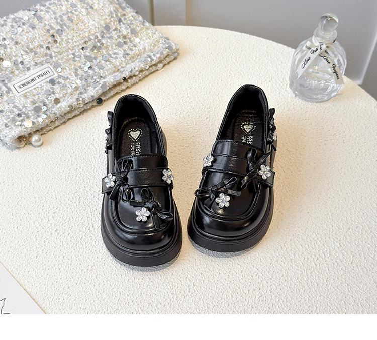 Zapatos de Princesa para Niñas Zapatos Individuales Otoño 2025 Nuevos Pedrería Desempeño Mocasines Niñas Lazo Zapatos de Cuero Negros