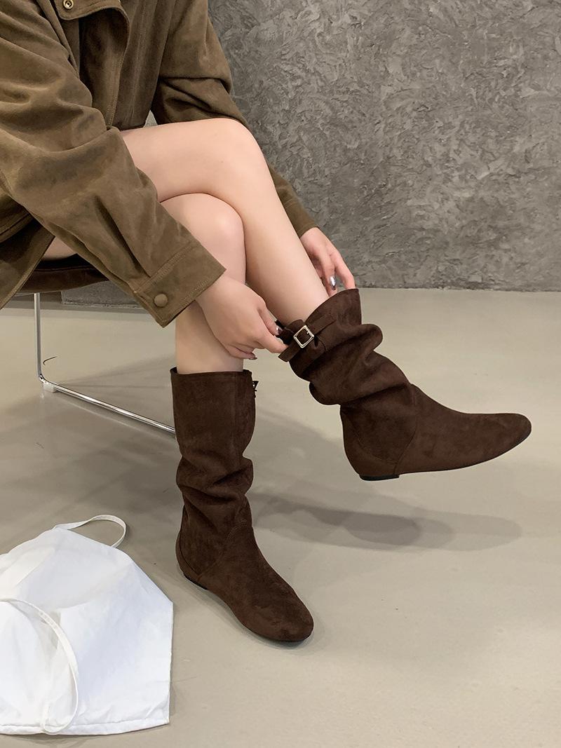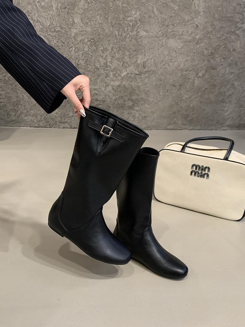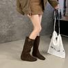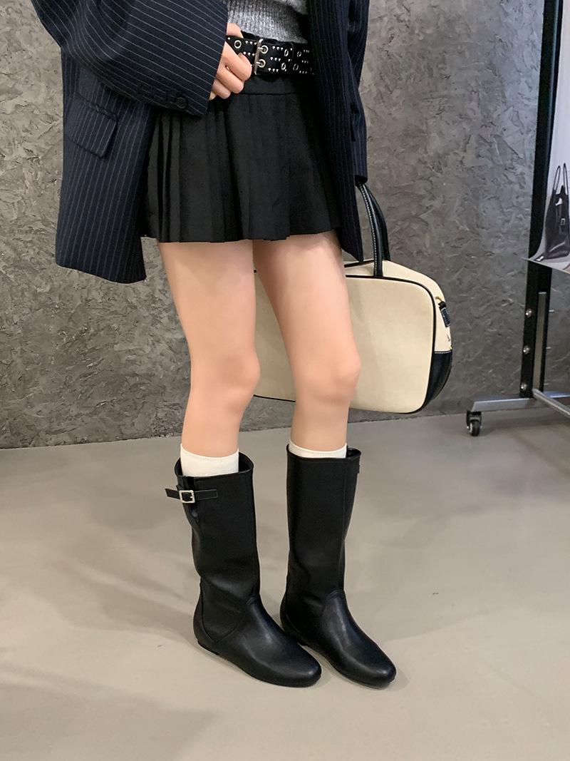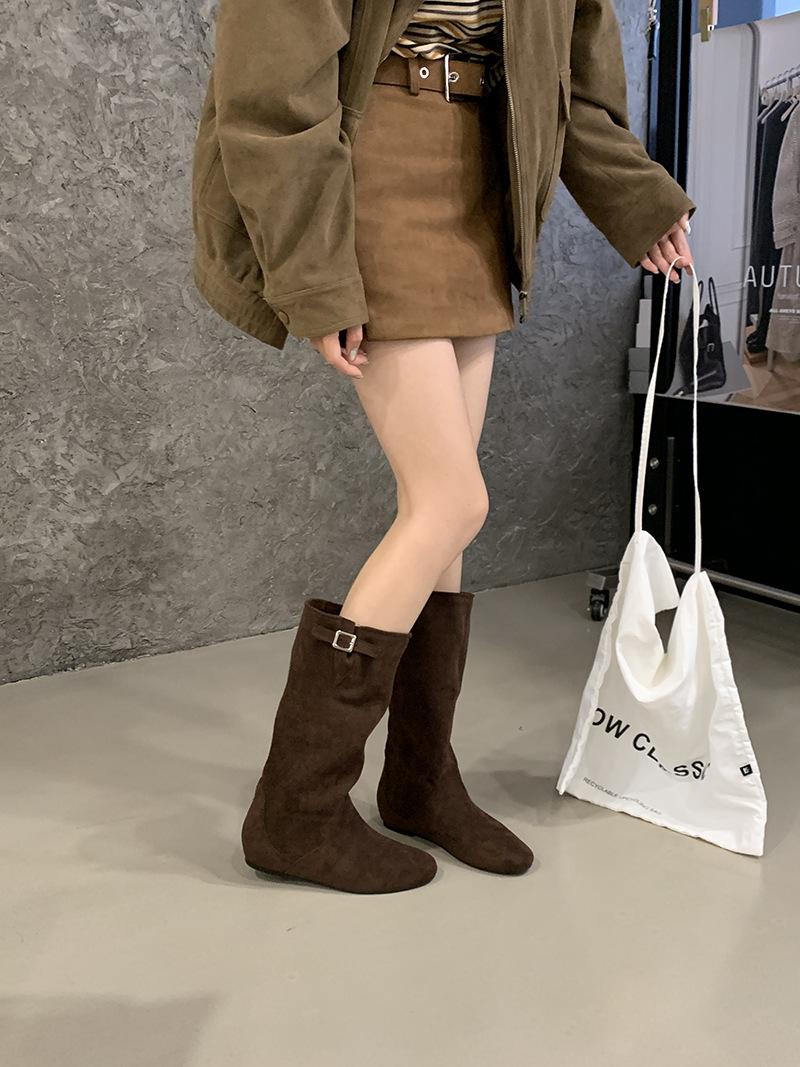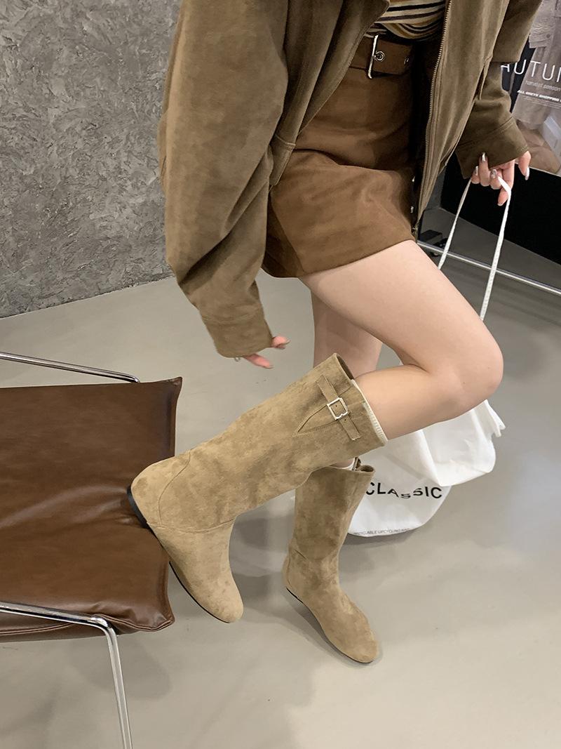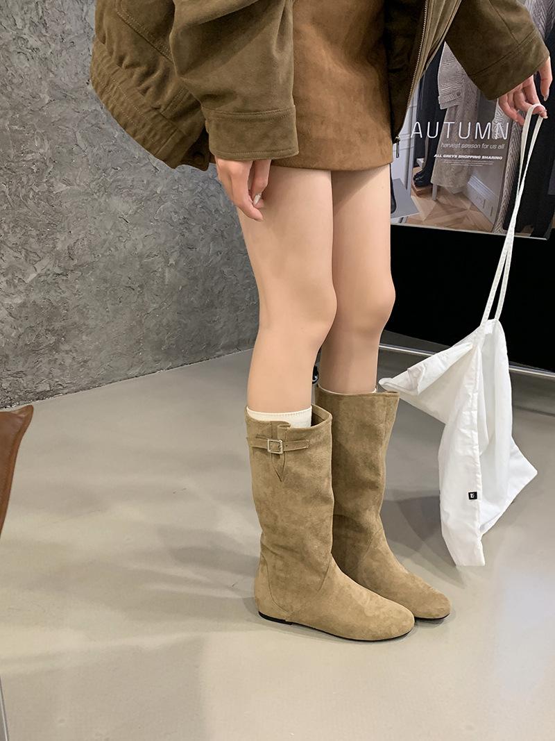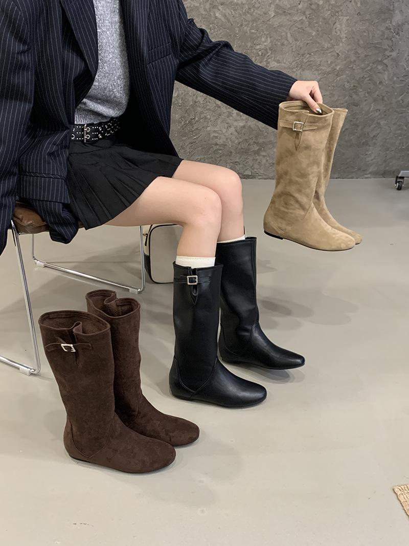 Botas de Cuero para Mujer Nuevas 2025 Otoño/Invierno Punta Redonda Botas de Media Caña Gamuza Caña Ancha de Meter Botas Simples para Exterior Botas Negras