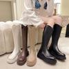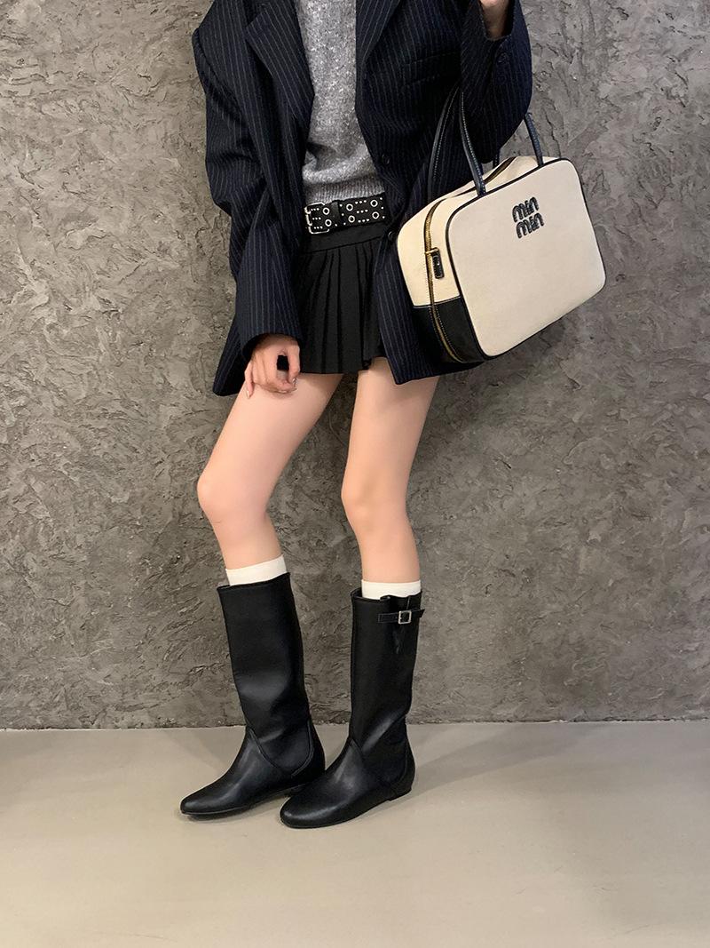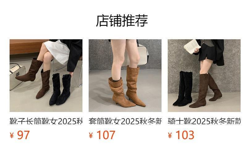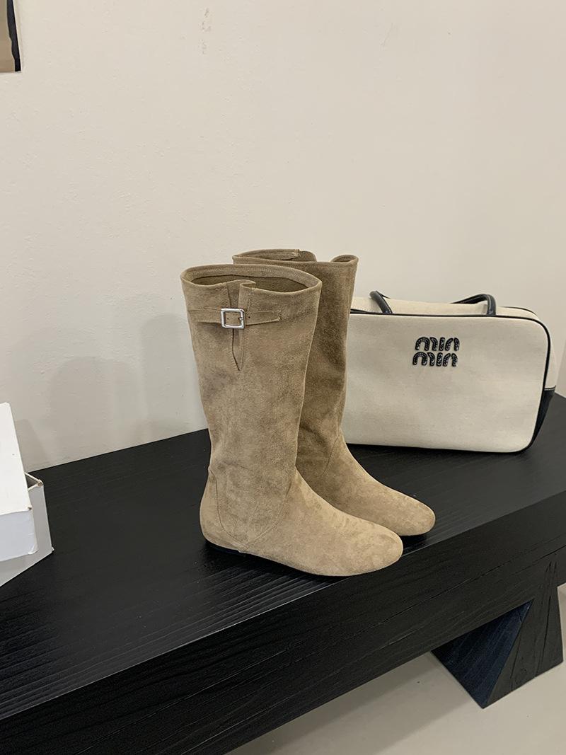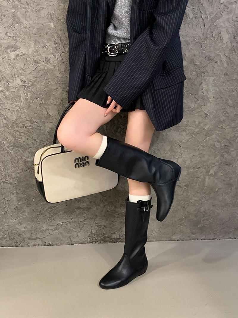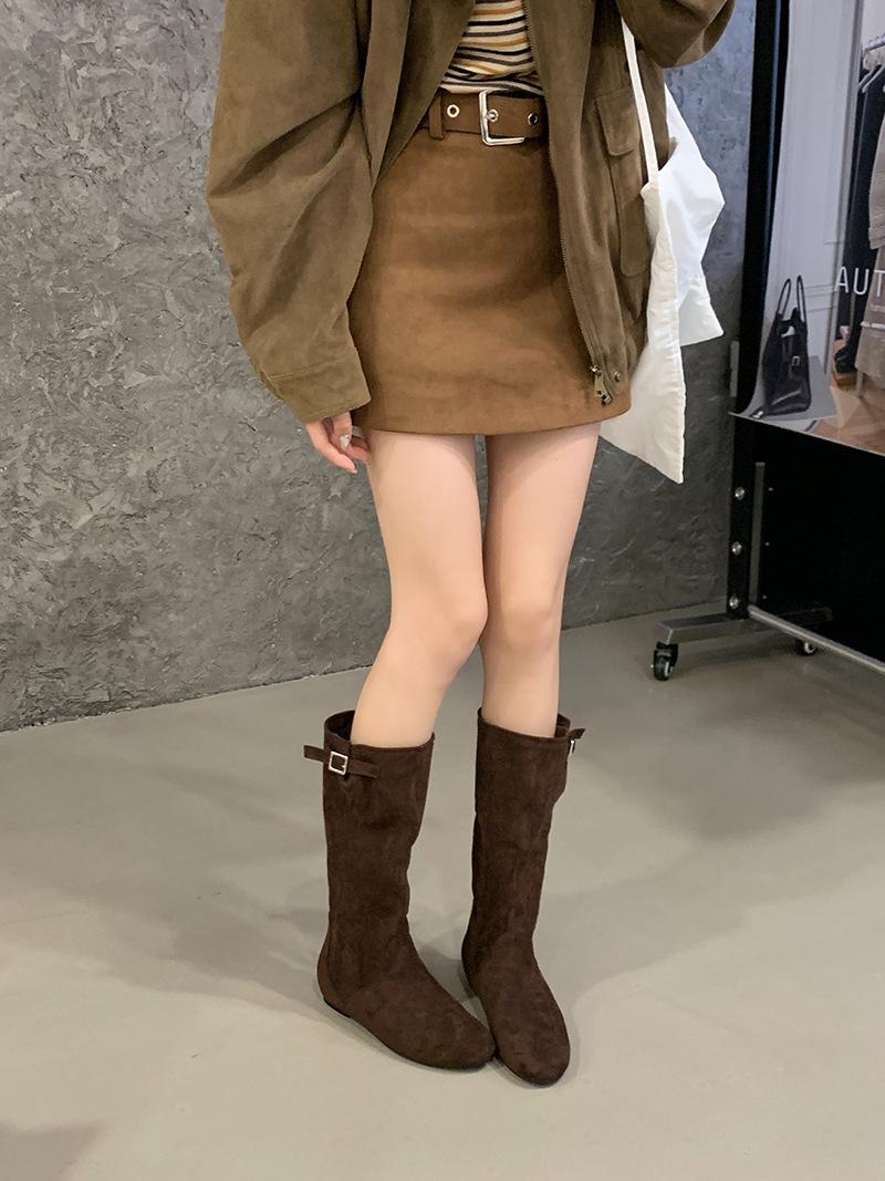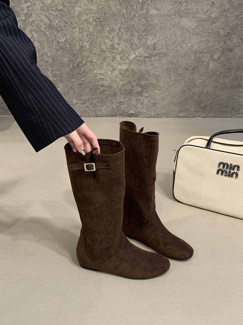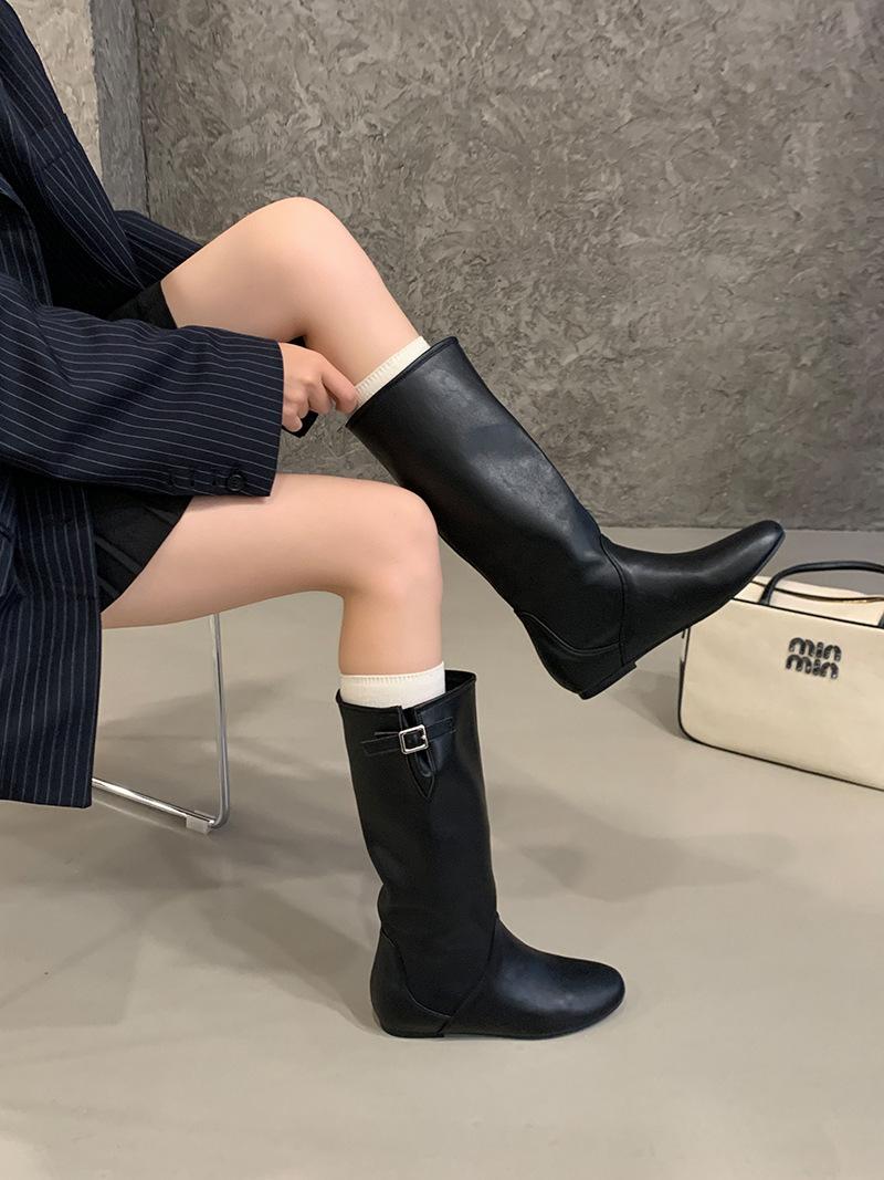 Botas de Cuero para Mujer Nuevas 2025 Otoño/Invierno Punta Redonda Botas de Media Caña Gamuza Caña Ancha de Meter Botas Simples para Exterior Botas Negras