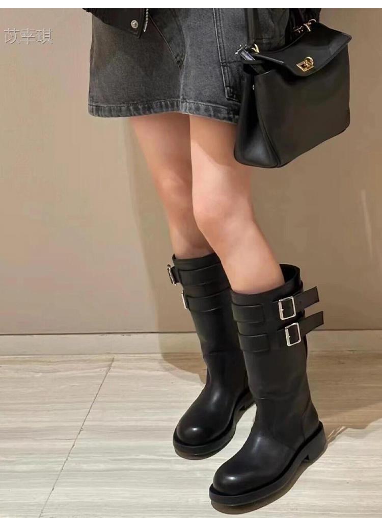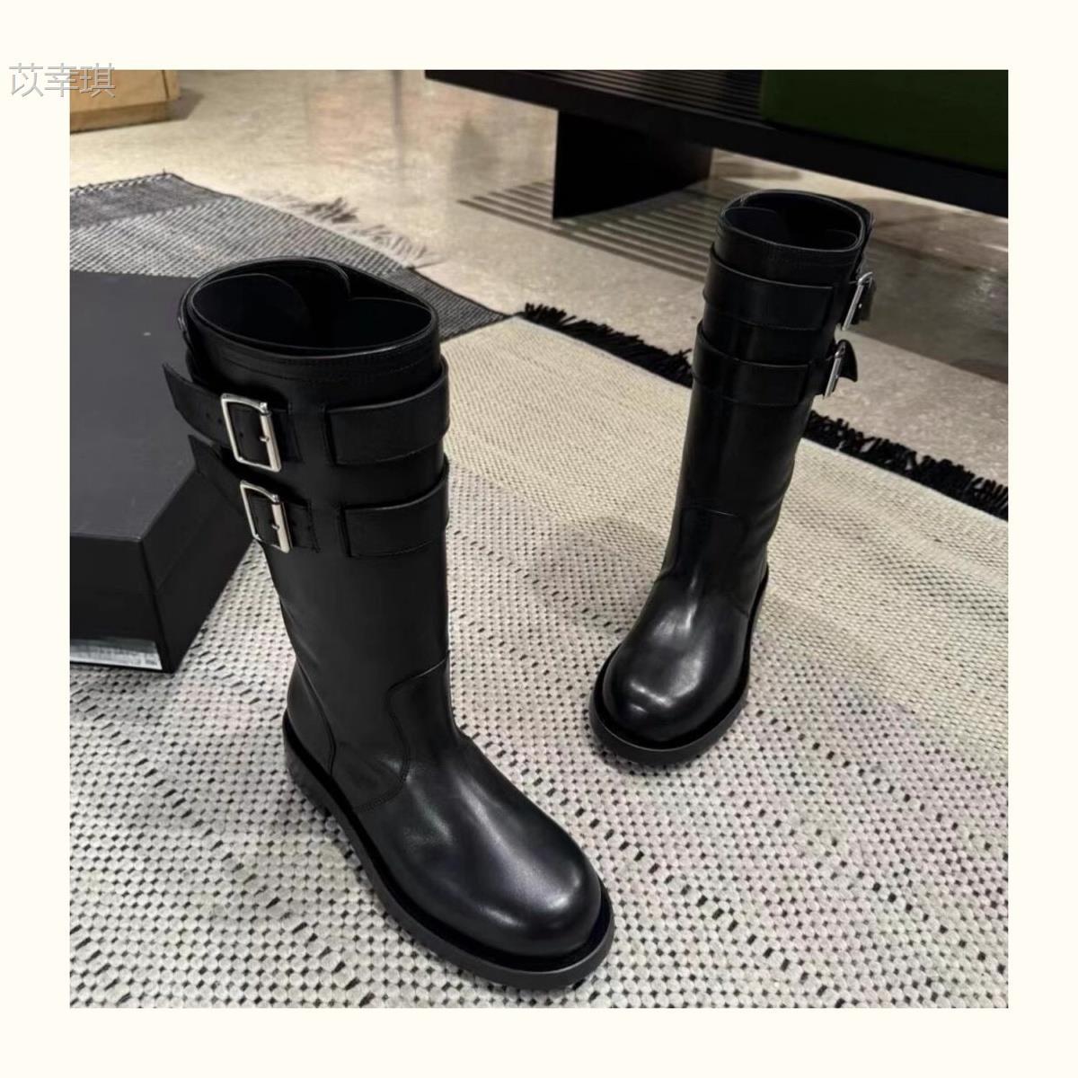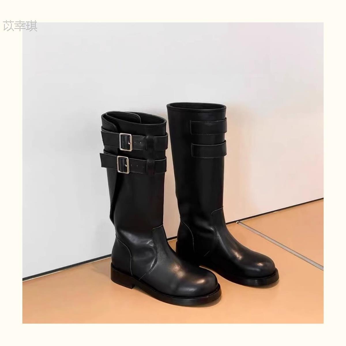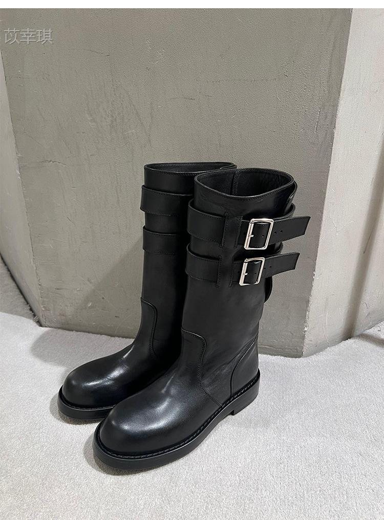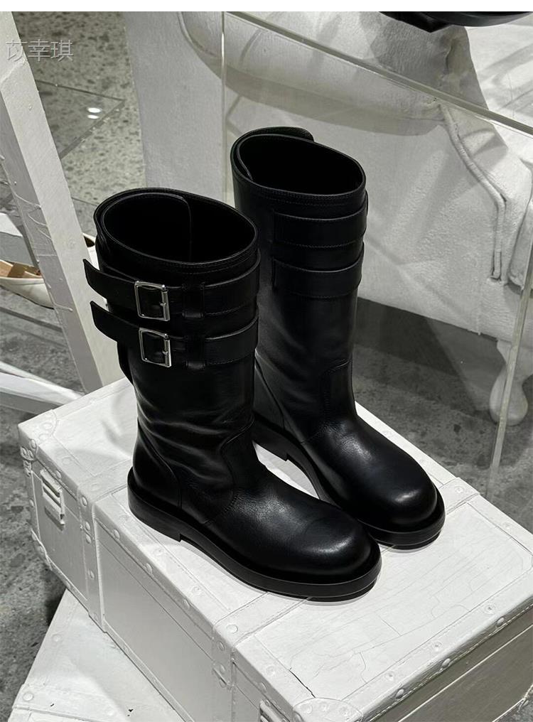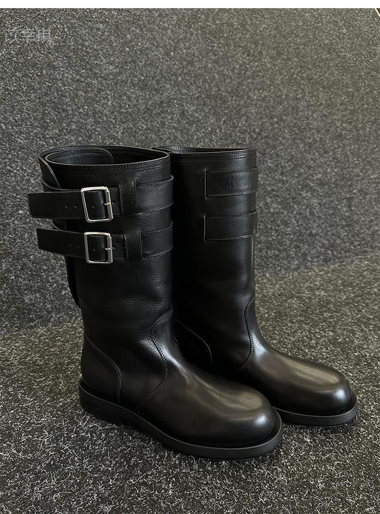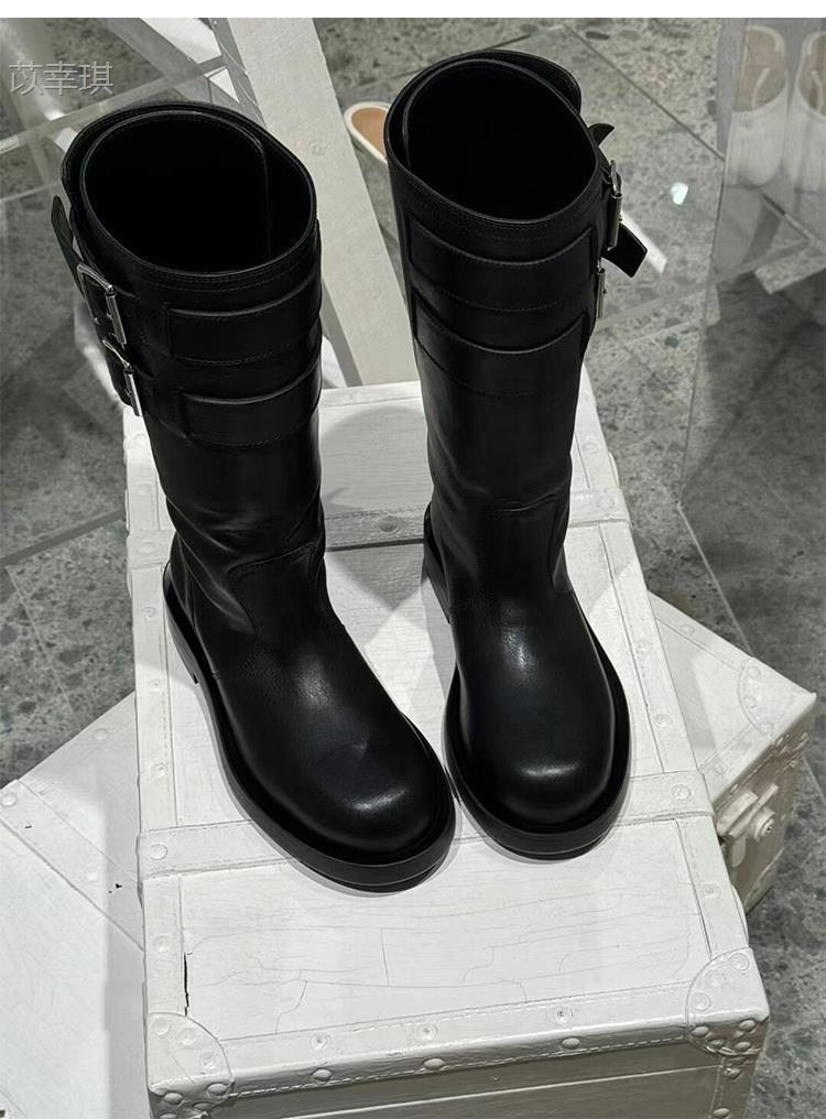 Versión de piel de vaca~Botas de motociclista retro de cuero genuino botas de caballero para mujer tacón grueso sobre la rodilla botas largas hasta media pantorrilla adelgazantes botas Martin