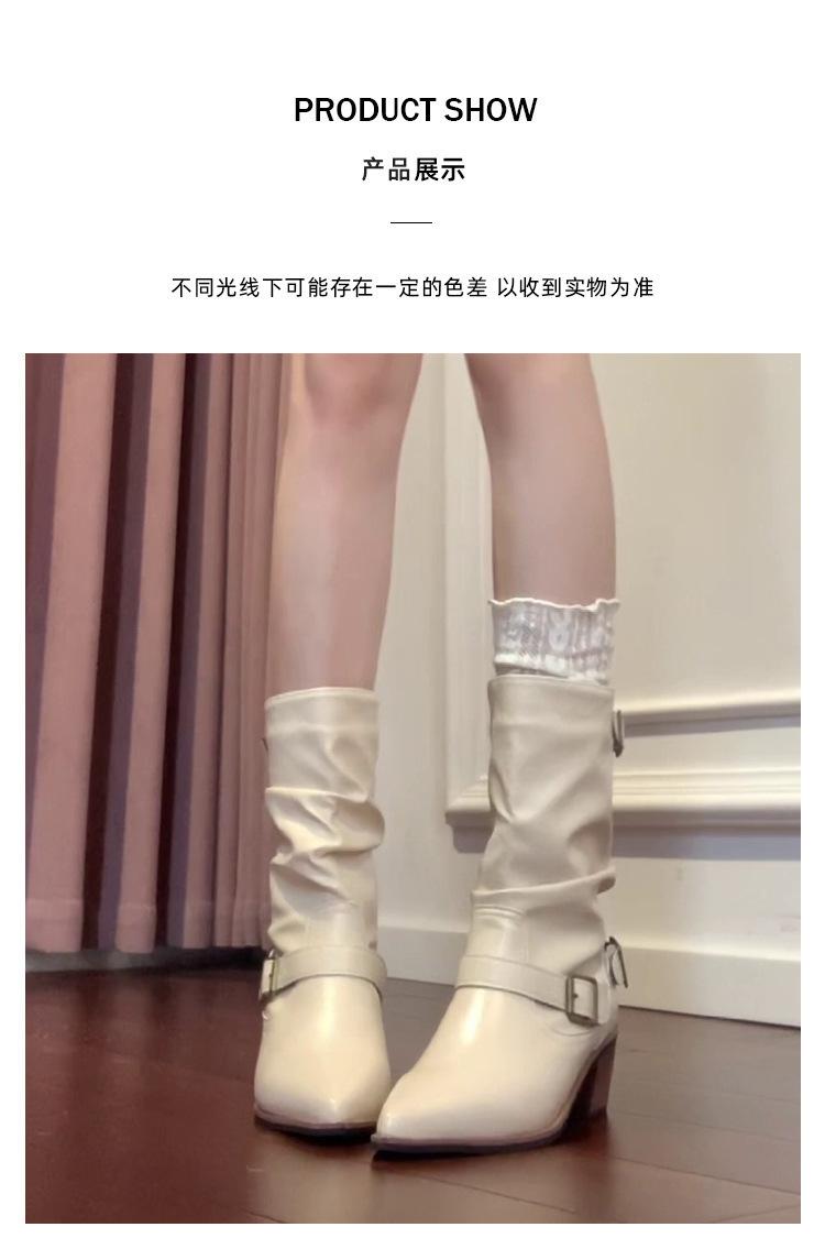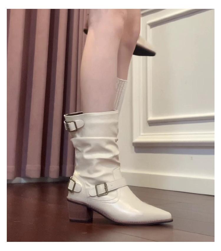 Punta Puntiaguda Hebilla de Cinturón Botines al Tobillo de Tacón Grueso Blanco para Mujer Adelgazantes Temperamento Francés Botas de Caballero Botas de Vaquero Occidental