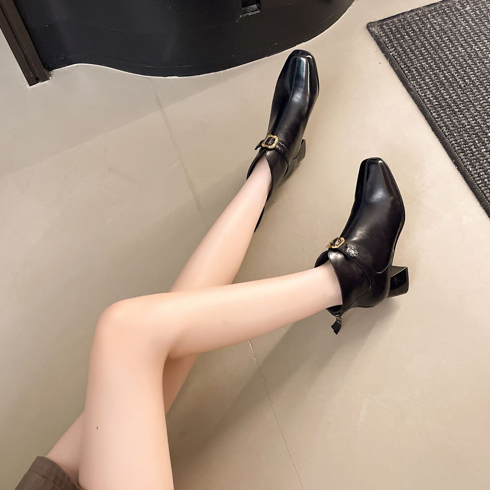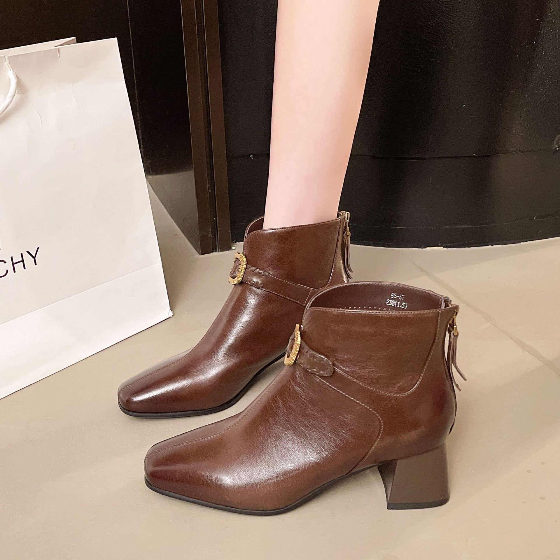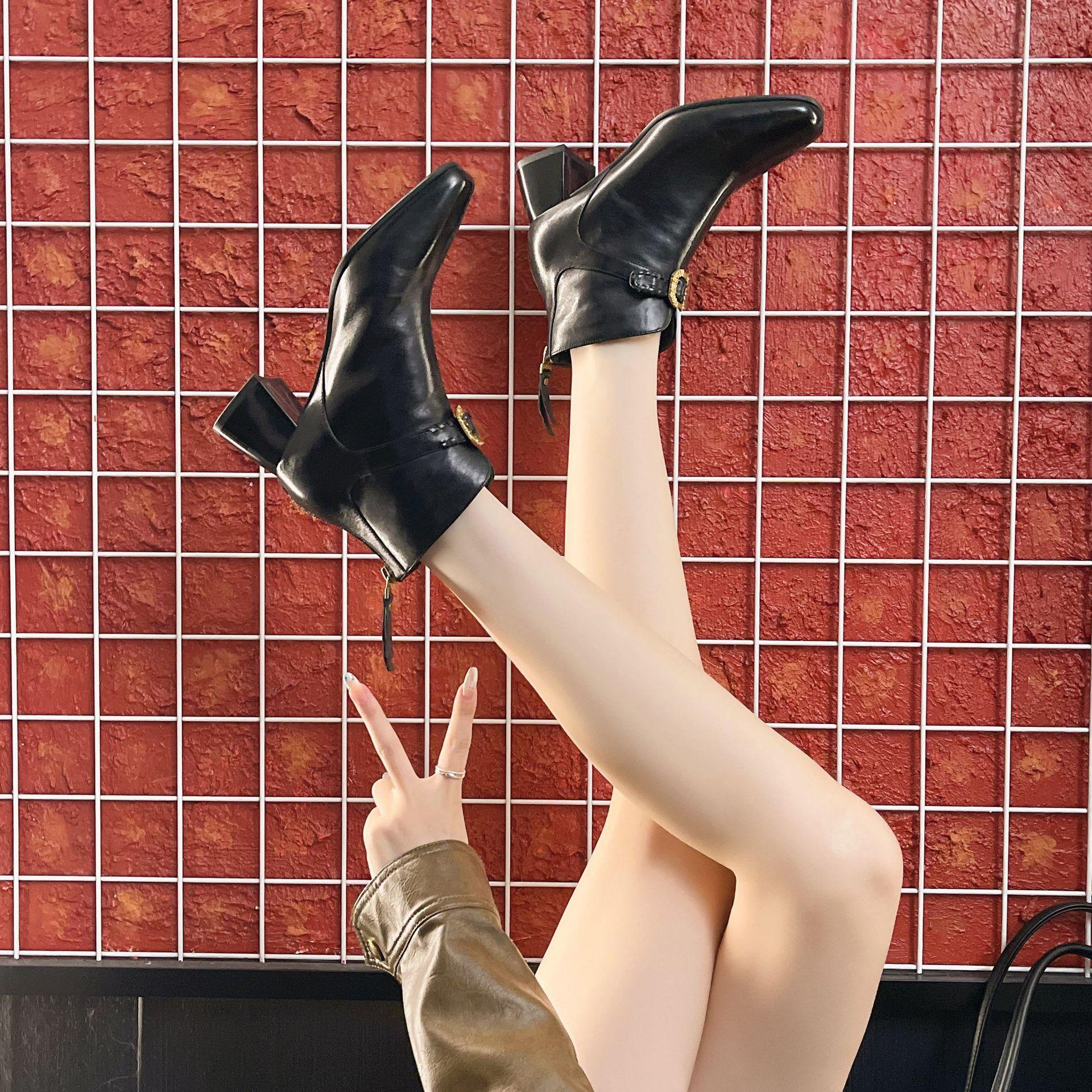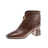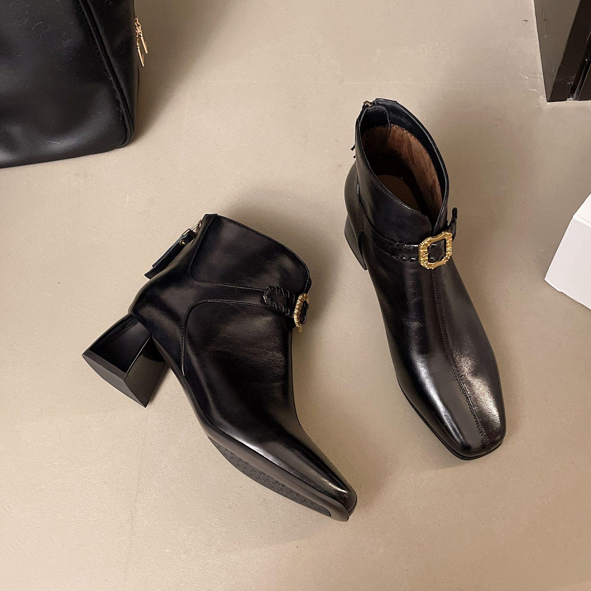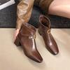 Capa Superior Piel de Oveja Punta Cuadrada Botines al Tobillo Mujer 2025 Otoño/Invierno Nuevo Estilo Hebilla Moda Botas de Cuero Tacón Grueso Temperamento Adelgazantes