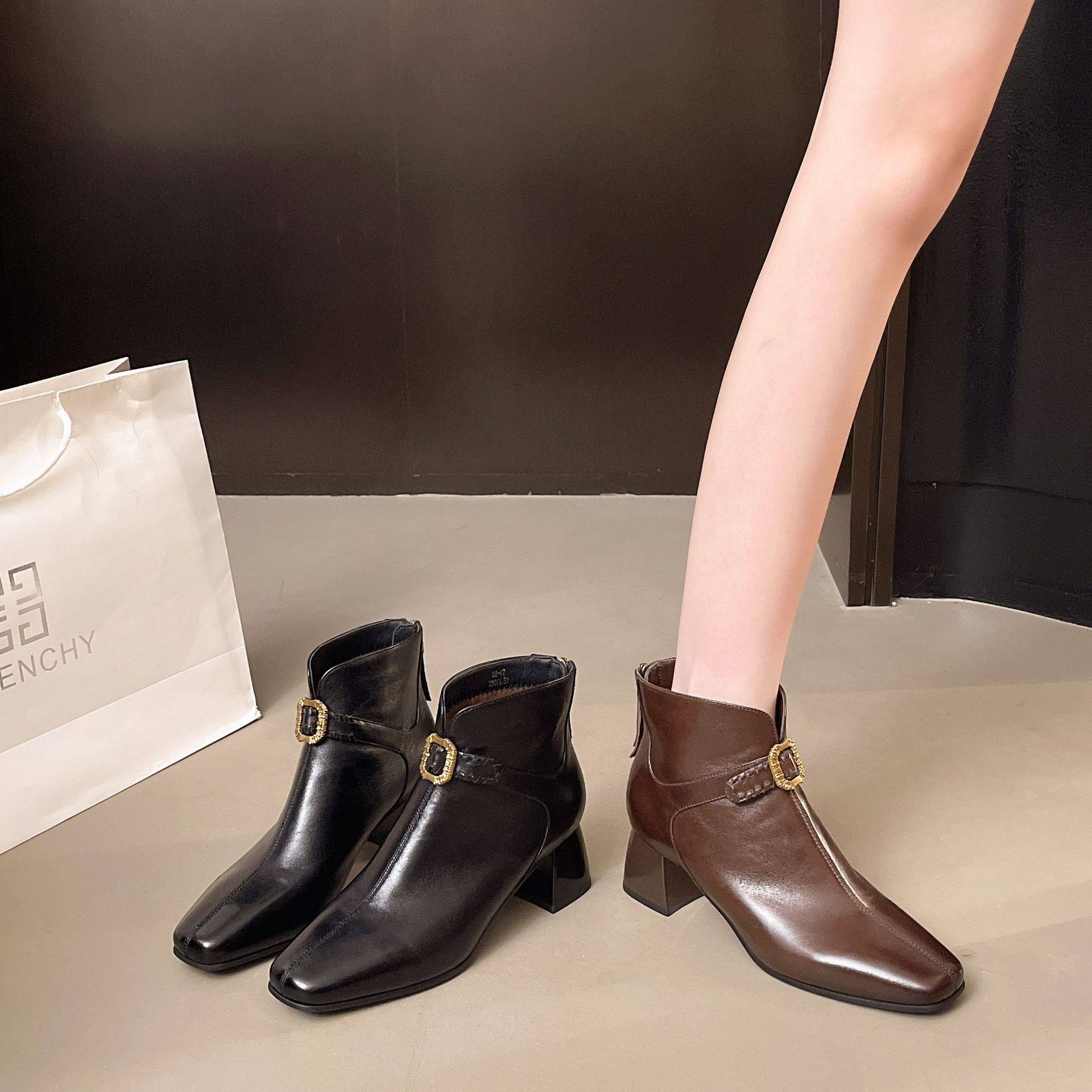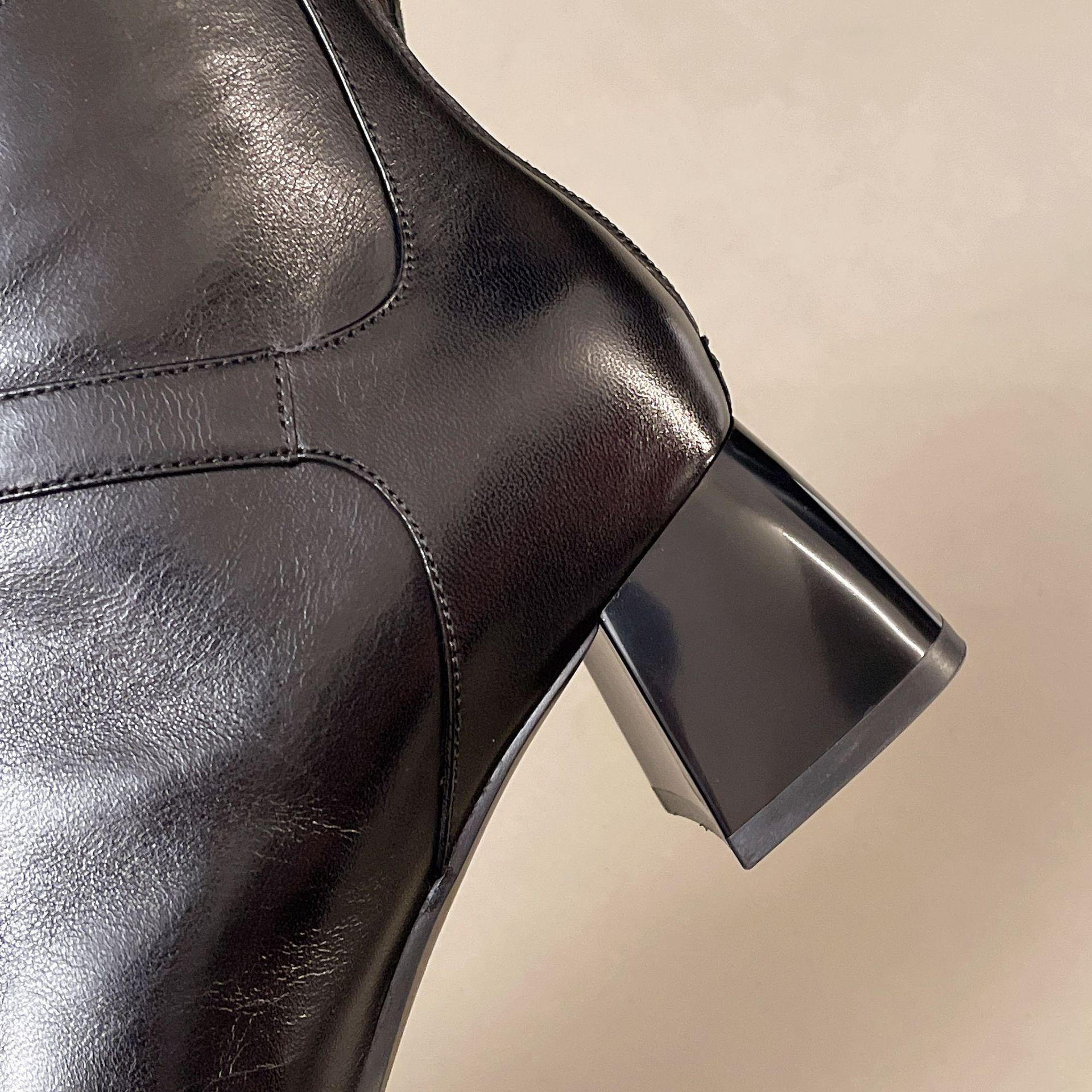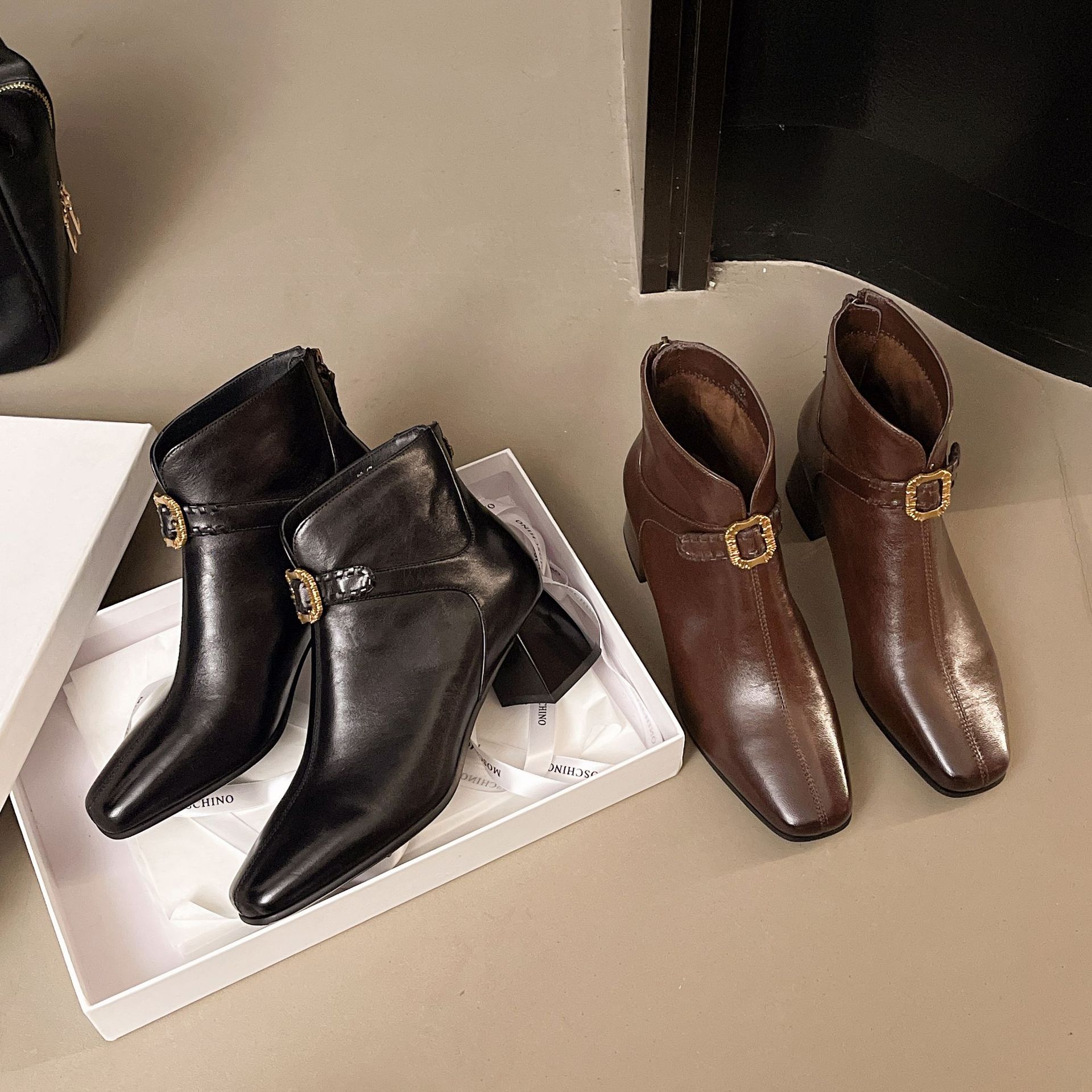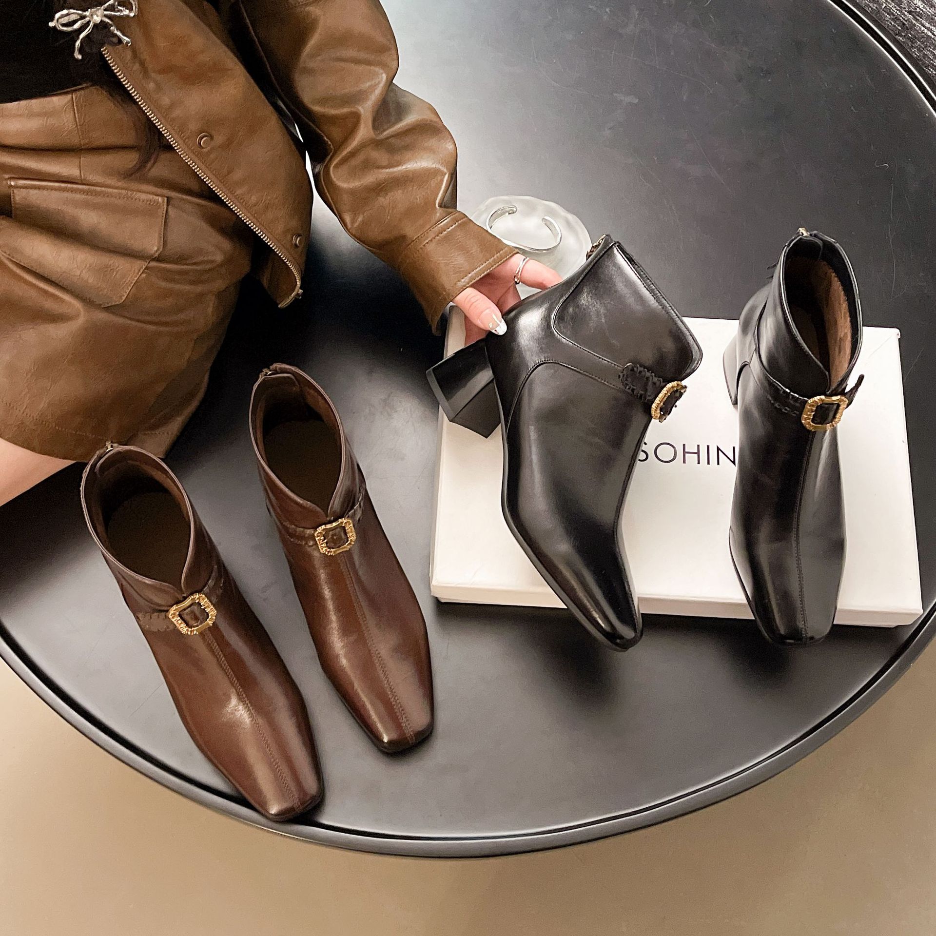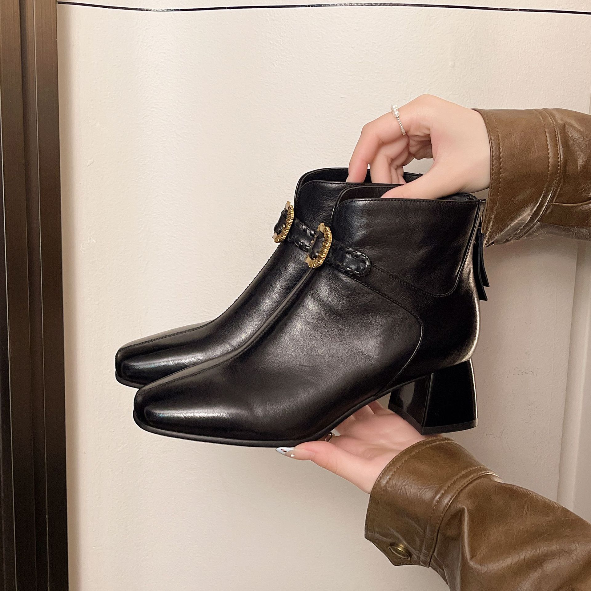 Capa Superior Piel de Oveja Punta Cuadrada Botines al Tobillo Mujer 2025 Otoño/Invierno Nuevo Estilo Hebilla Moda Botas de Cuero Tacón Grueso Temperamento Adelgazantes