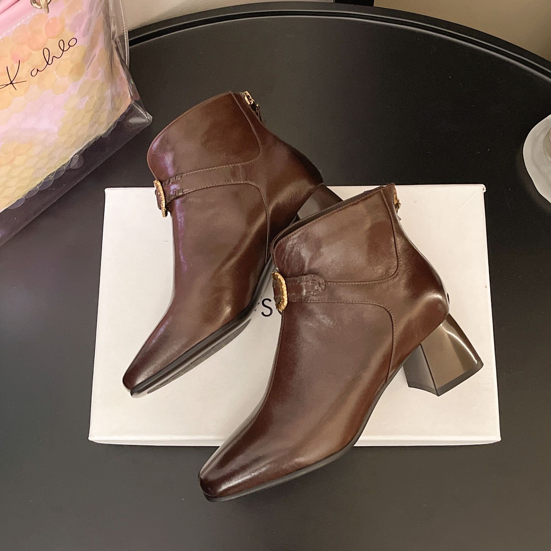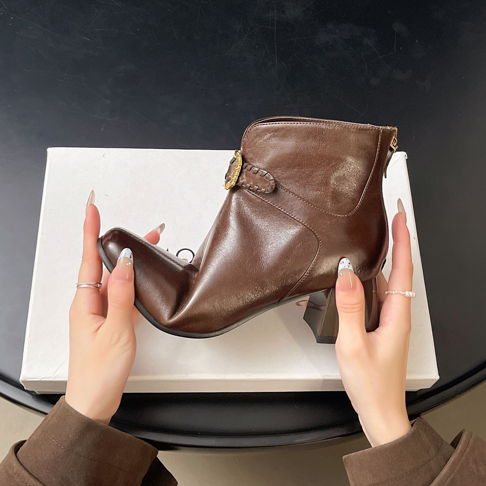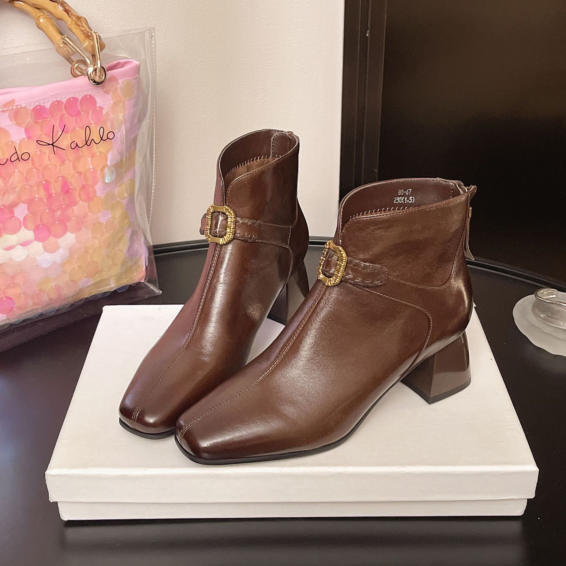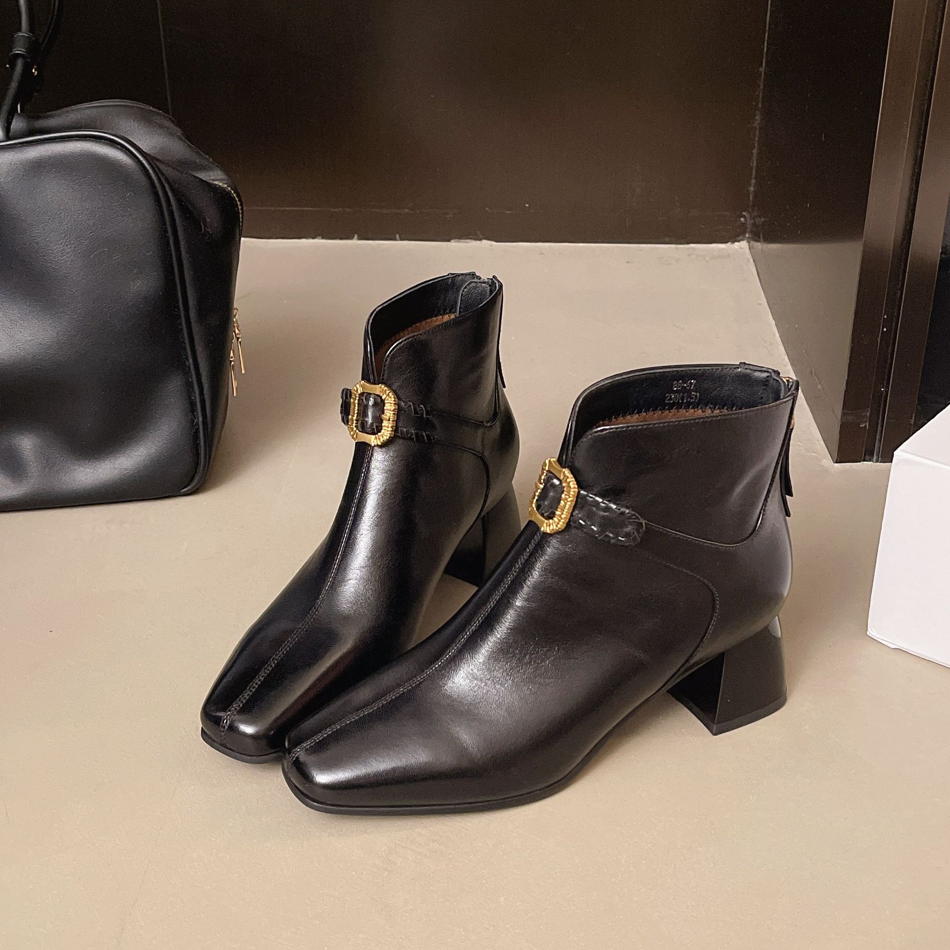 Capa Superior Piel de Oveja Punta Cuadrada Botines al Tobillo Mujer 2025 Otoño/Invierno Nuevo Estilo Hebilla Moda Botas de Cuero Tacón Grueso Temperamento Adelgazantes