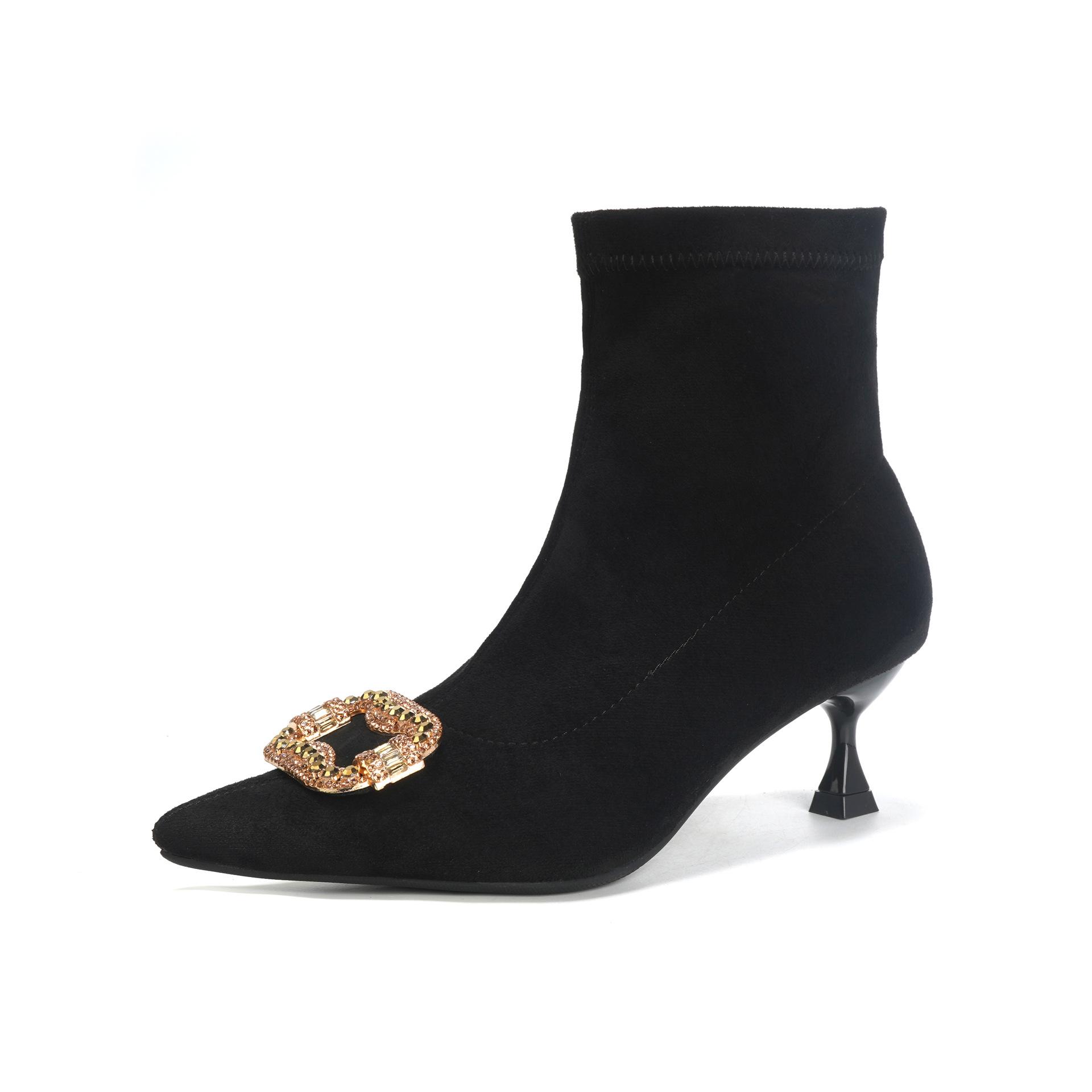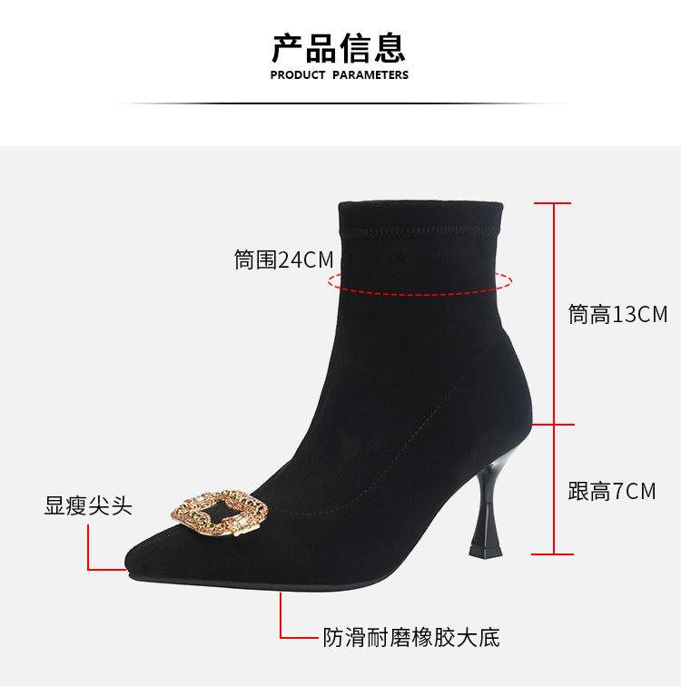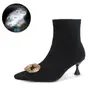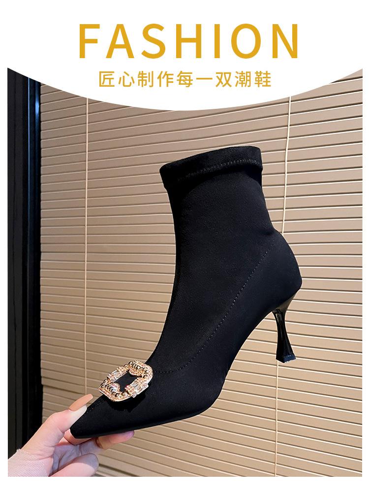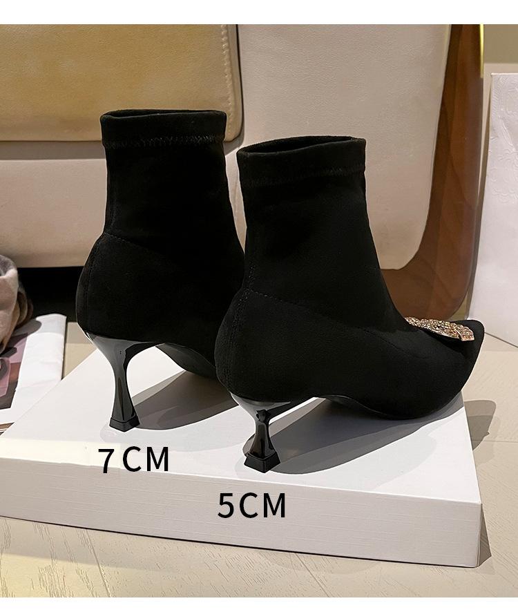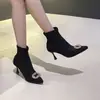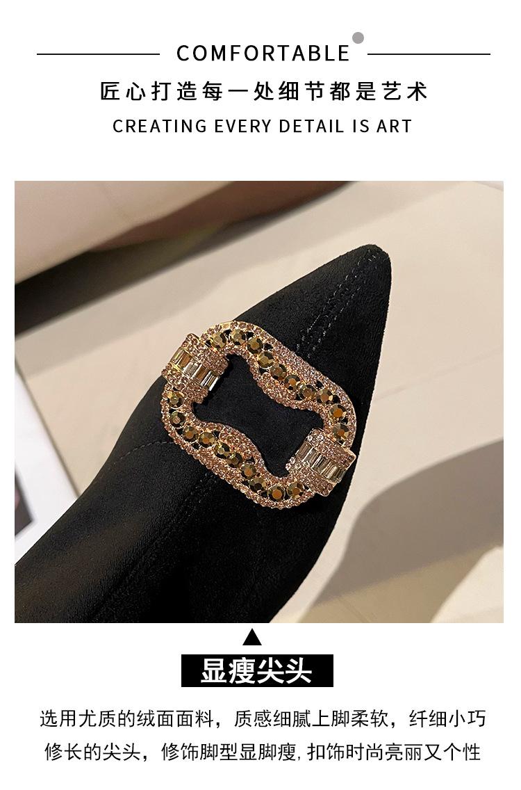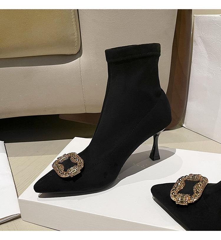 Botines de Tobillo de Tacón Alto con Punta Afilada y Hebilla Cuadrada de Pedrería para Mujer Otoño Invierno Nuevo Estilo Tacón de Aguja Gamuza Negra Elásticos Adelgazantes Botines de Tobillo Botines Calcetín