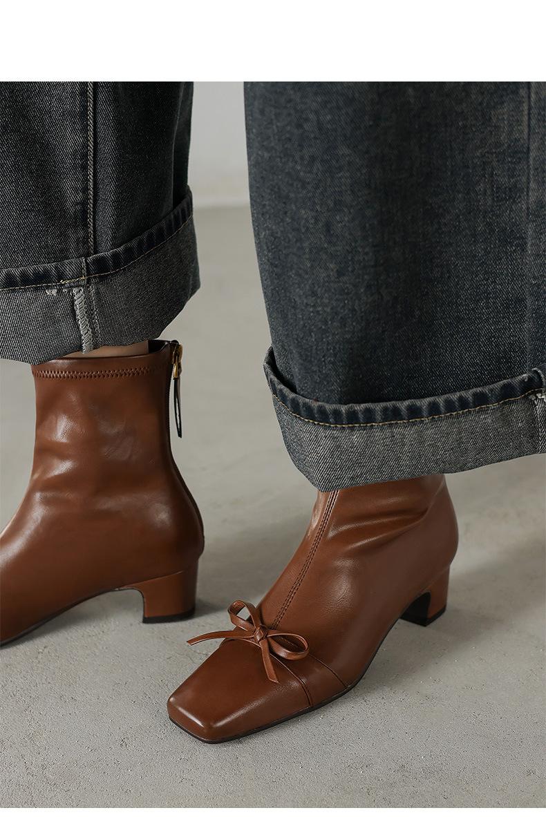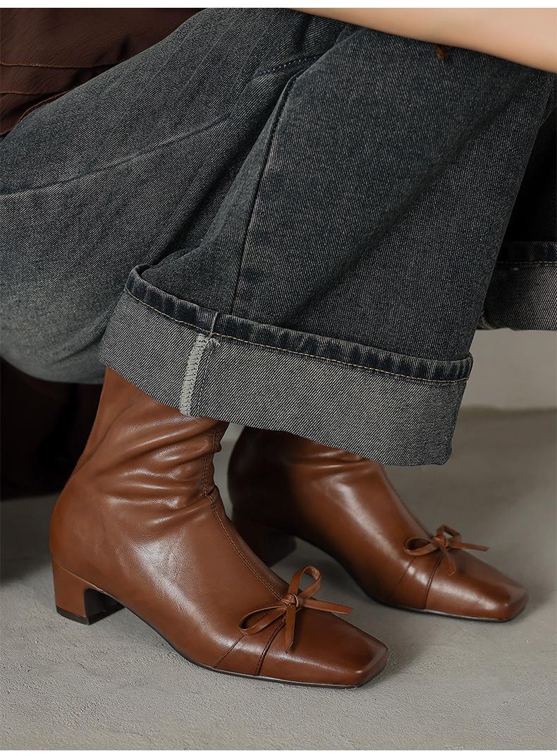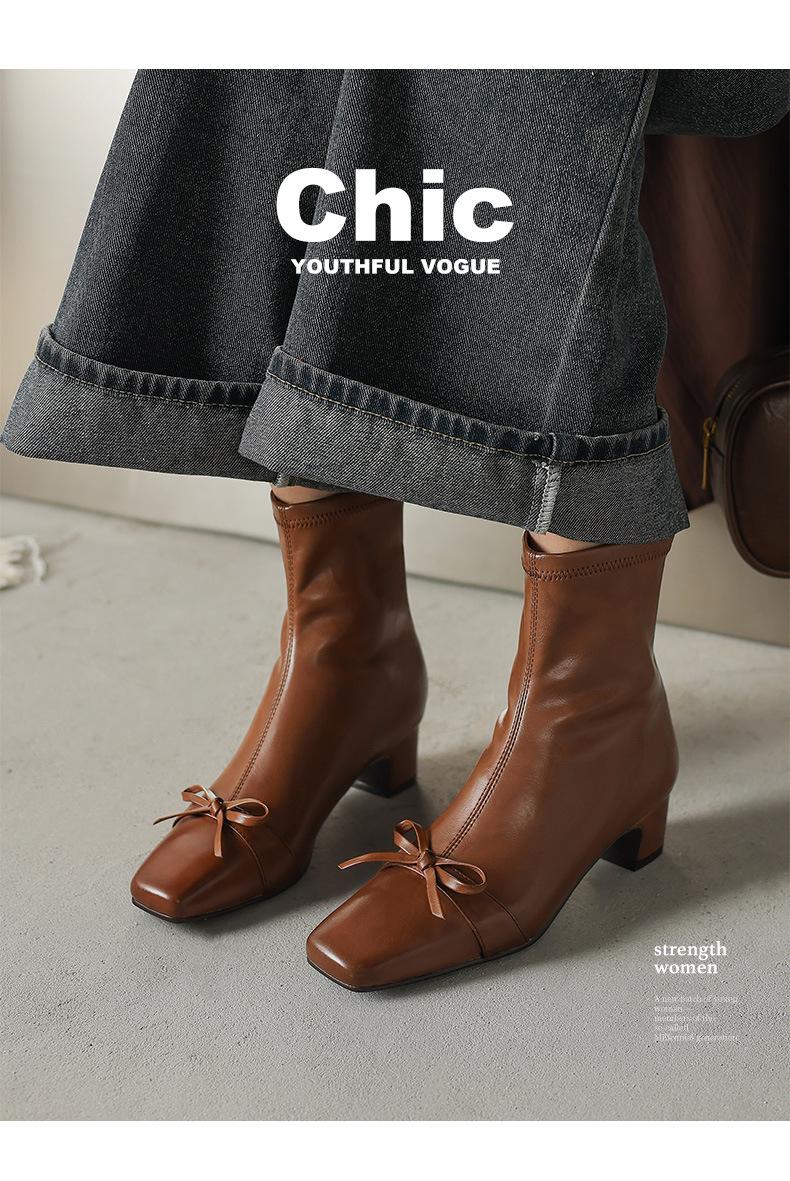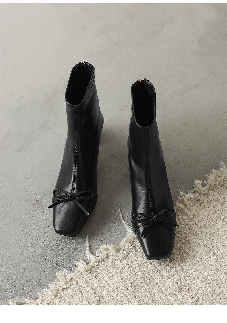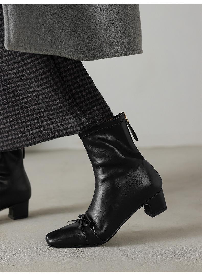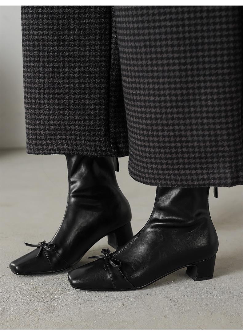 2025 Otoño/Invierno Nuevas Botas de Piel de Oveja Punta Cuadrada Tacón Grueso Lazo Estilo Coreano Elásticas Adelgazantes Botines de Tobillo de Tacón Alto Francés Botas de Mujer