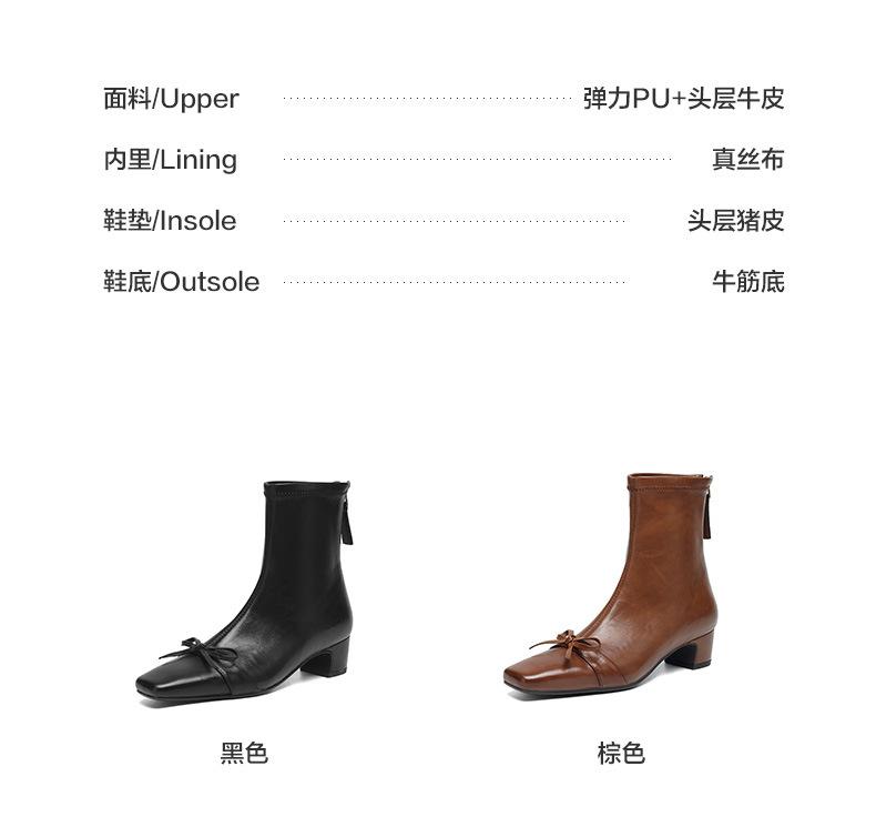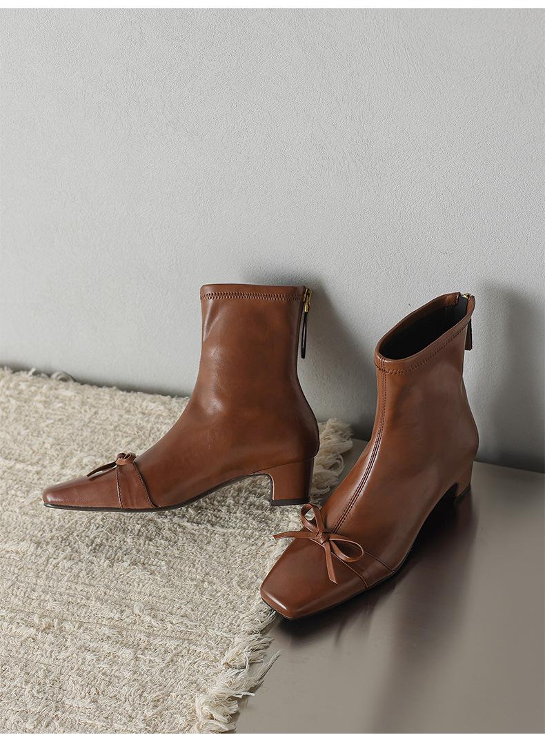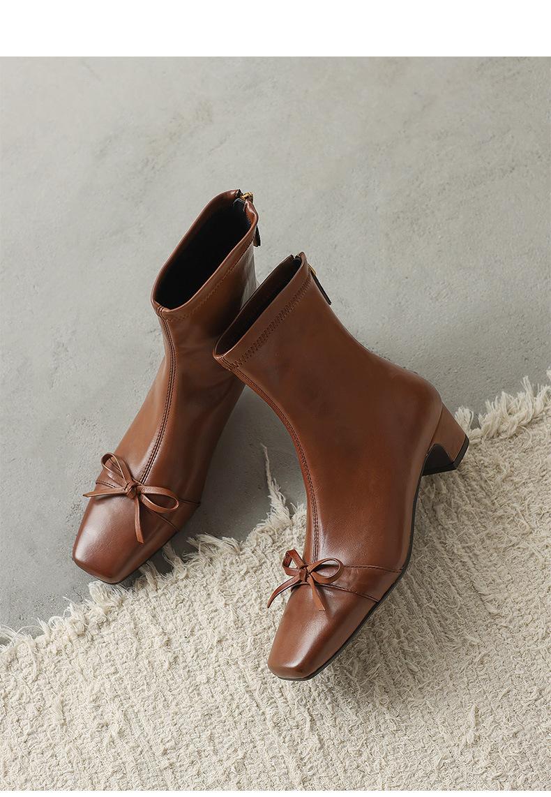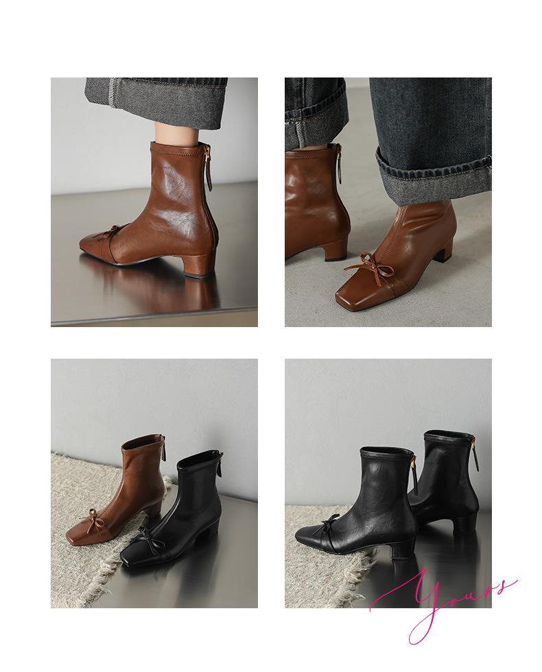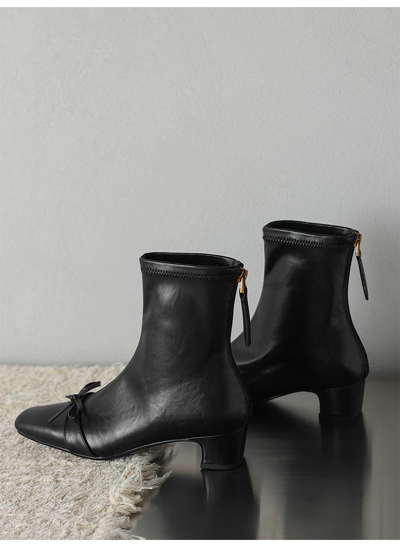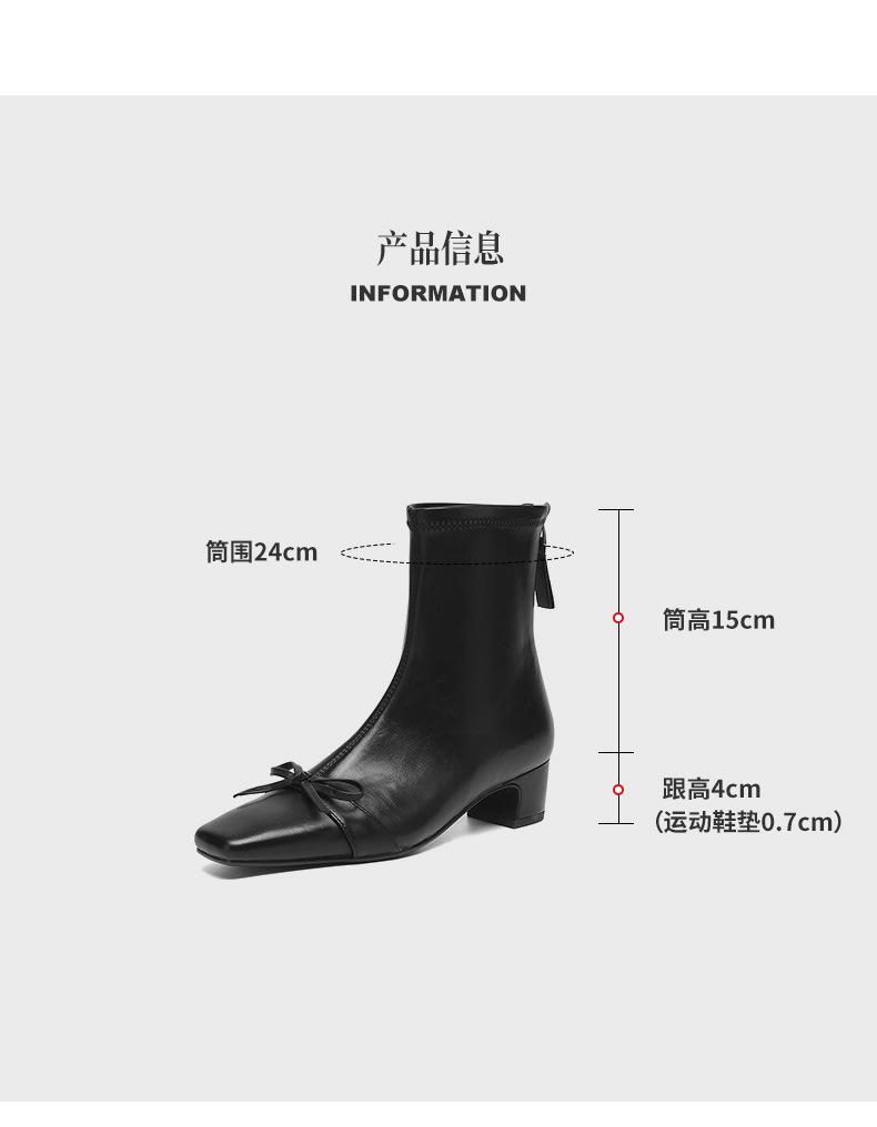 2025 Otoño/Invierno Nuevas Botas de Piel de Oveja Punta Cuadrada Tacón Grueso Lazo Estilo Coreano Elásticas Adelgazantes Botines de Tobillo de Tacón Alto Francés Botas de Mujer