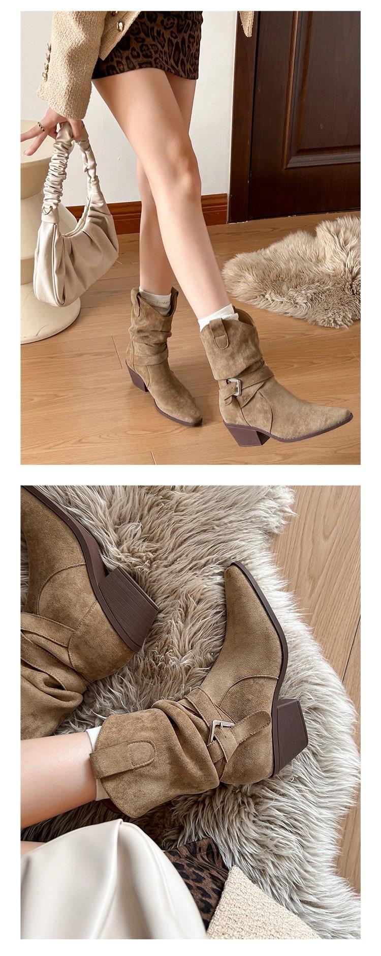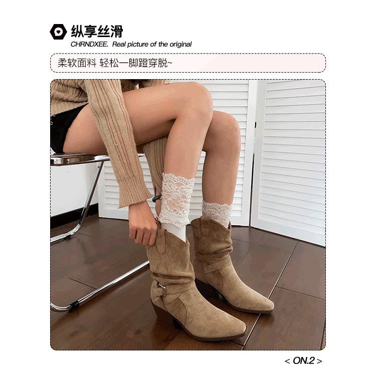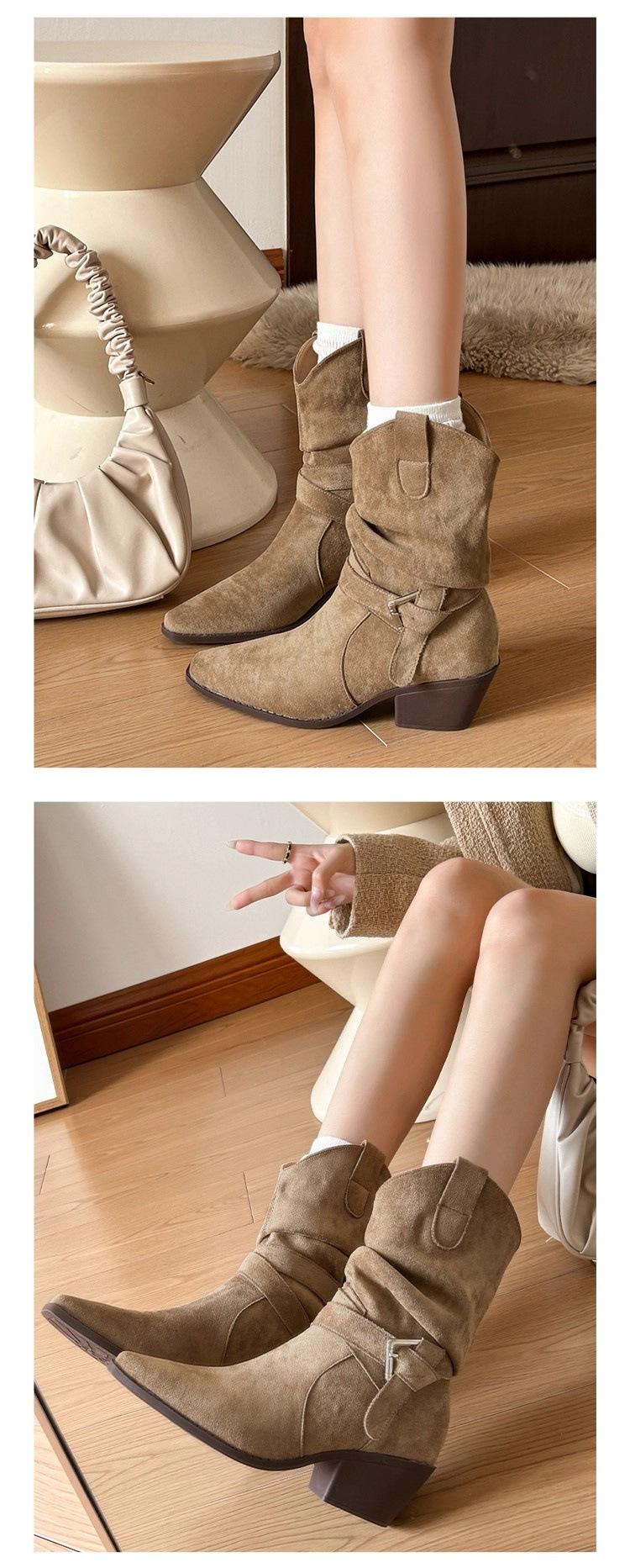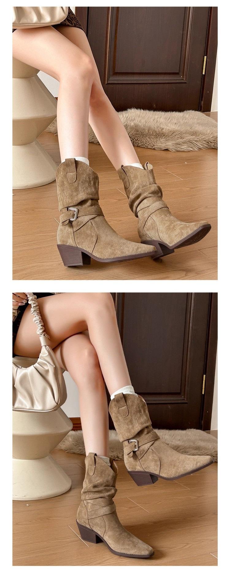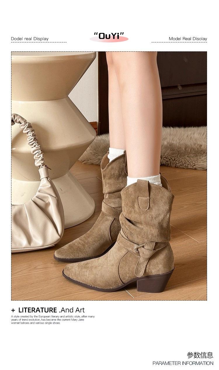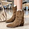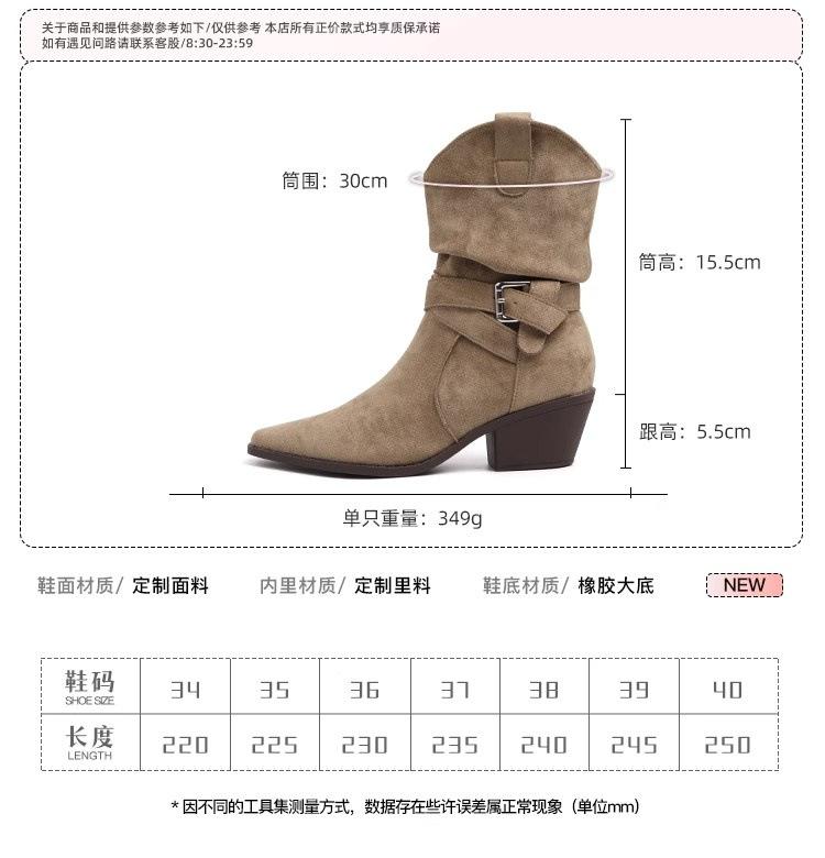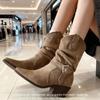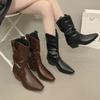 Botines Retro Franceses Mujer 2025 Primavera y Otoño Nuevos Botas Vaqueras Occidentales Mujer Tacón Grueso Punta Puntiaguda Media Pantorrilla Botas Apiladas Botines