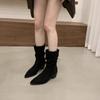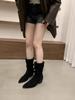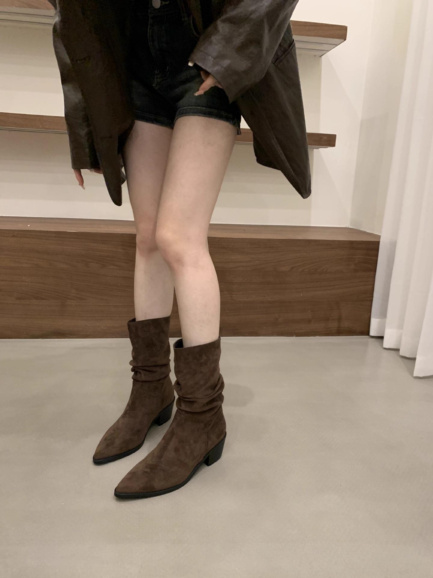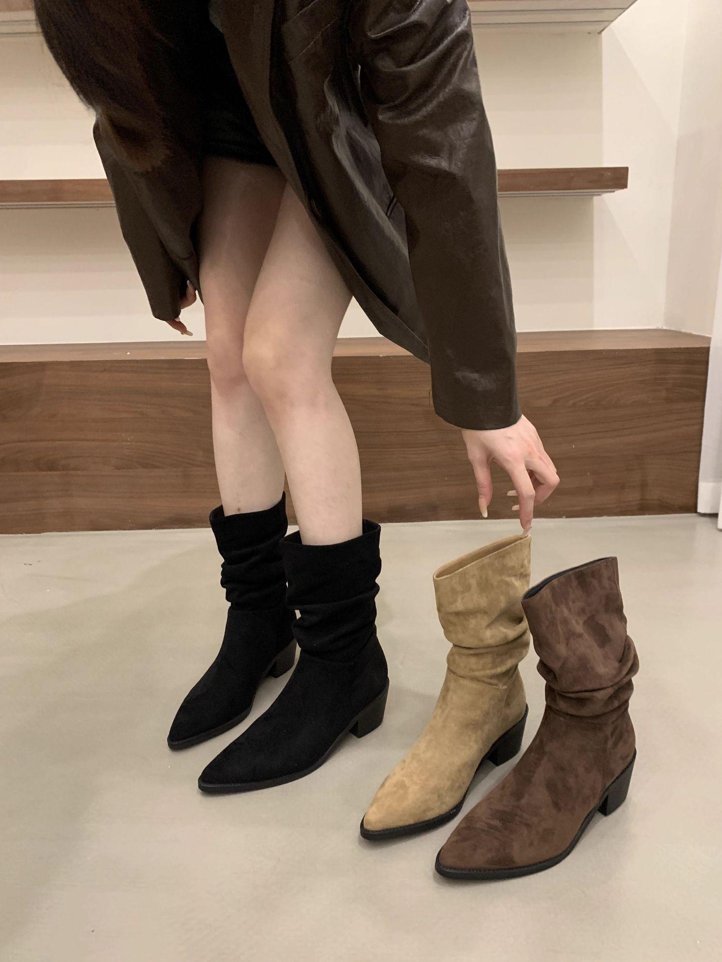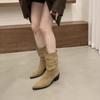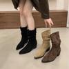 Botines cortos de tacón alto puntiagudo de gamuza caqui estilo francés ajustados para mujer zapatos 2025 nuevo estilo botas de pelo primavera y otoño botas individuales