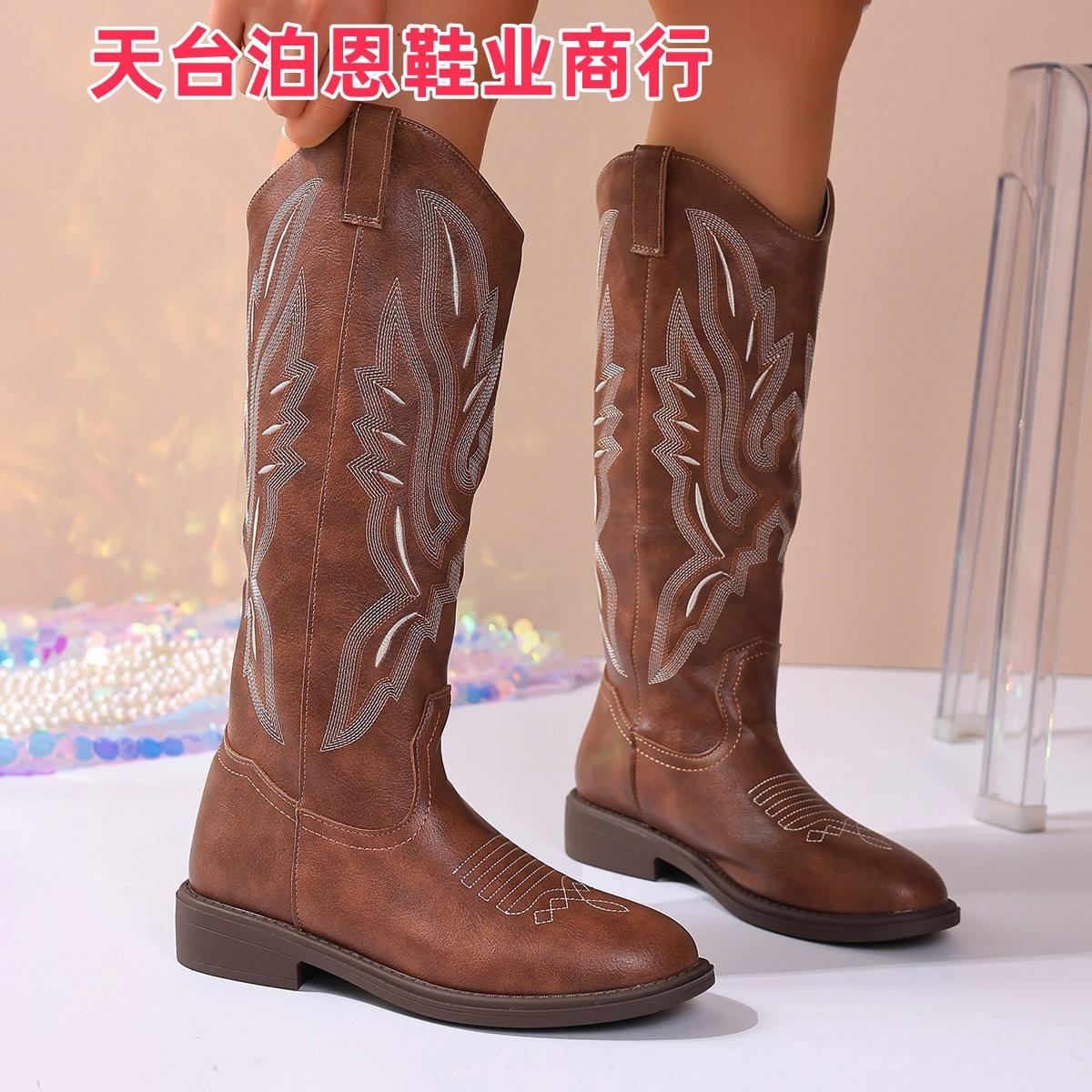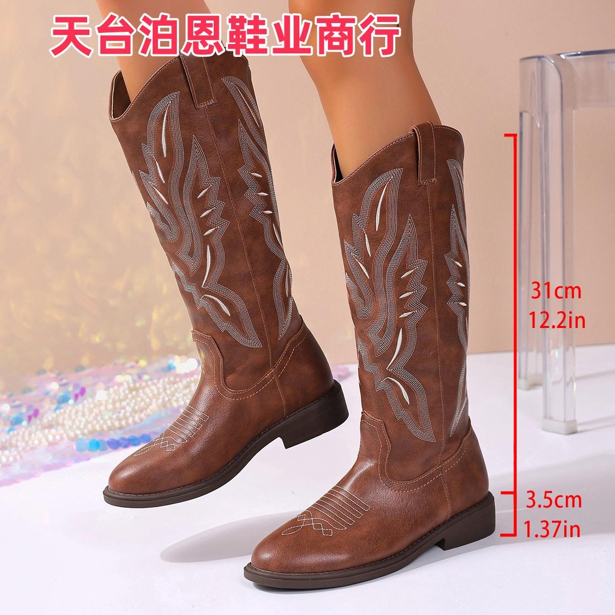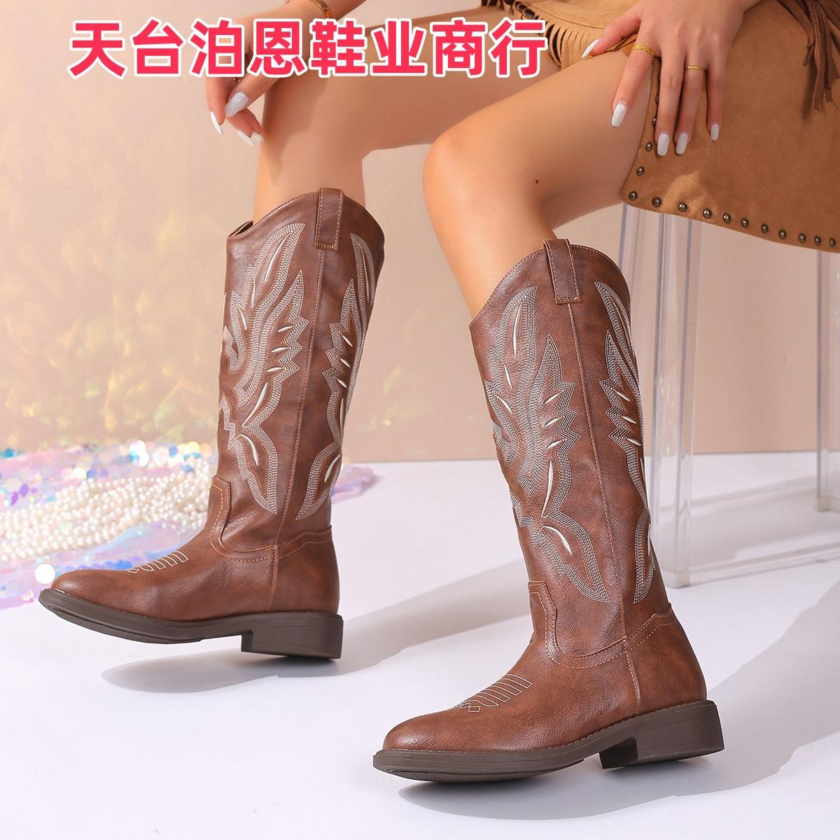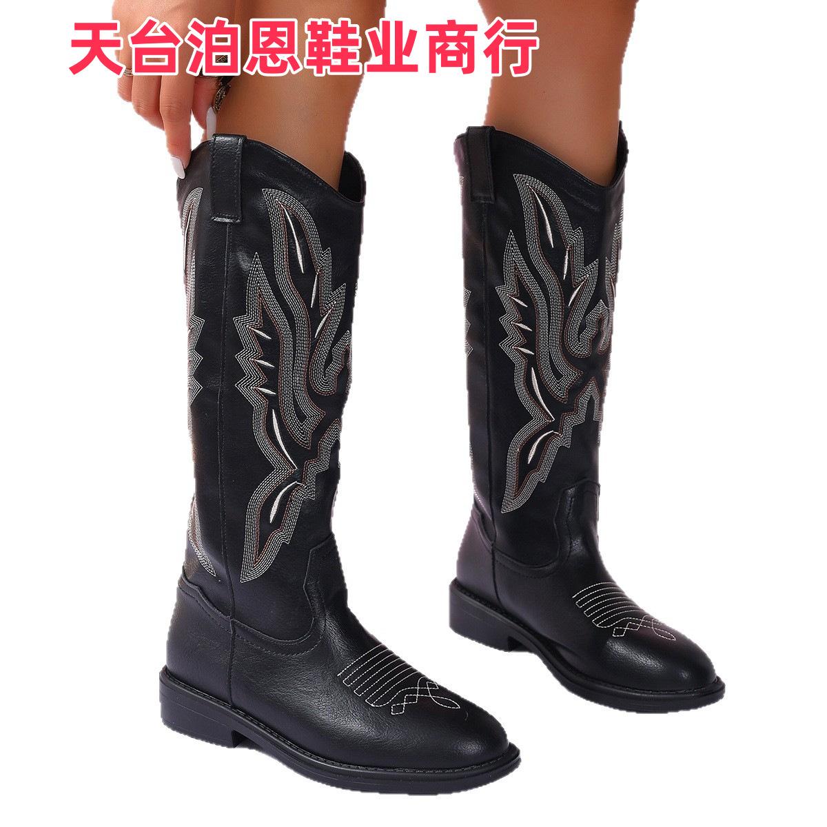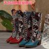 Moda Europea y Americana 2025 Otoño e Invierno Botas de Cuero para Mujer de Tacón Medio Comercio Exterior Punta Redonda Talla Grande Bordado Botas Vaqueras para Mujer Estilo Trendy Caliente
