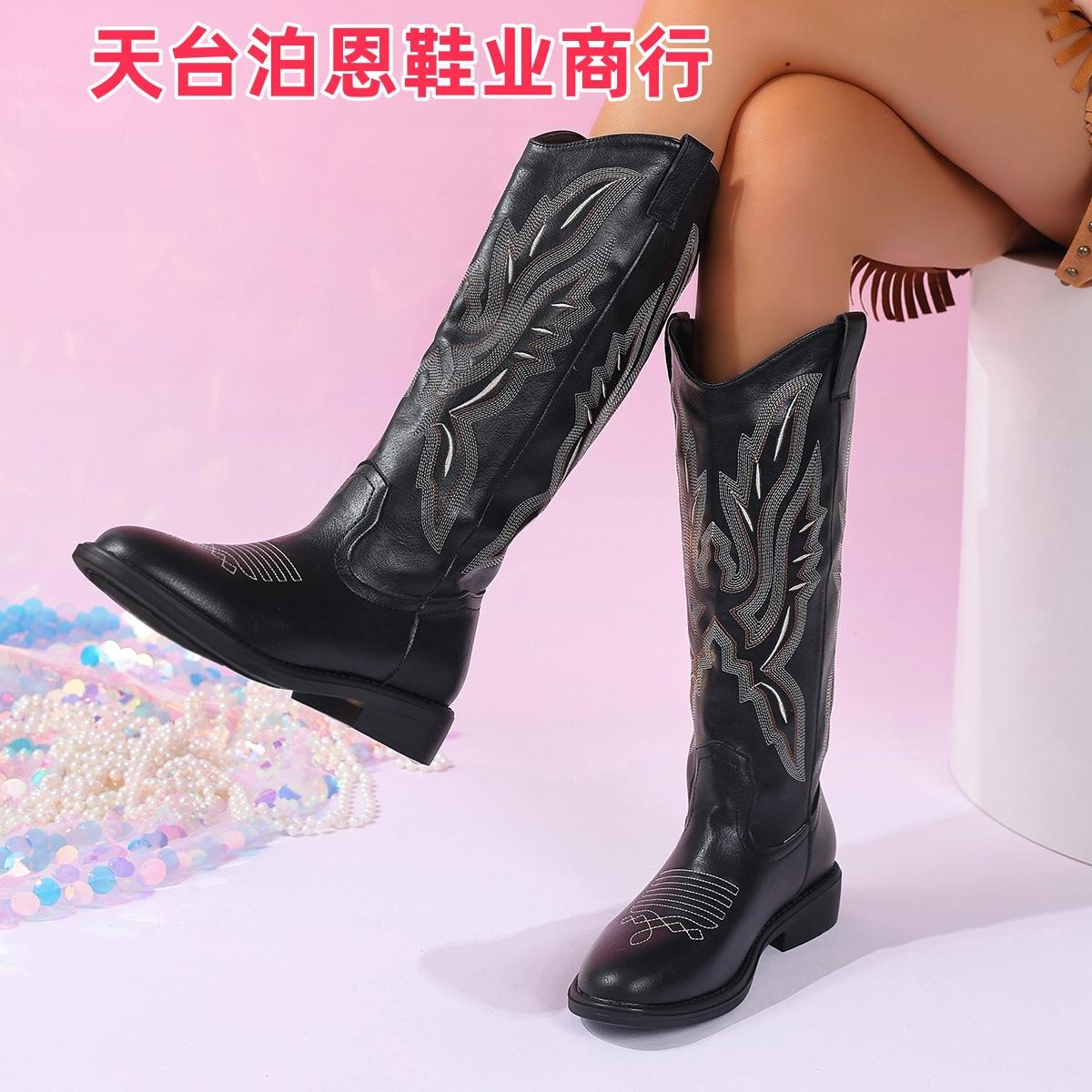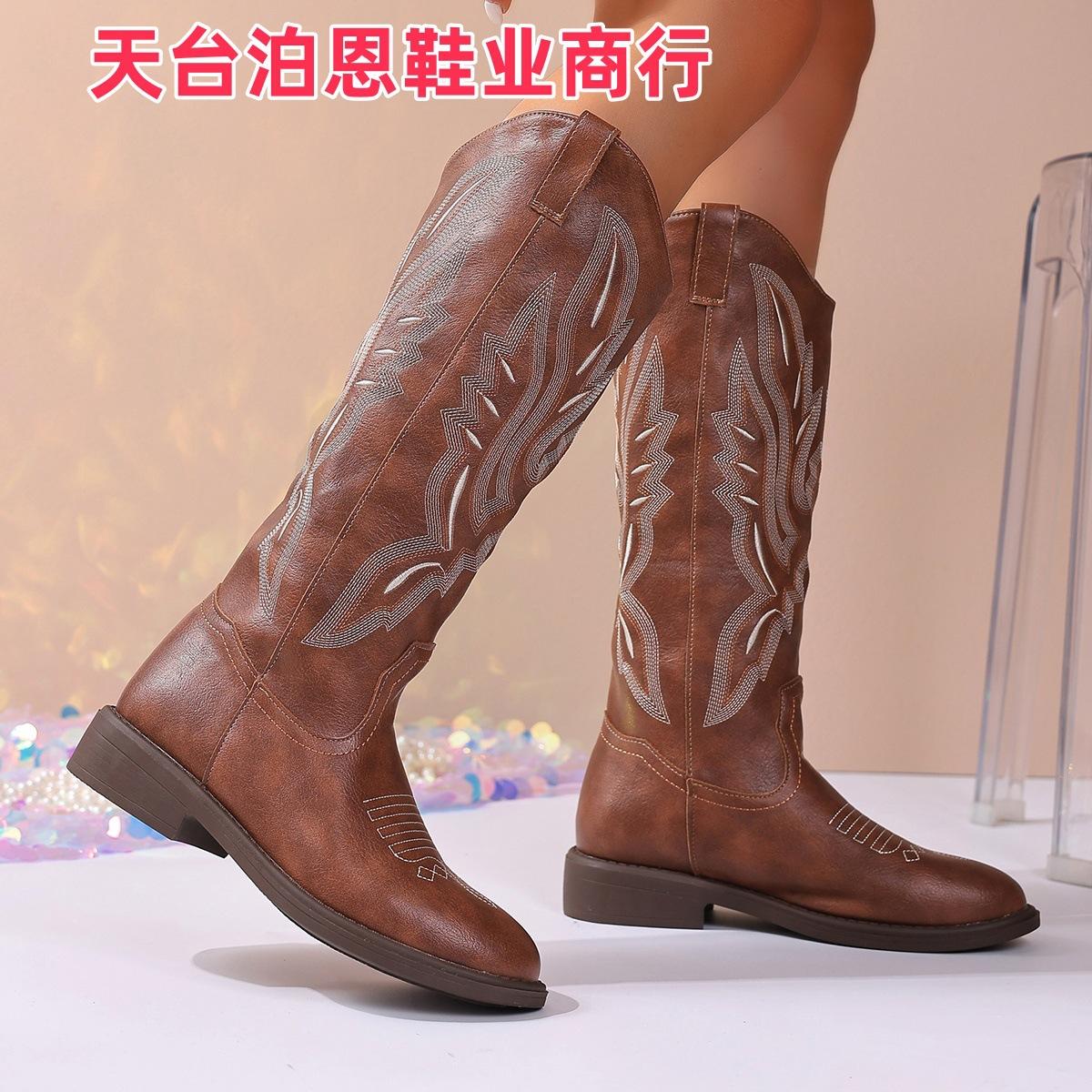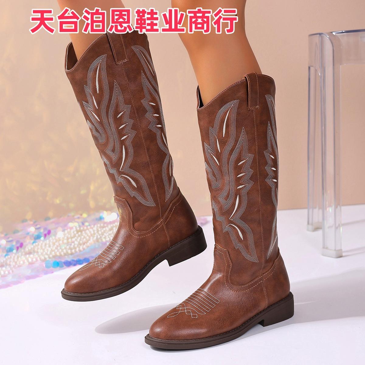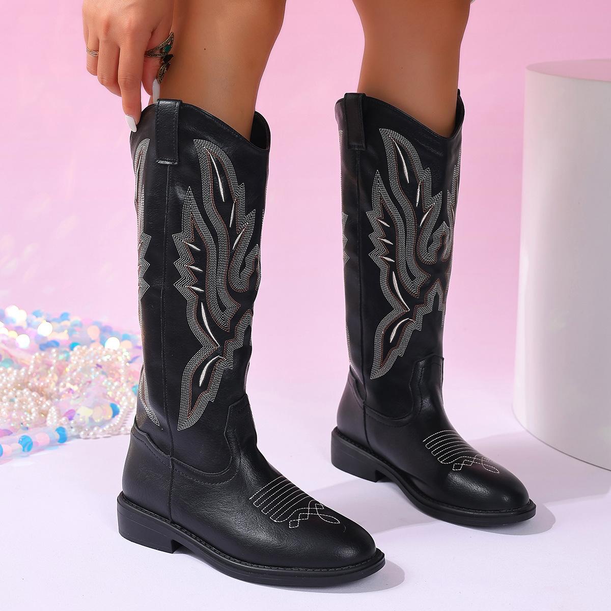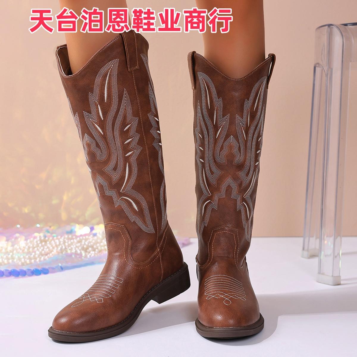 Moda Europea y Americana 2025 Otoño e Invierno Botas de Cuero para Mujer de Tacón Medio Comercio Exterior Punta Redonda Talla Grande Bordado Botas Vaqueras para Mujer Estilo Trendy Caliente