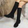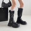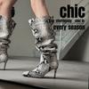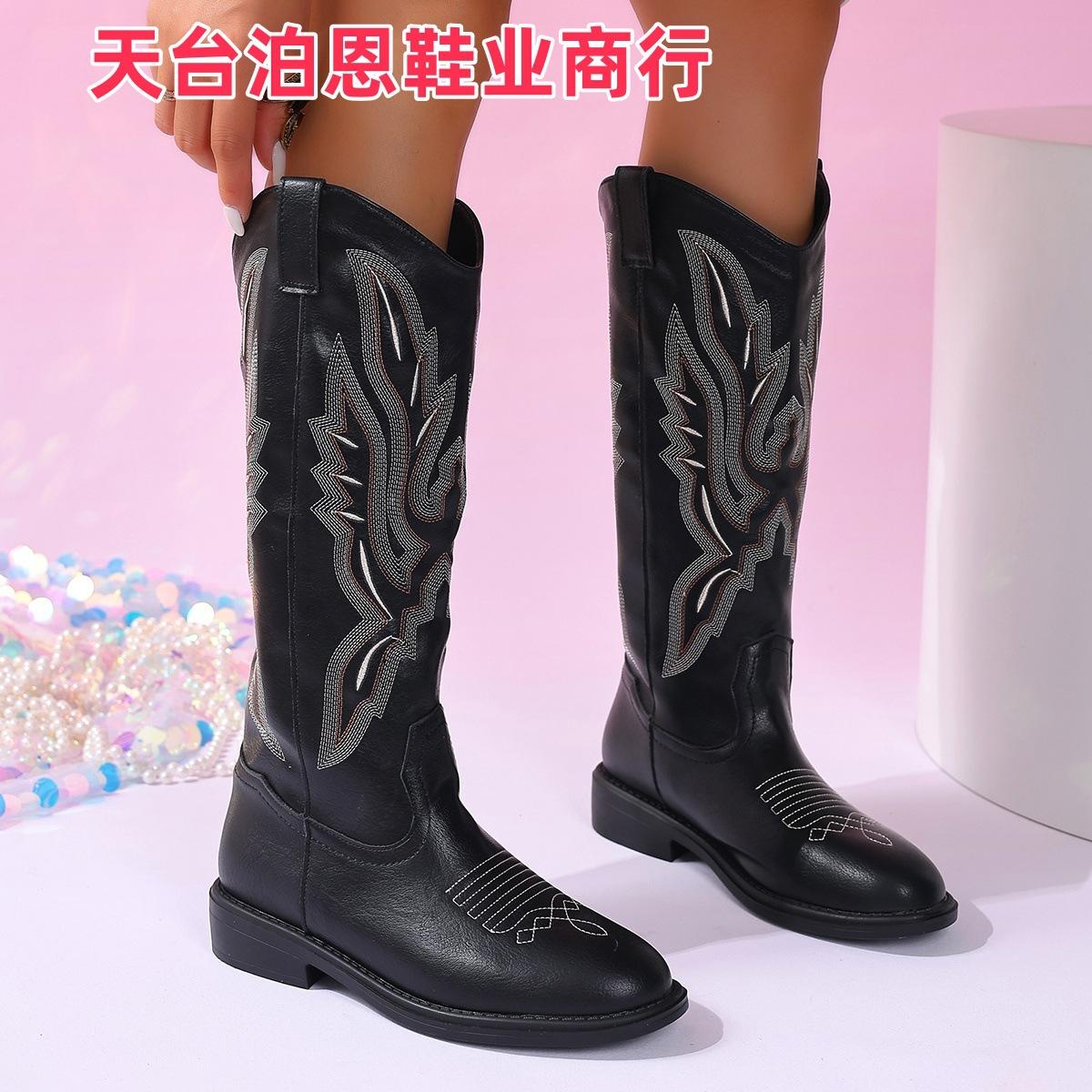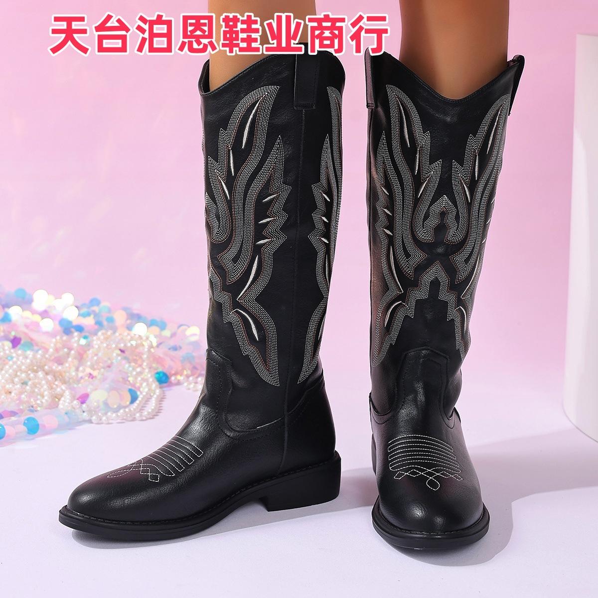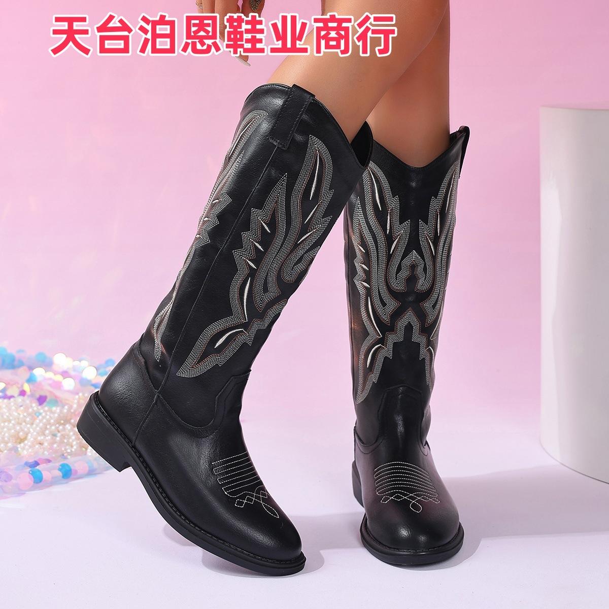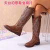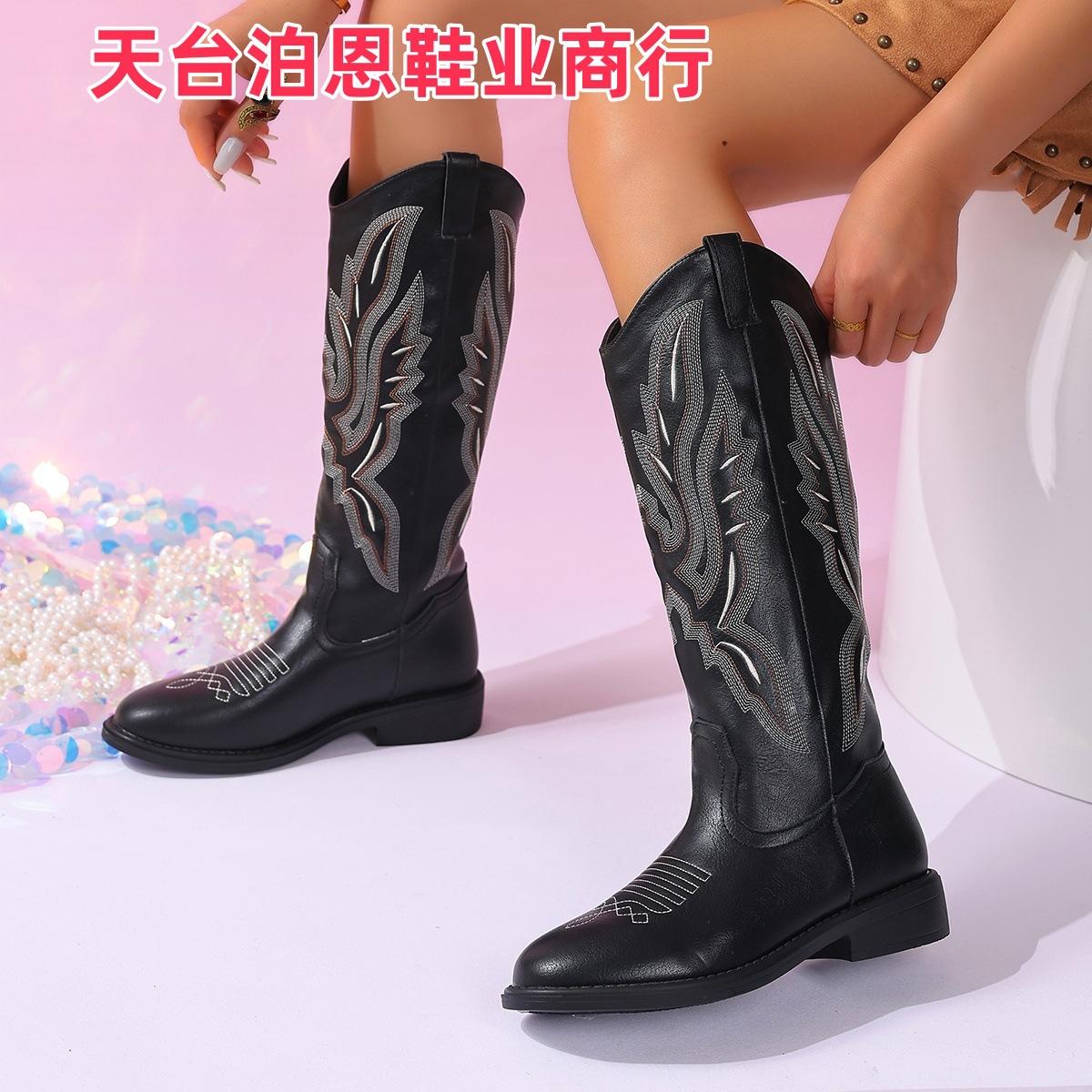 Moda Europea y Americana 2025 Otoño e Invierno Botas de Cuero para Mujer de Tacón Medio Comercio Exterior Punta Redonda Talla Grande Bordado Botas Vaqueras para Mujer Estilo Trendy Caliente