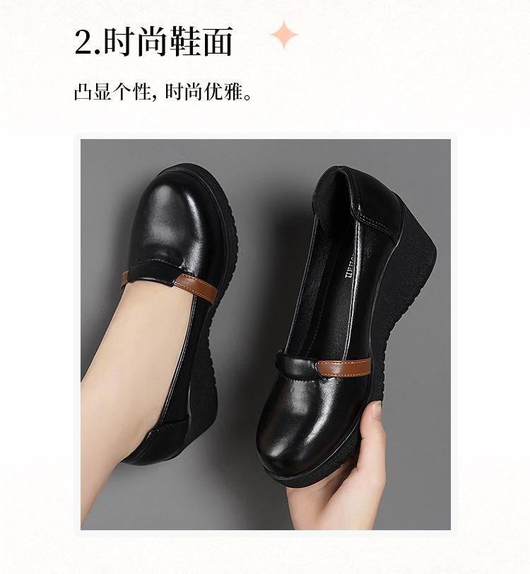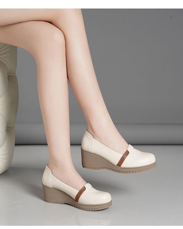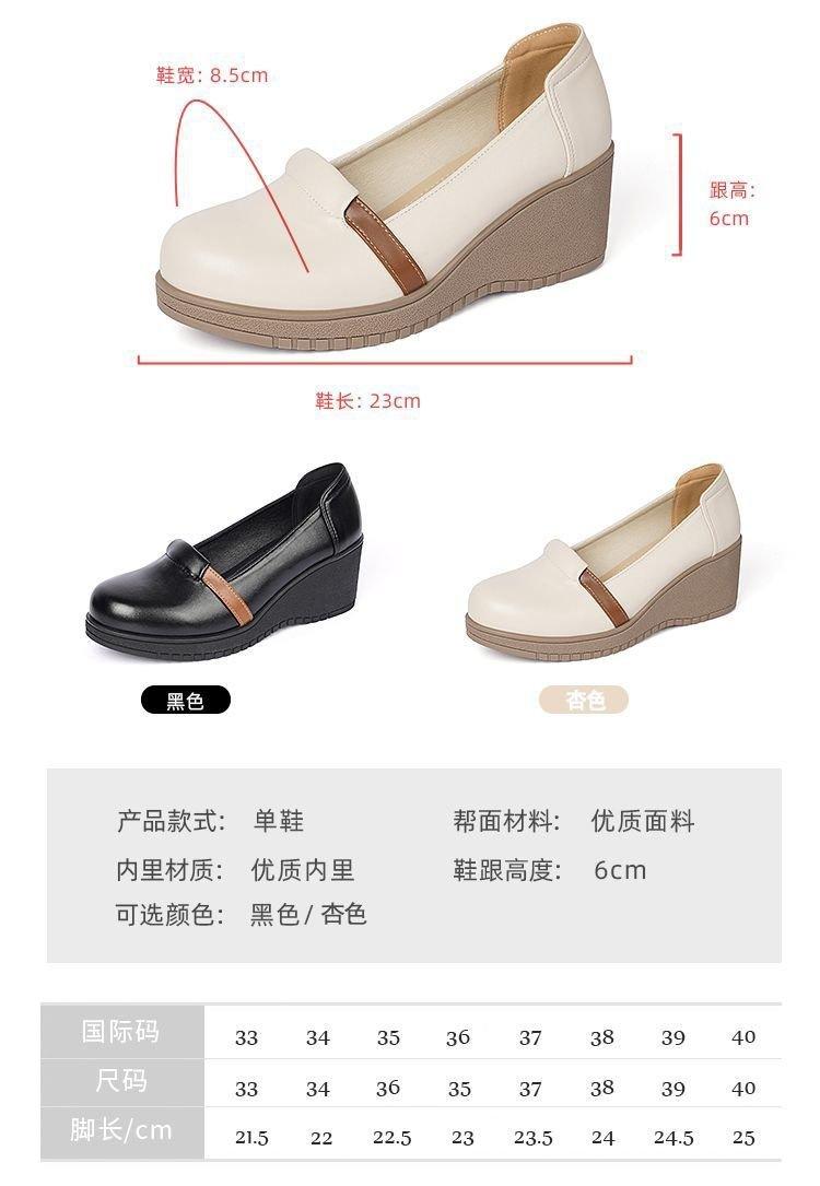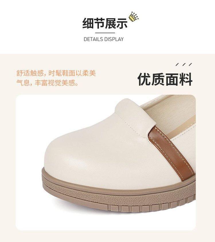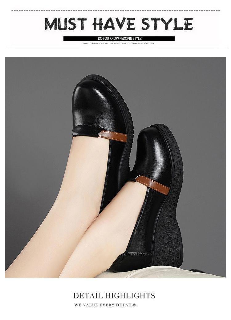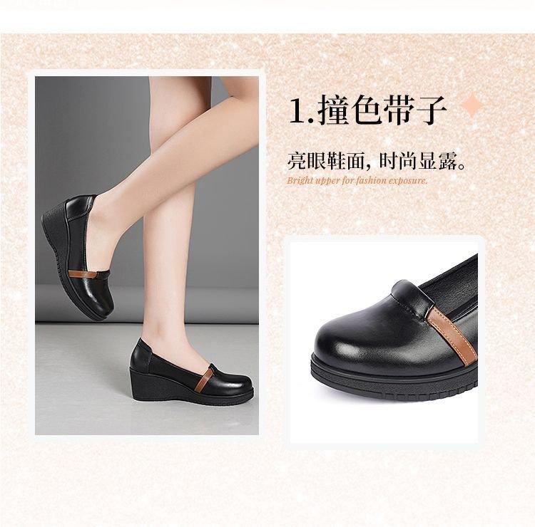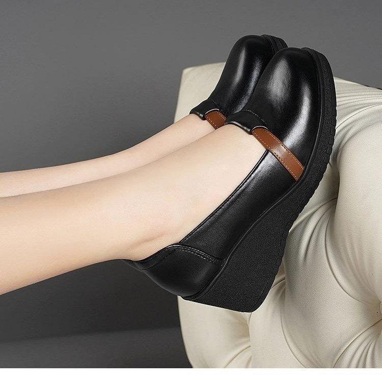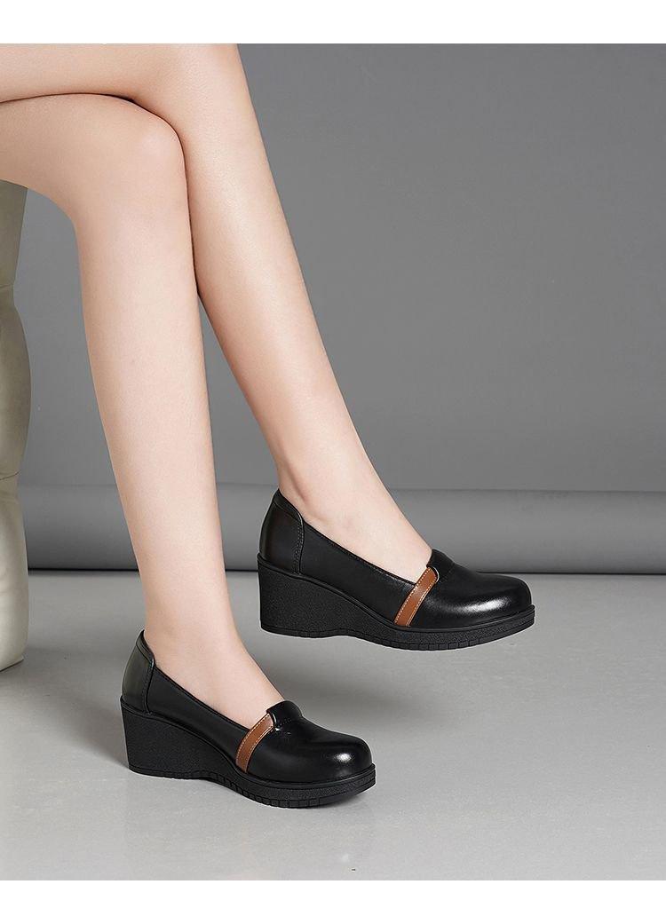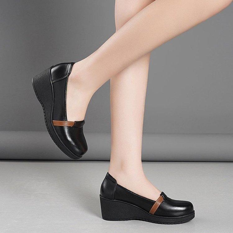 Zapatos de cuero pequeños de punta redonda de boca baja para mujer otoño 2025 nuevos zapatos de trabajo cómodos de meter suela suave versátiles tacón de cuña zapatos individuales