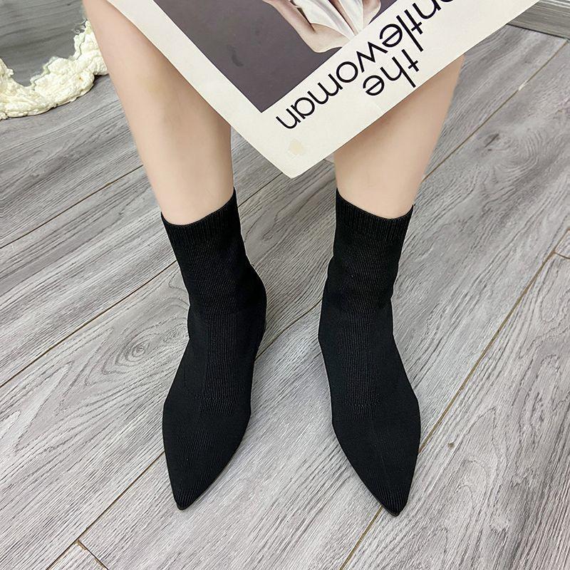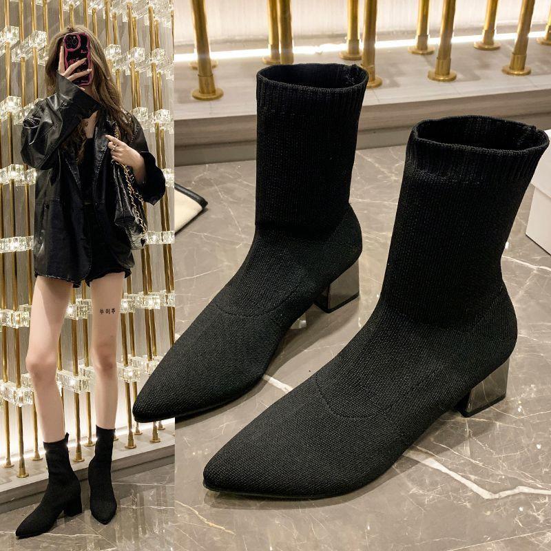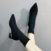 2025 Nuevo Otoño/Invierno Talla Grande Zapatos Negros de Mujer Punta Afilada Tejido Botas Adelgazantes Flyknit Elástico Botines Tipo Calcetín Tacón Grueso Botines Mujer