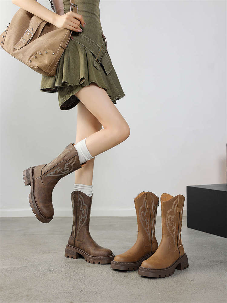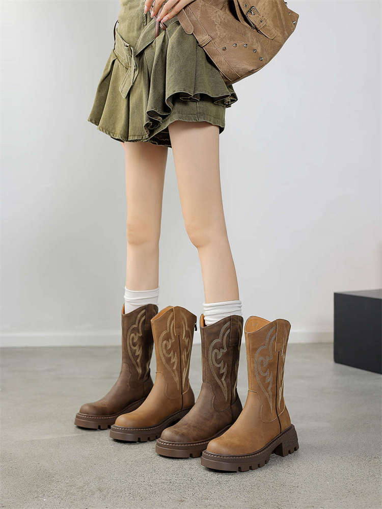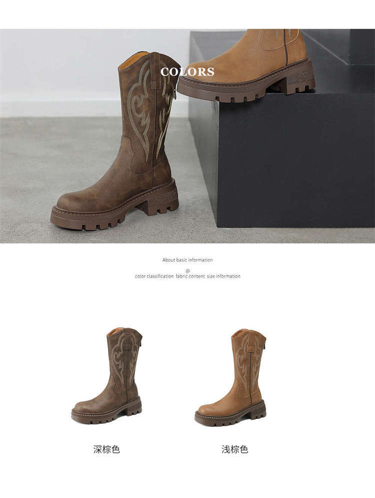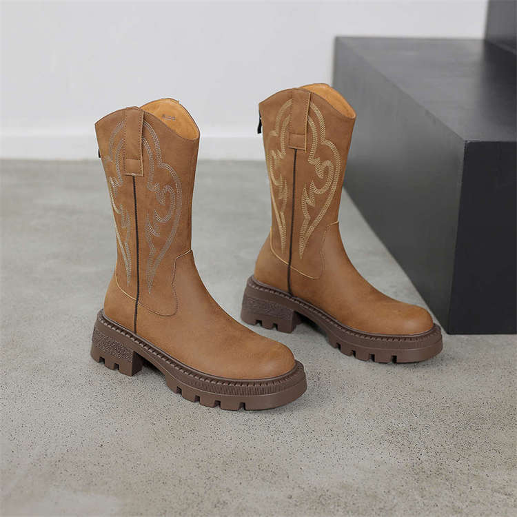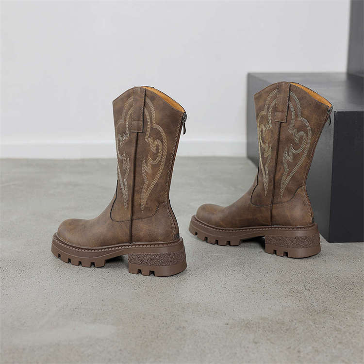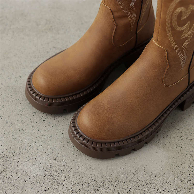 Botas de caballero con boca en V, botas cortas ajustadas de suela gruesa para mujer 2025 nuevo otoño bordado marrón retro botas vaqueras occidentales
