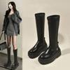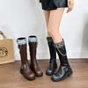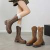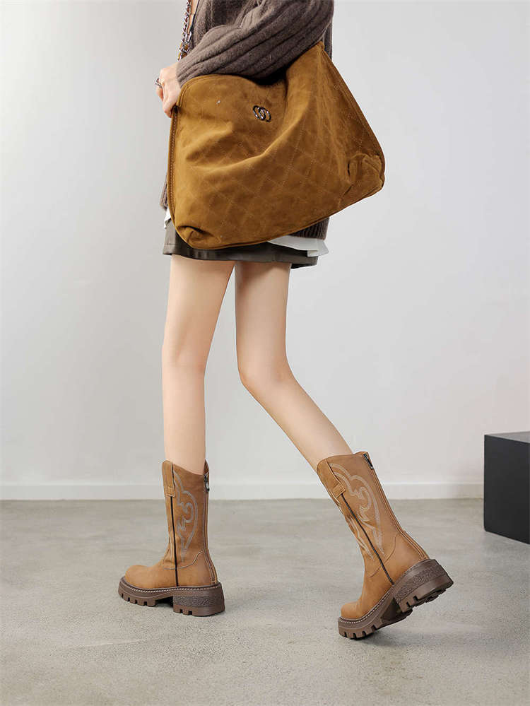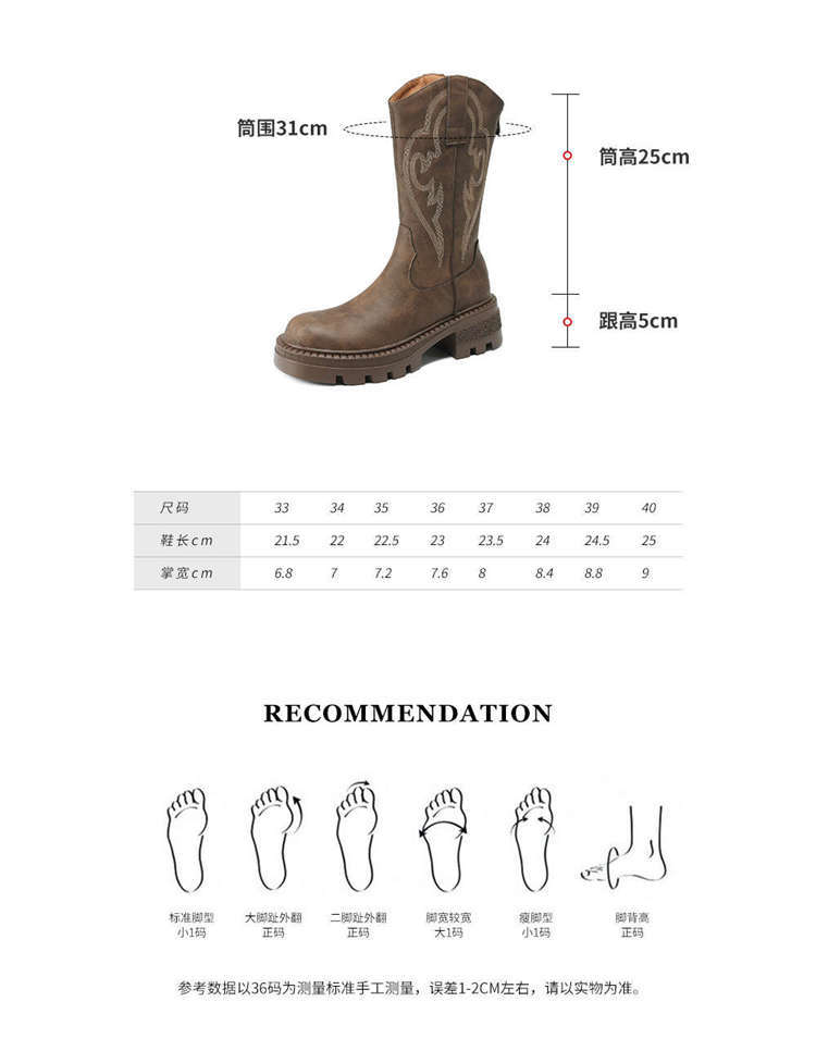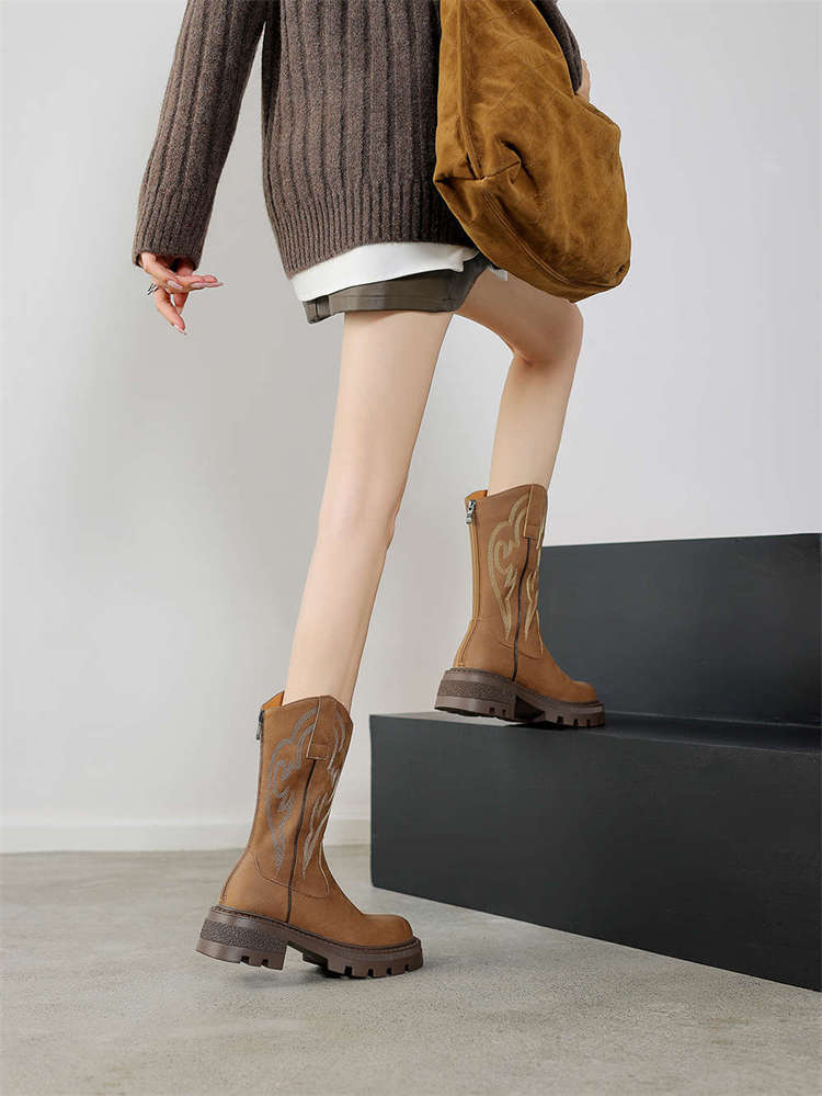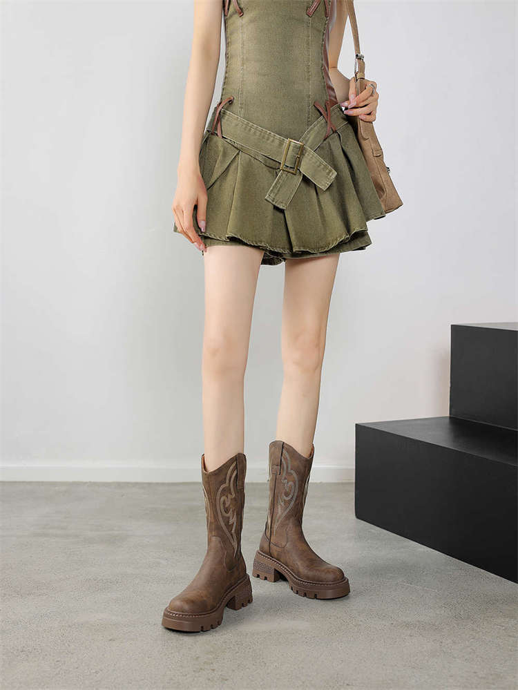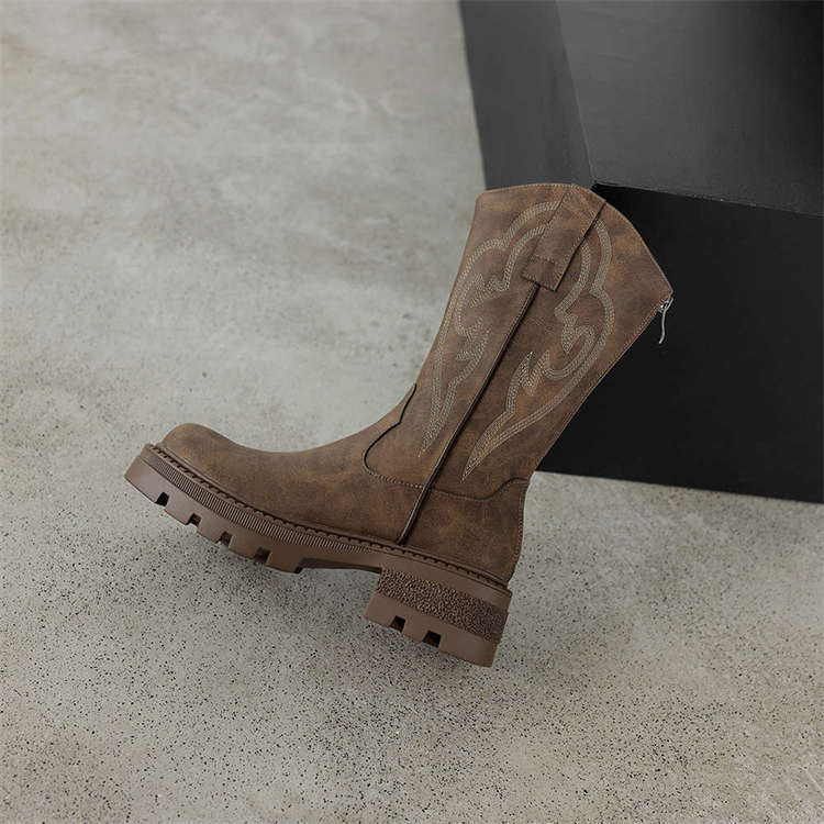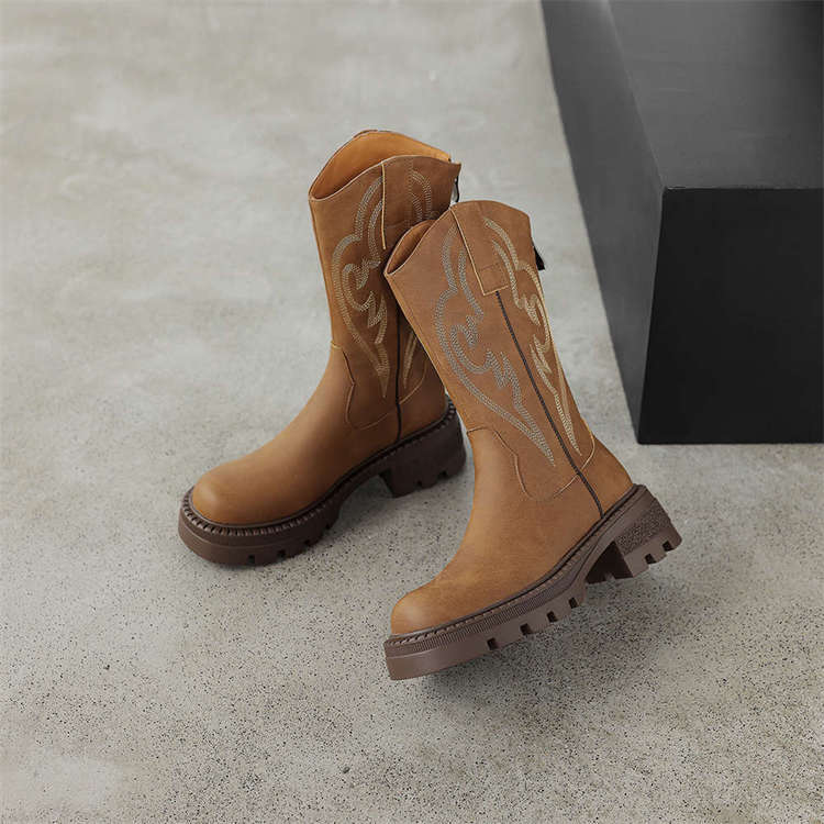 Botas de caballero con boca en V, botas cortas ajustadas de suela gruesa para mujer 2025 nuevo otoño bordado marrón retro botas vaqueras occidentales