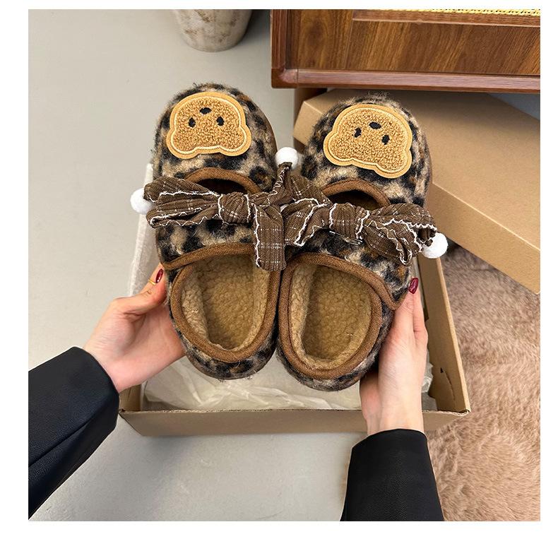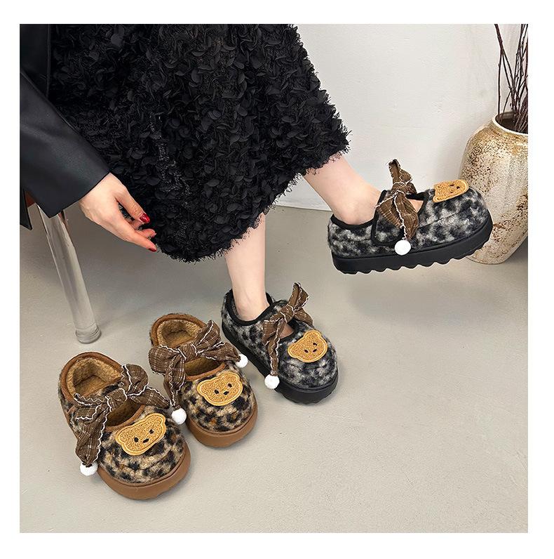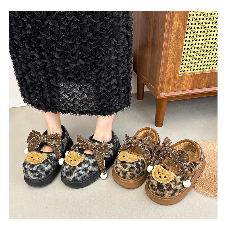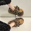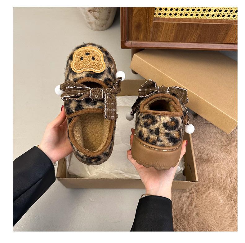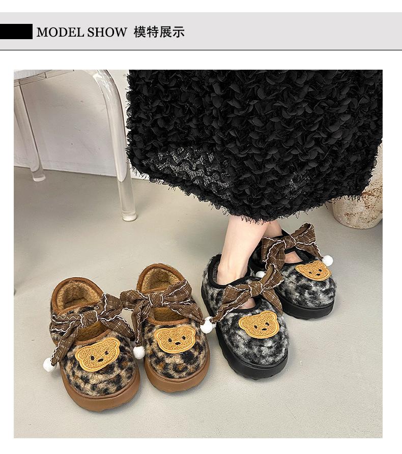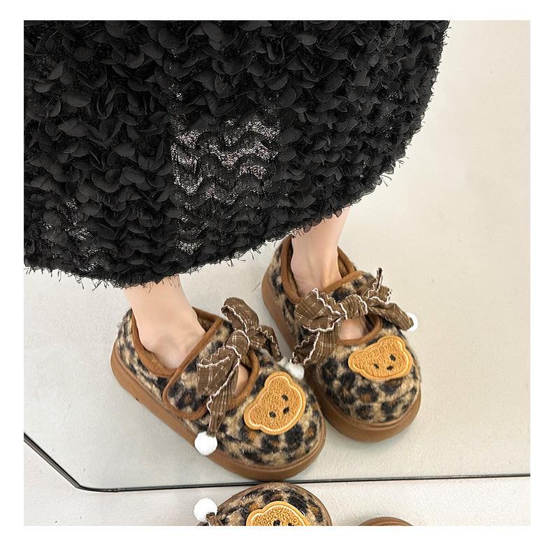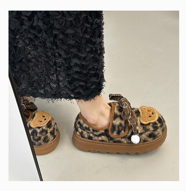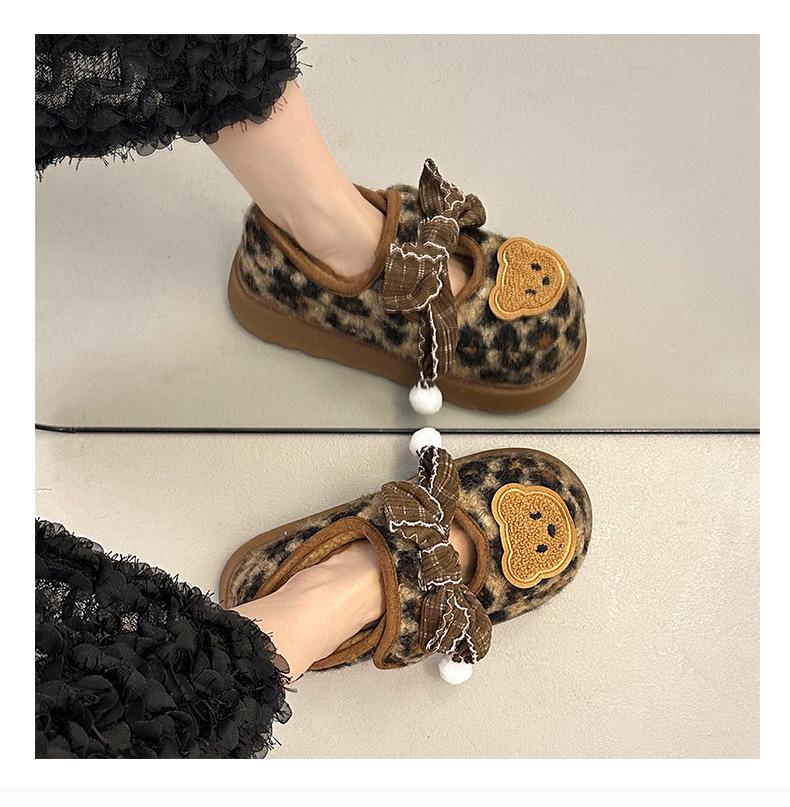 Mary Janes planas con estampado de leopardo y pedrería, zapatos peludos de dibujos animados con suela gruesa, moda versátil de otoño e invierno para mujer, zapatos de algodón, zapatos individuales de felpa