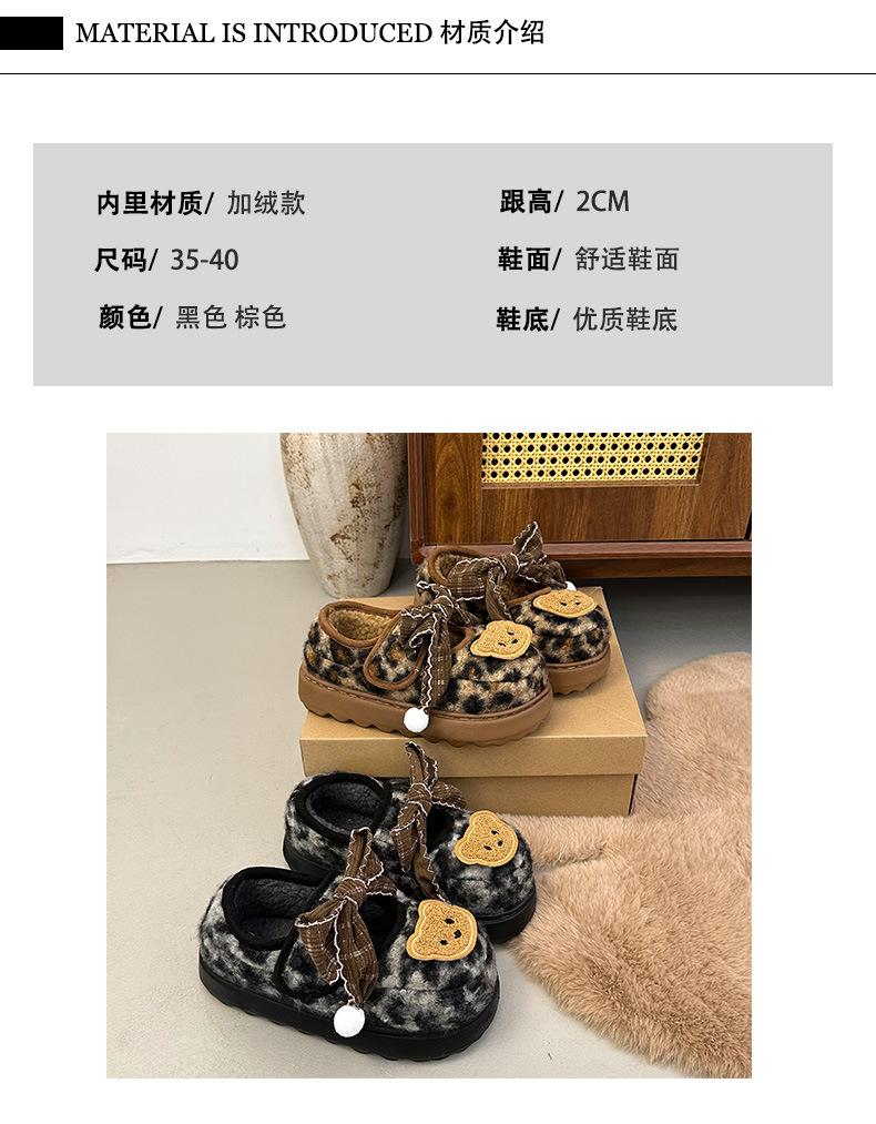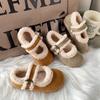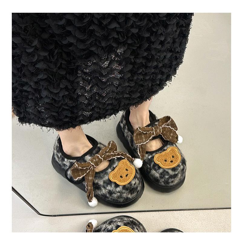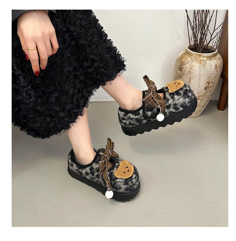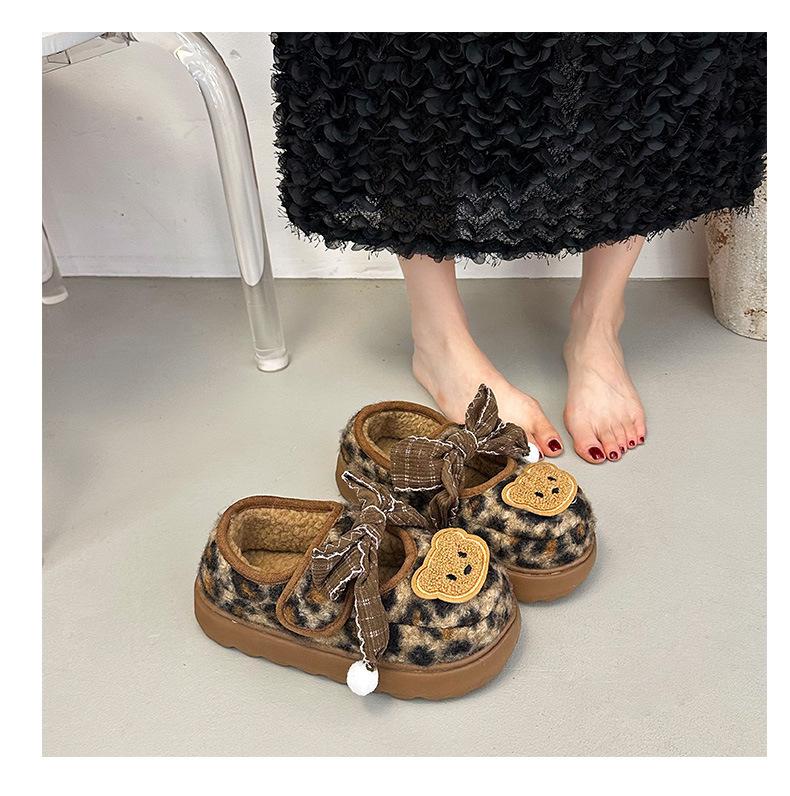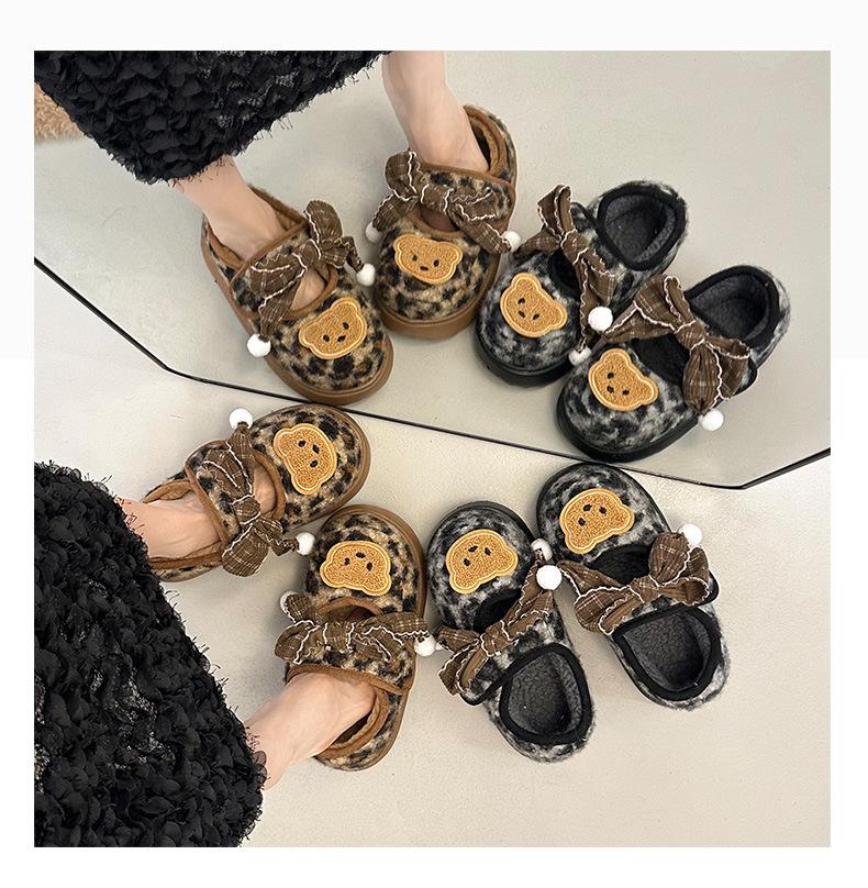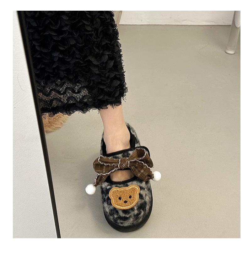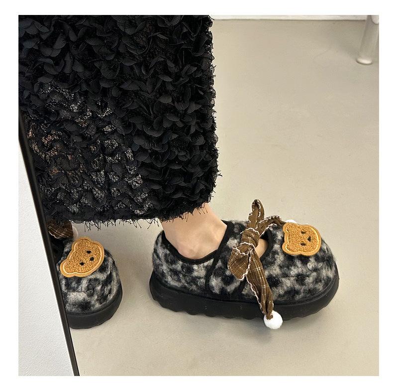 Mary Janes planas con estampado de leopardo y pedrería, zapatos peludos de dibujos animados con suela gruesa, moda versátil de otoño e invierno para mujer, zapatos de algodón, zapatos individuales de felpa