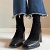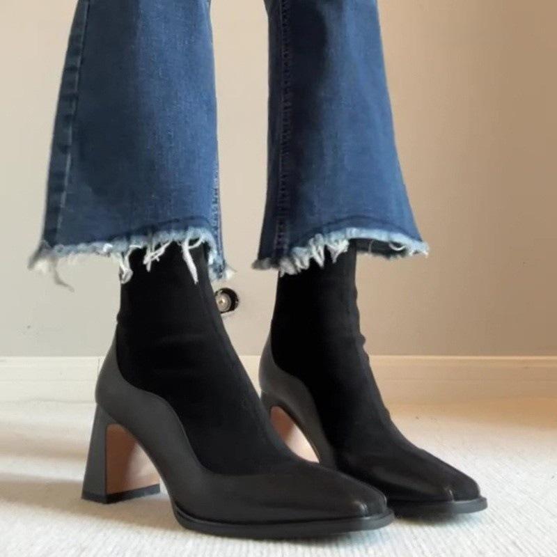 Compra Botas elásticas delgadas marrones retro francesas con empalme para mujer con punta cuadrada y cremallera trasera, botas cortas de tacón alto para personas pequeñas, botas calcetín al por mayor en Joom.pro