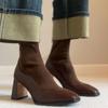 Botas elásticas delgadas marrones retro francesas con empalme para mujer con punta cuadrada y cremallera trasera, botas cortas de tacón alto para personas pequeñas, botas calcetín