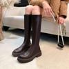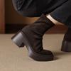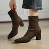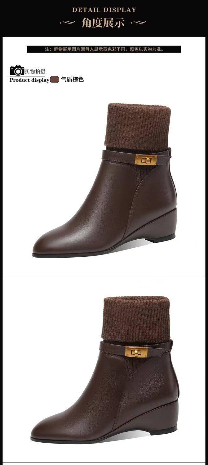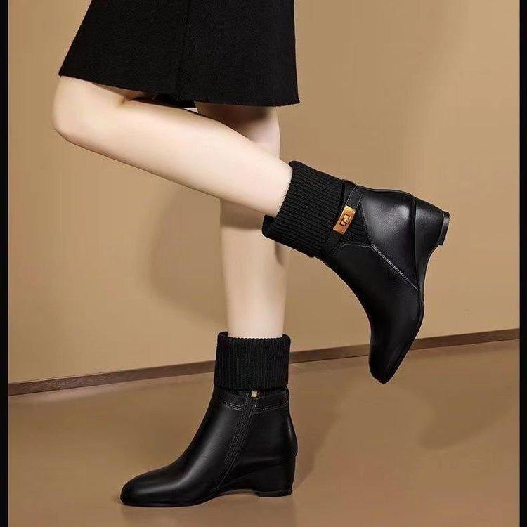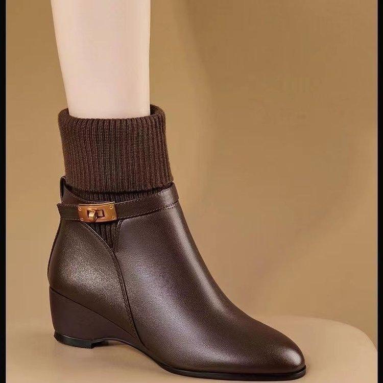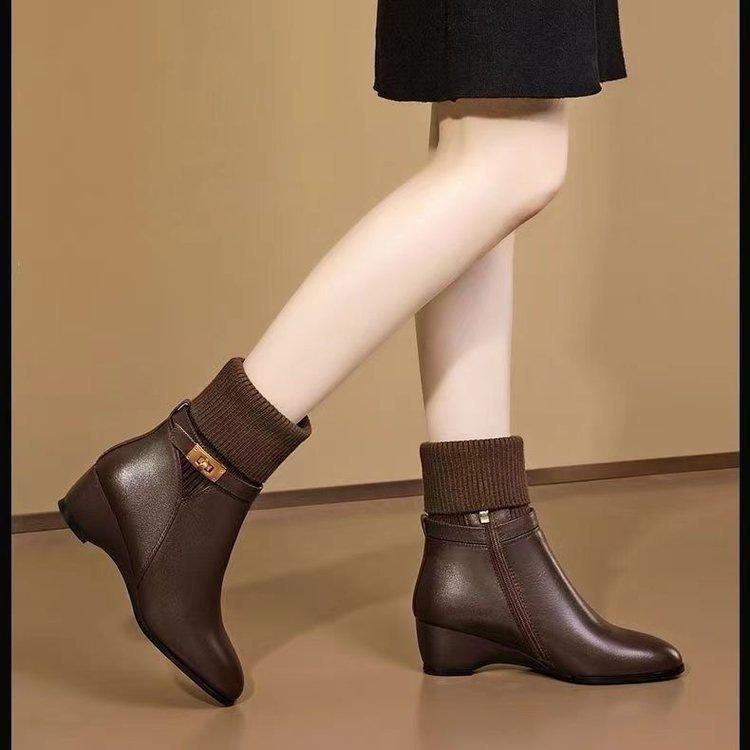 Botines de Tobillo de Cuero Suave con Tacón de Cuña para Mujer 2025 Invierno Nuevo Más Terciopelo Tejido Boca Botas de Media Caña Punta Redonda Casual Cálido Botas de Mujer