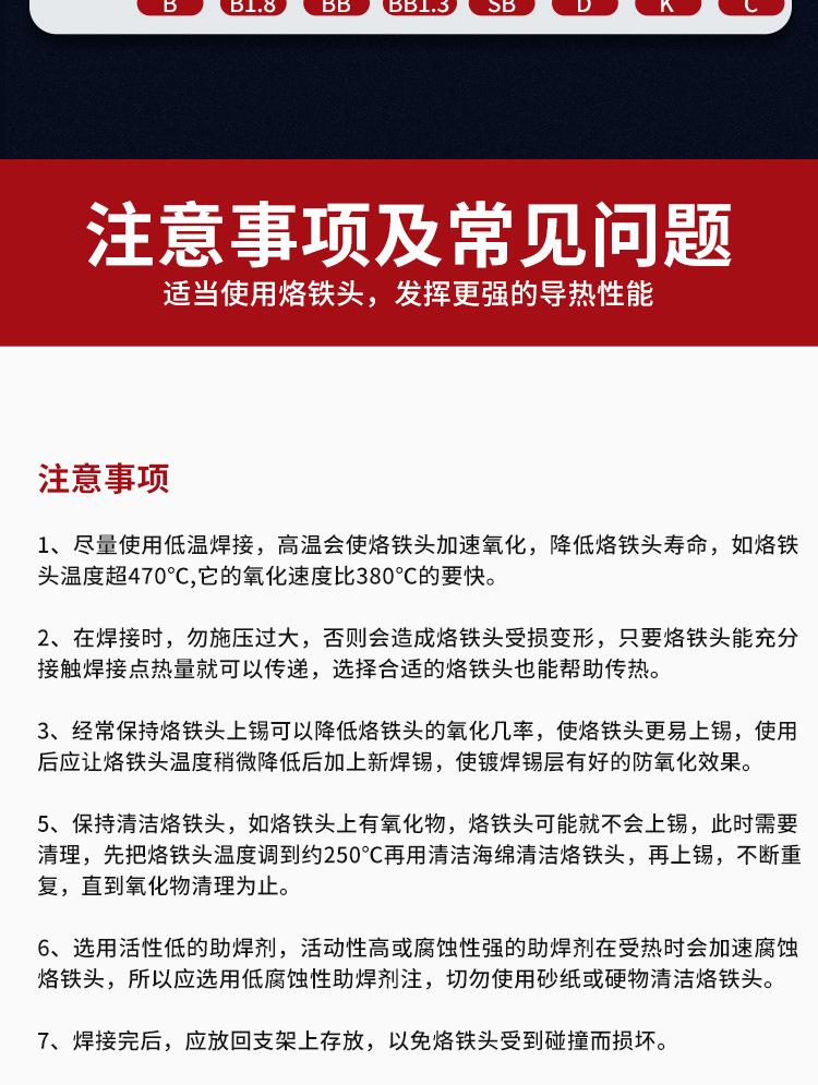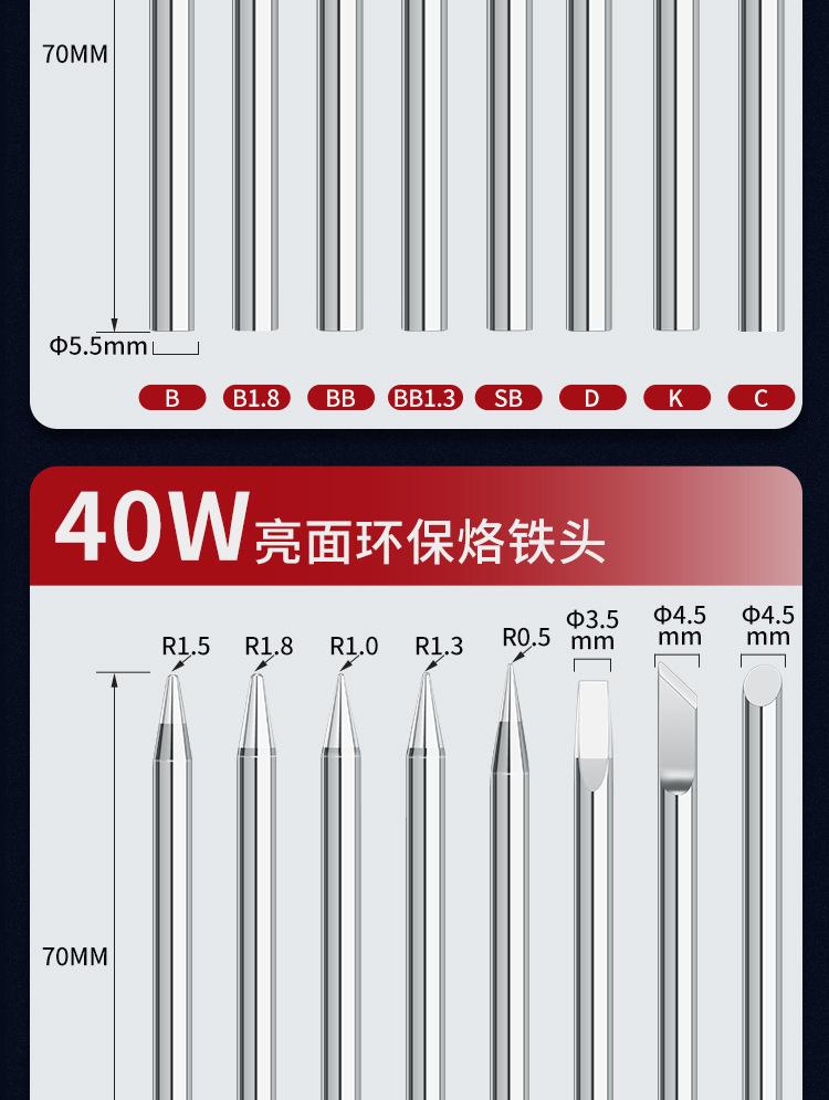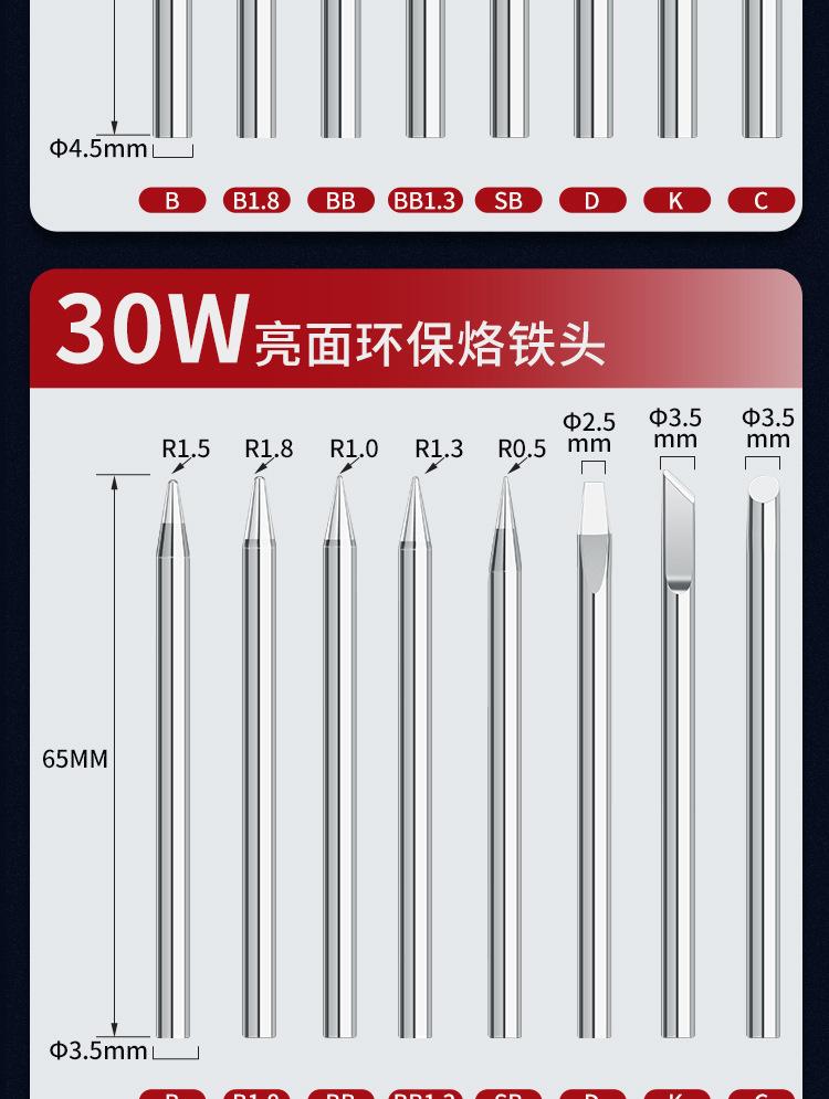 30W-B (round tip), 30W-SB (extra tip), 30W-BB (small tip), 30W-BB1.3 (mid-tip), 30W horseshoe head, 30W flat h...