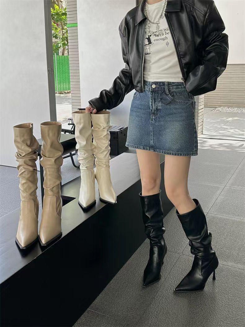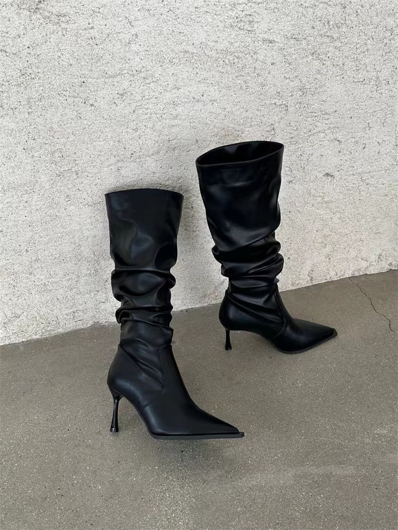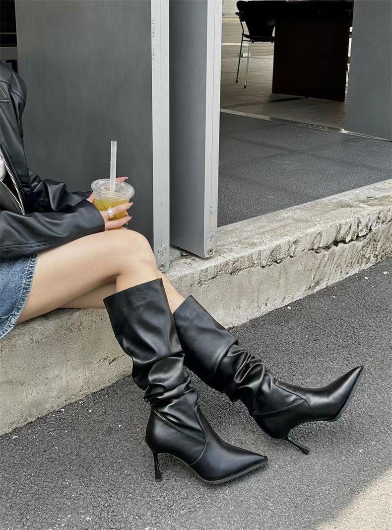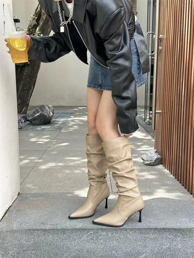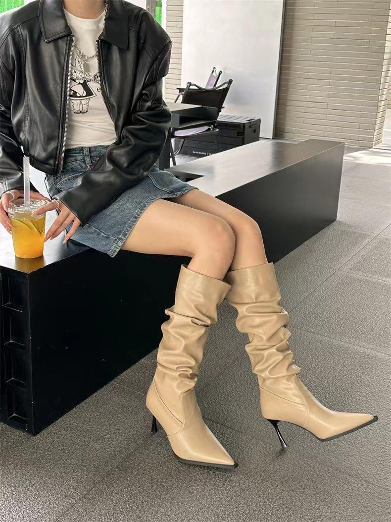 Botas Altas Vintage Fruncidas de Punta Tacón Alto Mujer 2025 Otoño/Invierno Nueva Moda Tacón de Aguja Botas Largas Mujer