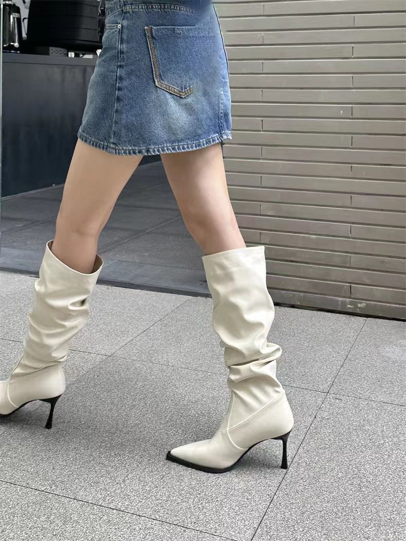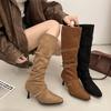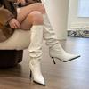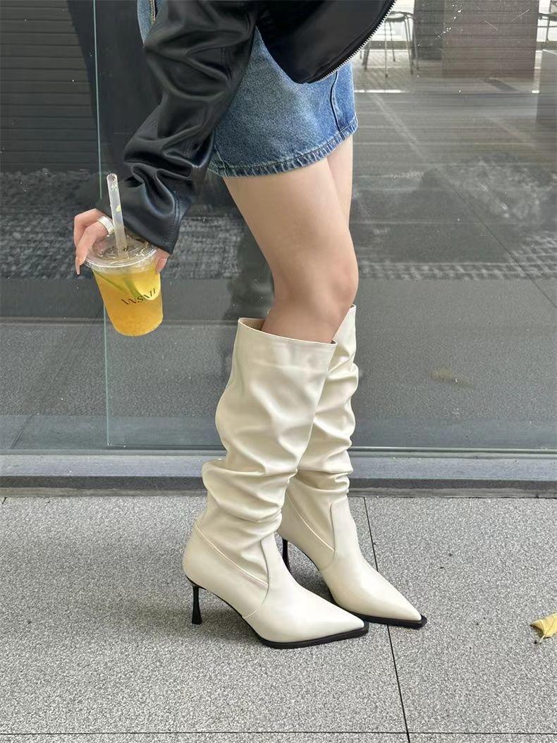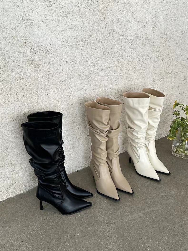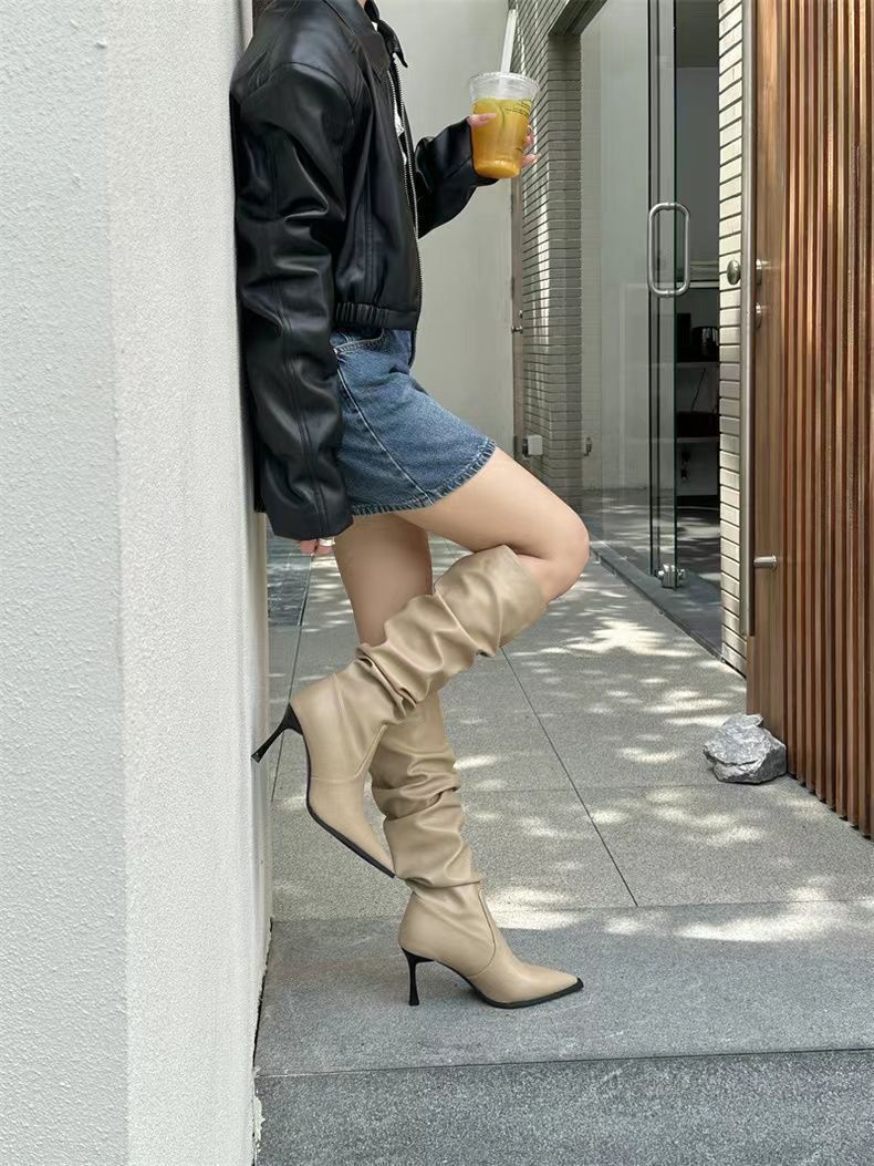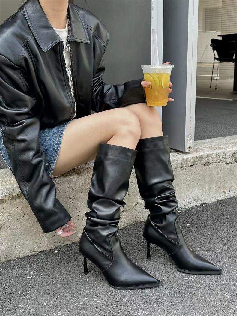 Botas Altas Vintage Fruncidas de Punta Tacón Alto Mujer 2025 Otoño/Invierno Nueva Moda Tacón de Aguja Botas Largas Mujer