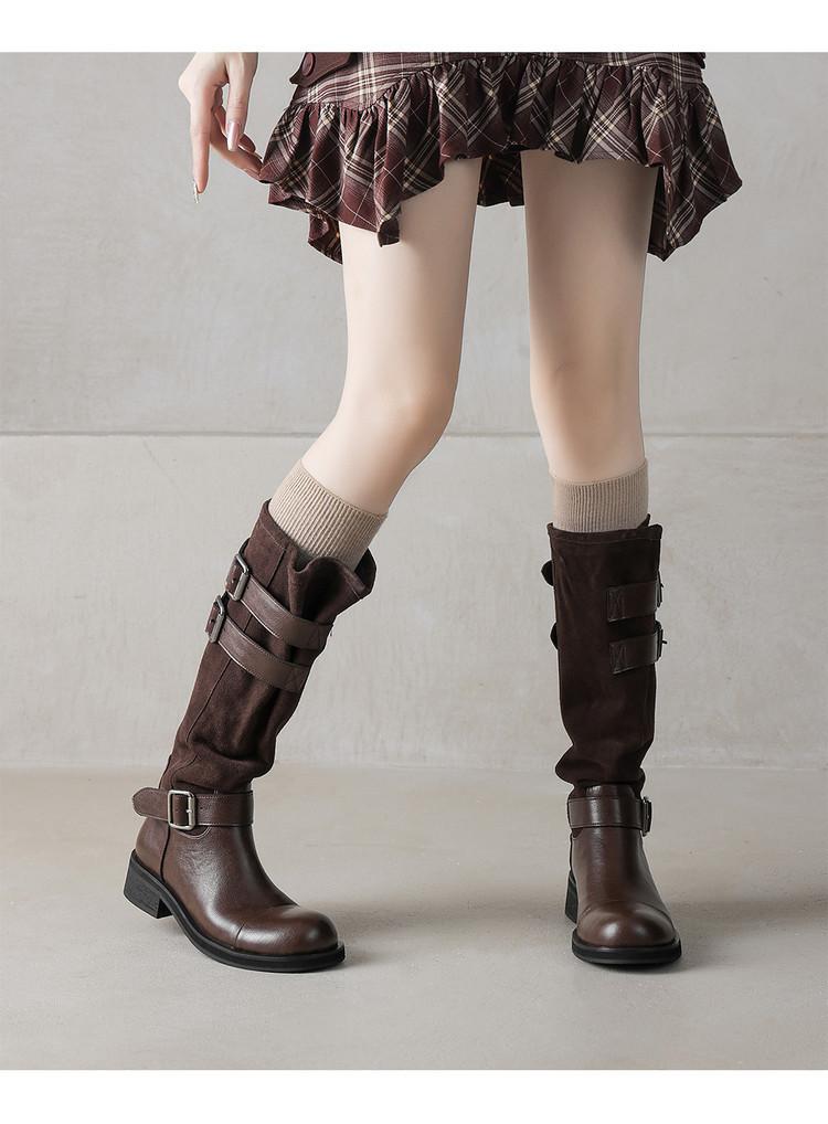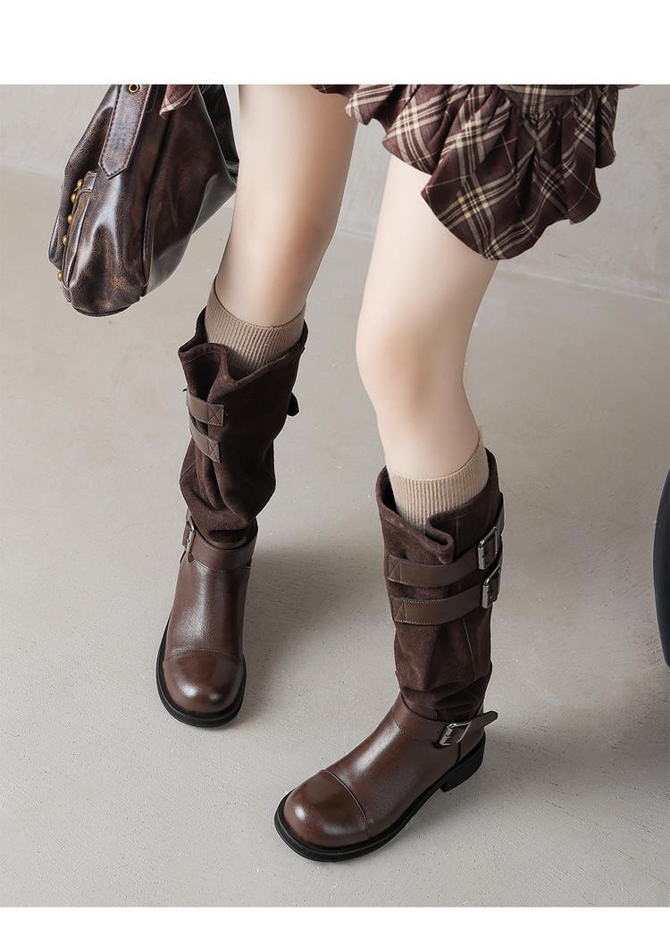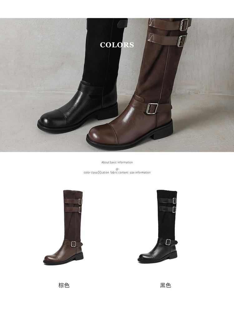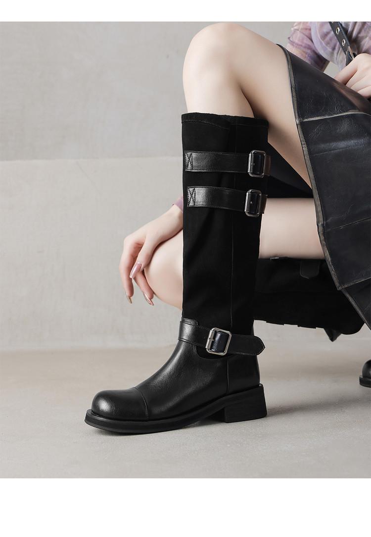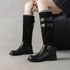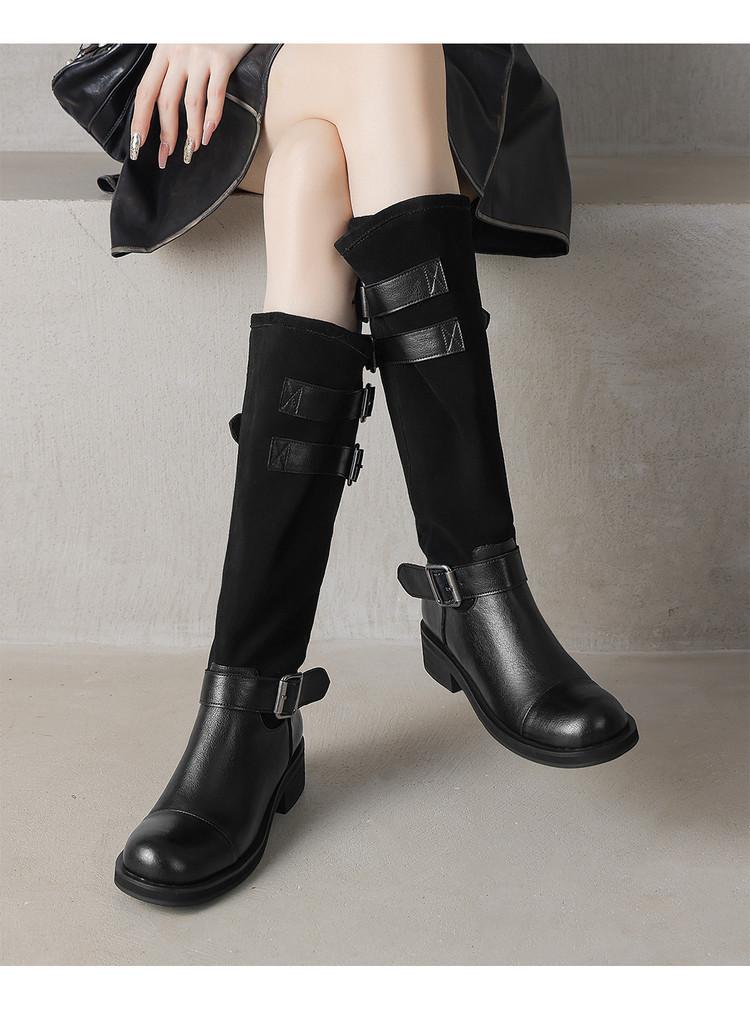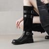 Botas de Moda de Punta Redonda y Tacón Grueso para Mujer 2025 Otoño/Invierno Nuevas Botas de Caballero con Hebilla de Tacón Plano y Tacón Medio de Piel de Vaca